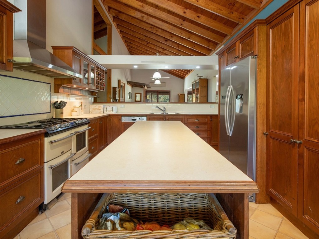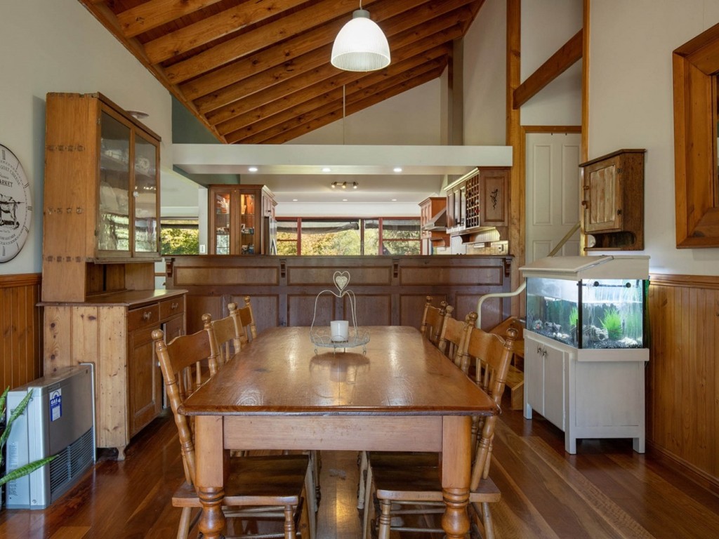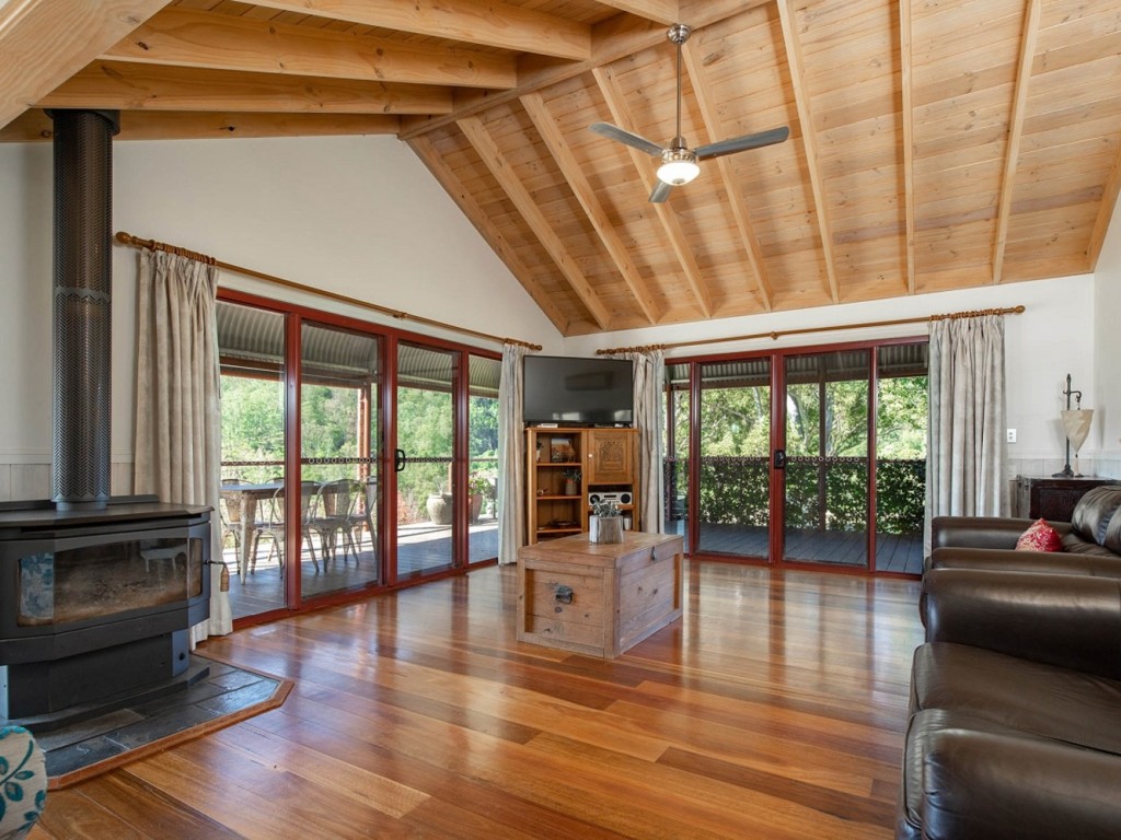 Atop the internal staircase is the heart of the home. Soaring cathedral ceilings, beautiful polished hardwood floorboards and a light-filled interior that merges the home with its stunning surroundings deliver superb living. Accessible from every room, verandahs on three sides offer plenty of year-round relaxation and alfresco dining spaces. Free-flowing living and dining areas flow to the bespoke kitchen which is an entertainer’s dream. Beautiful timber cabinetry, sweeping bench space including island bench, Agga-style range with gas cooktop and electric oven, butler’s sink, dishwasher and pull out wall pantry will bring out the master chef in every cook. The sophisticated Master suite boasts BIR, stylish ensuite and French doors to the verandah. Two further queen-size bedrooms each with BIR share a modern, centrally located family bathroom with vanity, bath, shower, and toilet. With its lovely views and dual access to the verandah, a spacious craft/games room/study is a very appealing space. Irrigation to low maintenance garden beds and manicured lawns gently rolling to a delightful rock-bordered fishpond make for lovely play spaces. Additional features include reverse-cycle air-conditioning, slow combustion heating, ceiling fans, enviro-cycle waste-management system, 30000lt rainwater tank, front gate mail delivery, and cute ranch-style tin shed with glass sliding doors to a small deck. An artist’s studio or potential self-contained B&B being possible options.