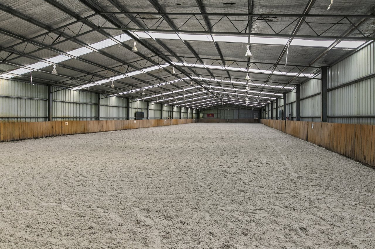 • Massive indoor arena (80m x 20m) with seating and lighting, watered Equitex geotextile surface