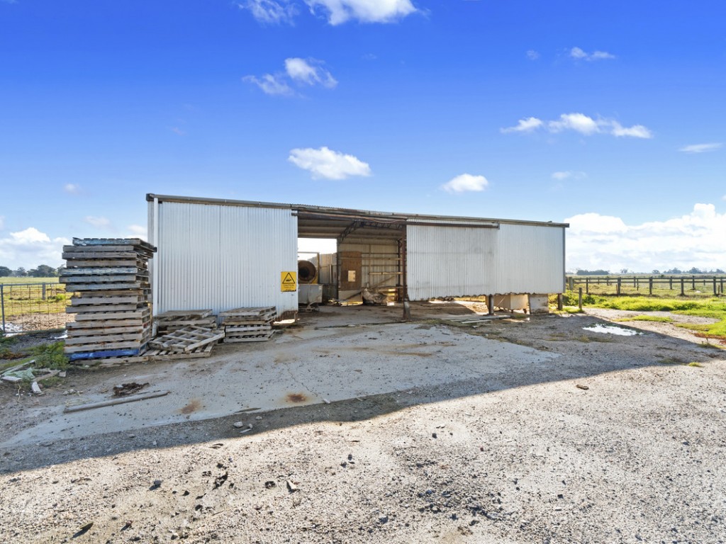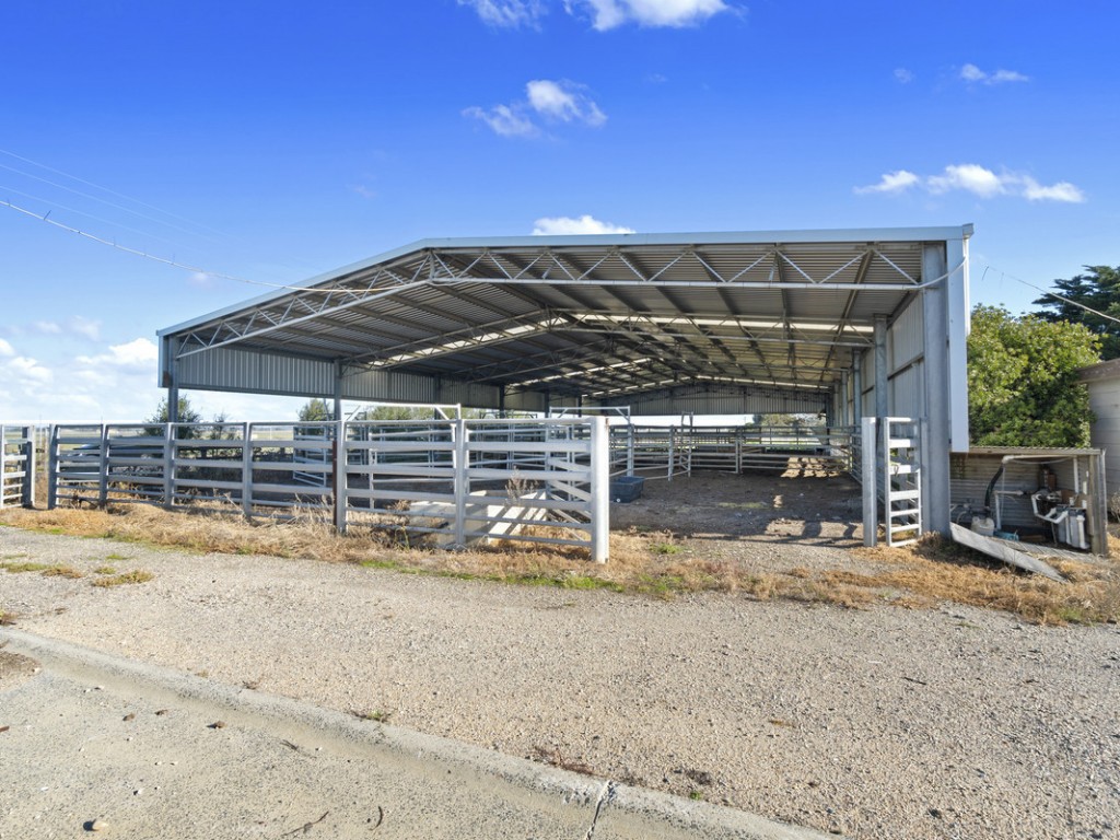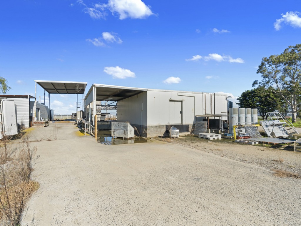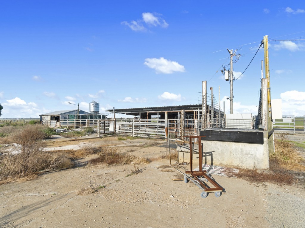 Large steel shed with internal yarding, 2 x silos, bore, effluent pump, portable offices and kitchen, various shedding including hay shed, loading race, portable yards
