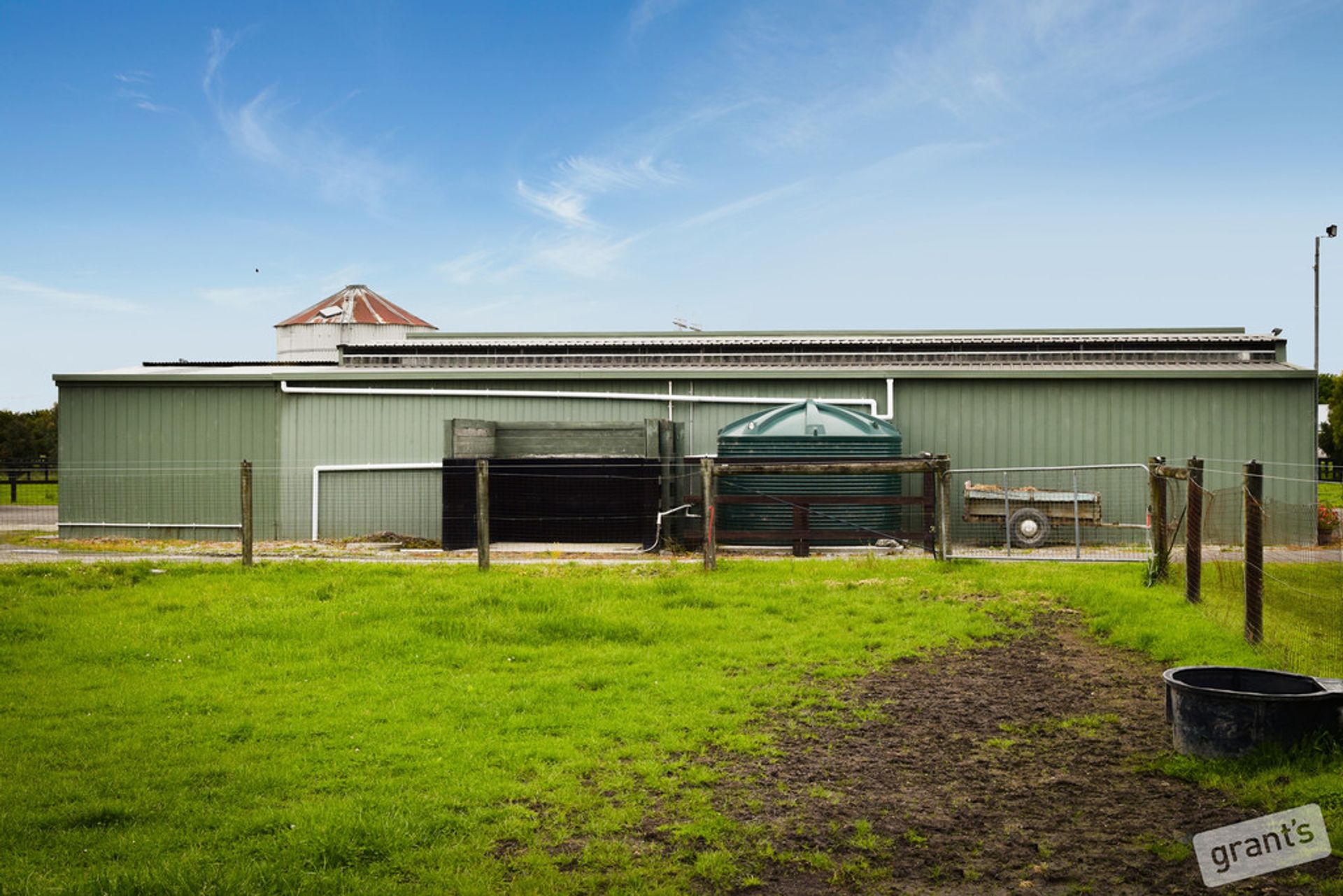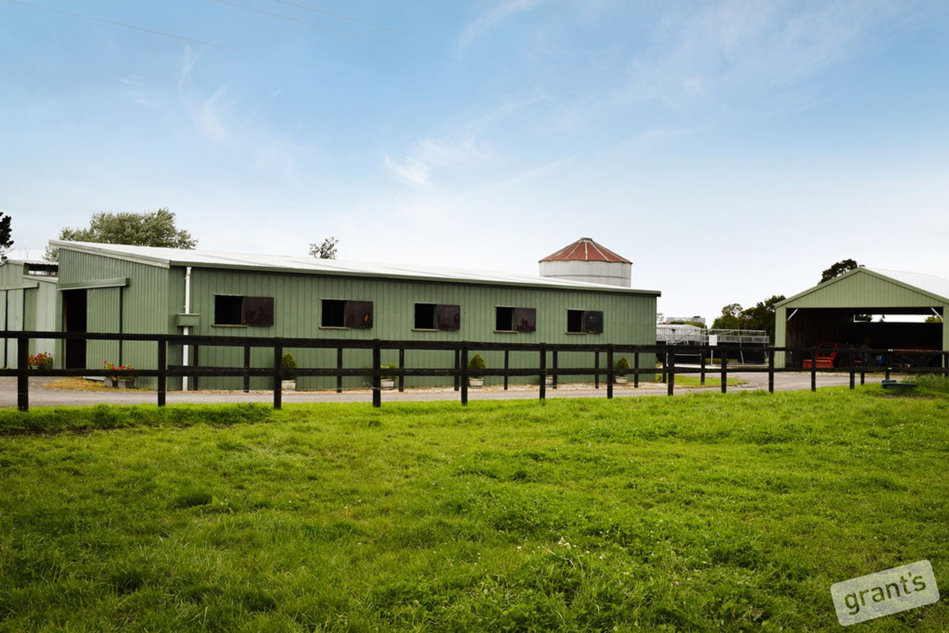 *Feed storage area with rear roller door, chaff cutter, 30 ton silo & grain crusher plus tack room with built in shelving & water for washing machine
