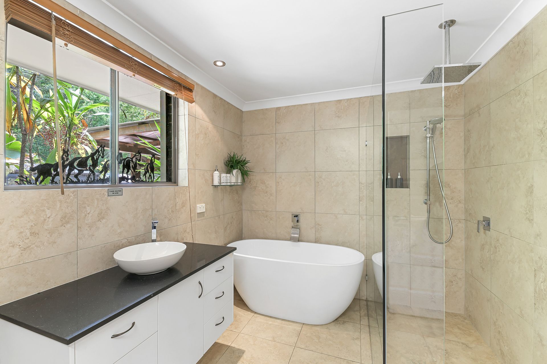 The two generous sized bedrooms are serviced by the main bathroom. This bathroom feels like a resort day spa with floor to ceiling tiles, standalone bathtub, garden views, frameless shower screens and a rain shower head.