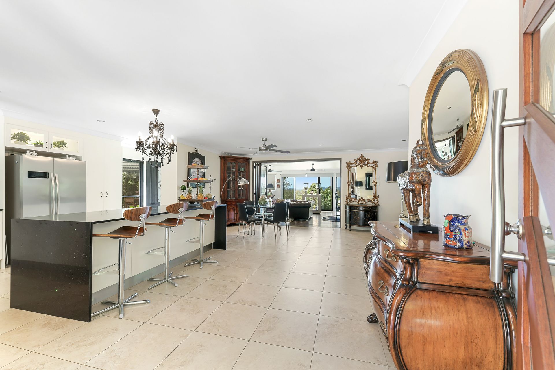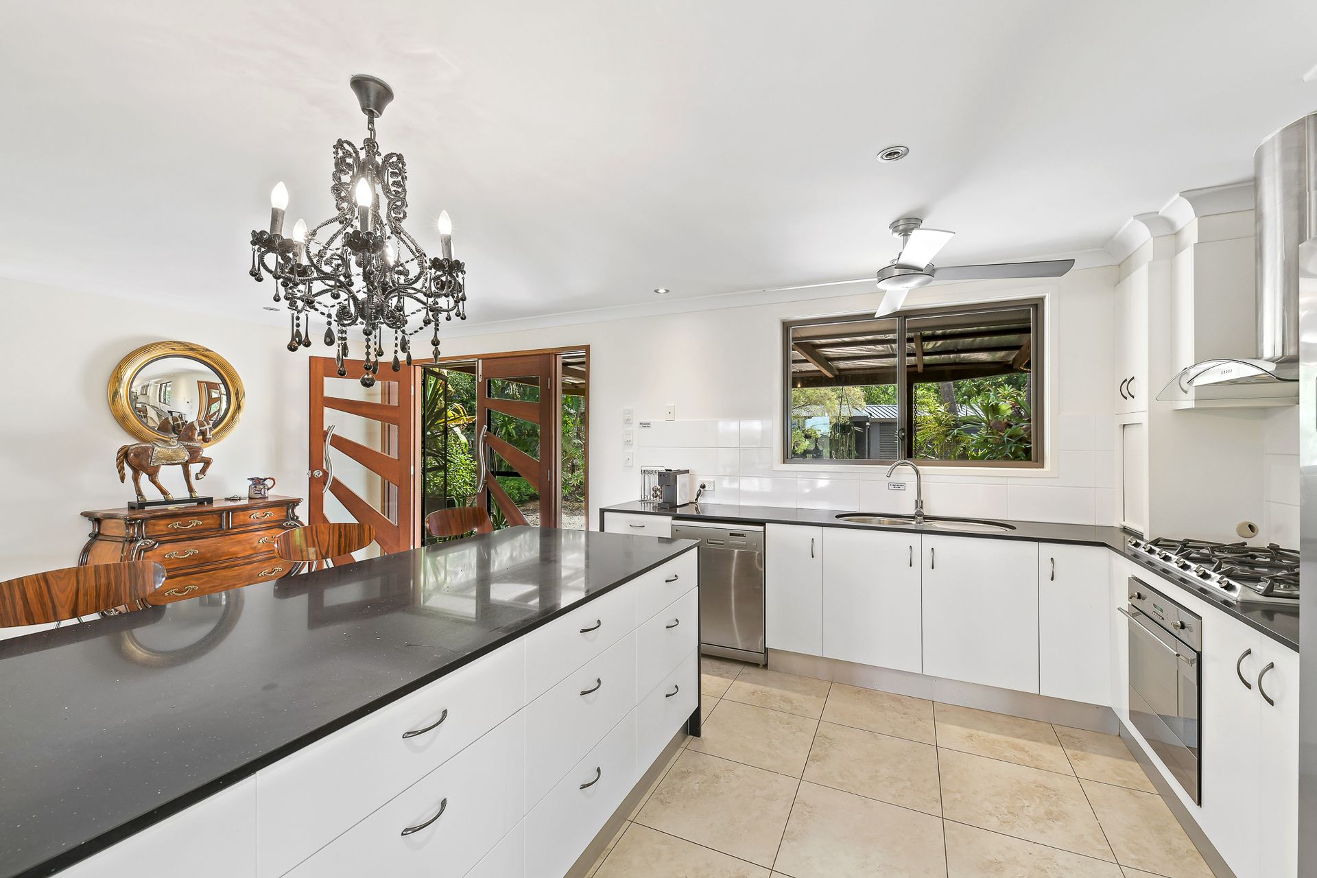 The main home has two bedrooms, separate studio or home office and one bathroom. It boasts cool neutral colours, open plan living and immaculate finishes throughout. The kitchen is a showstopper with a large island bench, walk in pantry, stone benchtops with waterfall edge, undermount sink, gas stove and its very own chandelier!