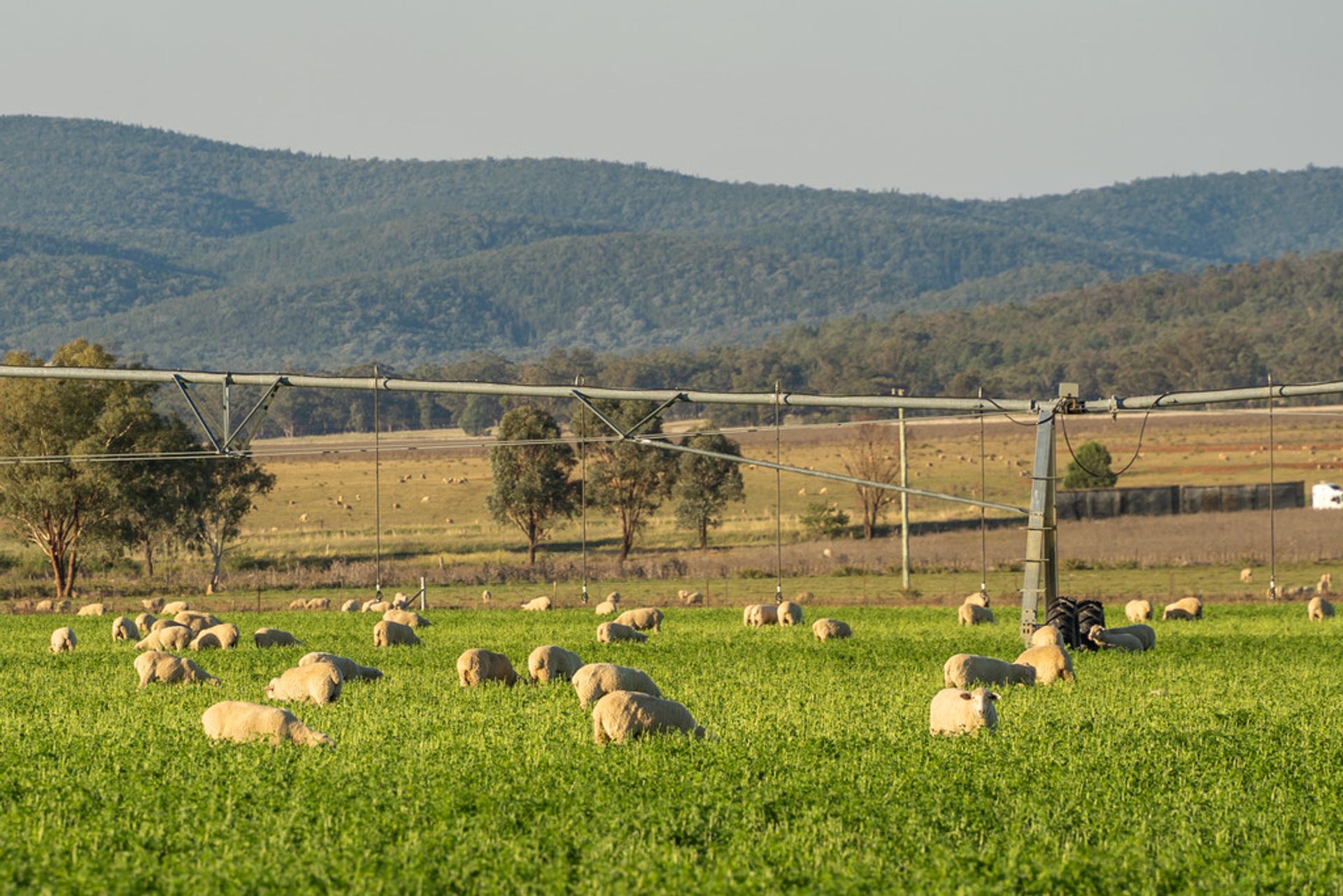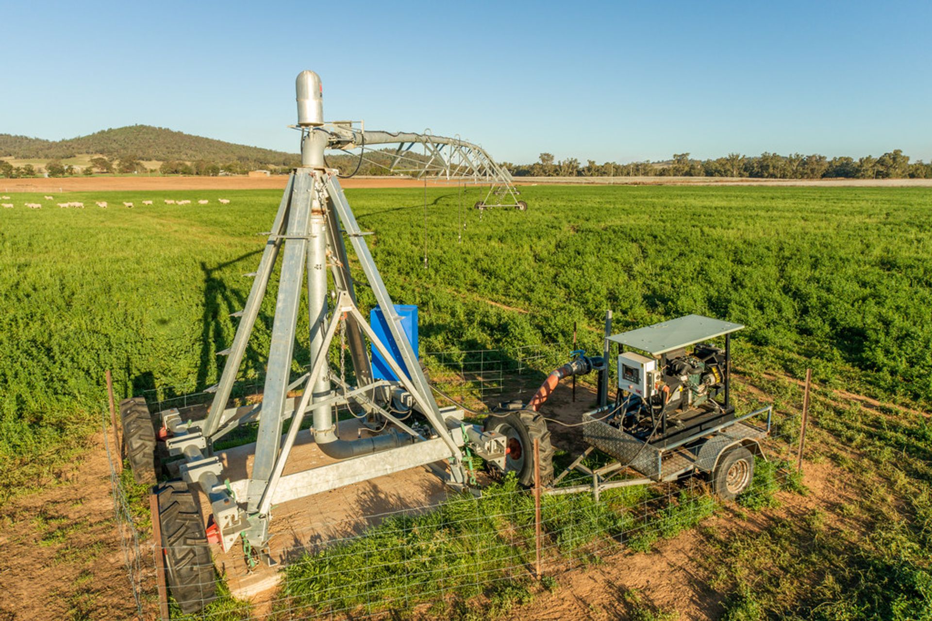 IRRIGATION: New mains and pump with 5 hydrants in place for pivots - covering an area allowing up to 250 acres to be irrigated with the existing system. Currently has 2 pivots which can be moved to each hydrant as required. 300 mgl water licence from the adjoin Lachlan River.
