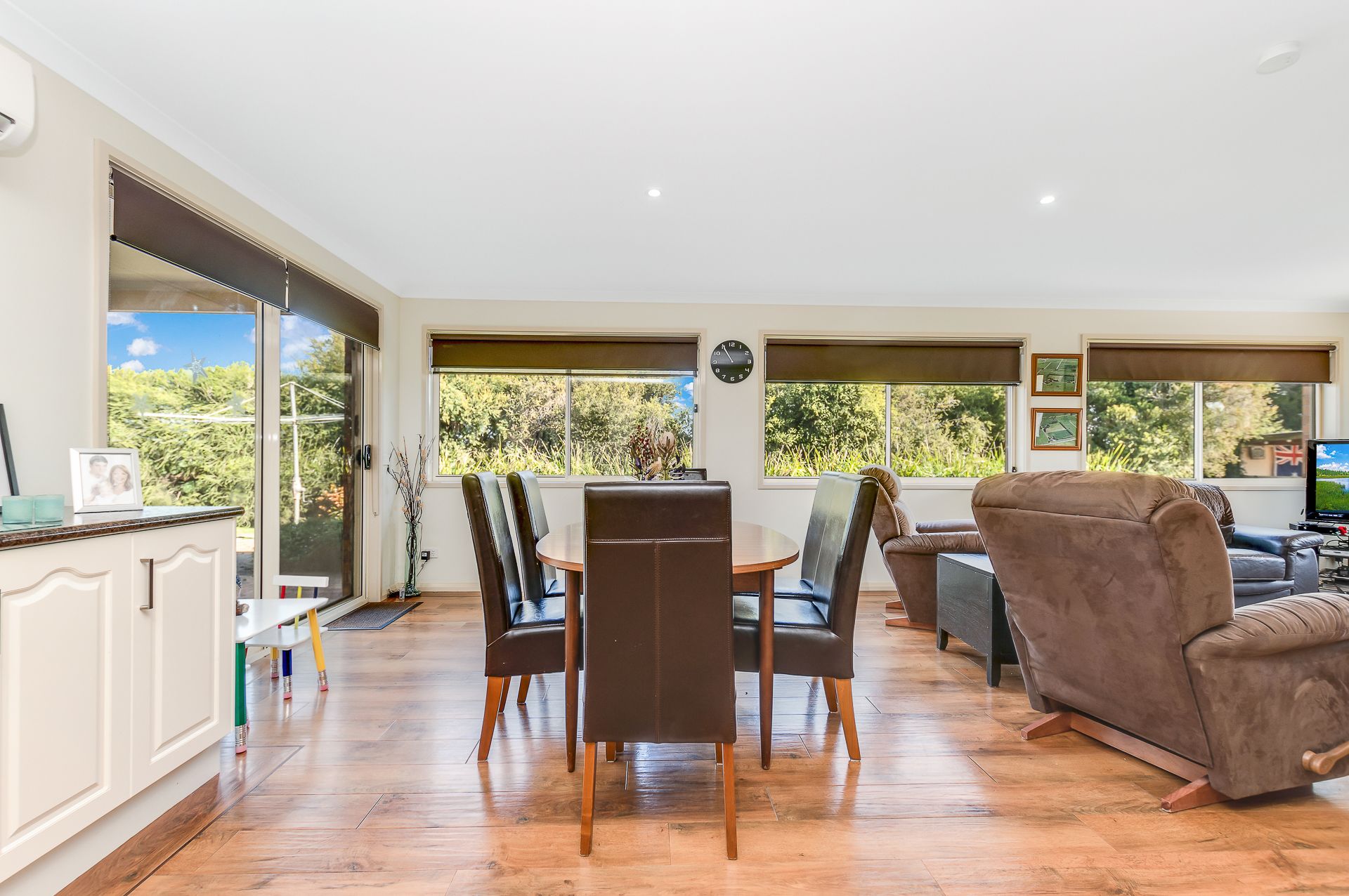 The modern style home has 3 bedrooms plus study and 2 bathrooms with 3 separate living areas, split systems, wood heating and ducted air-conditioning. The main bedroom has ensuite and WIR and all bedrooms are large and have BIRs.