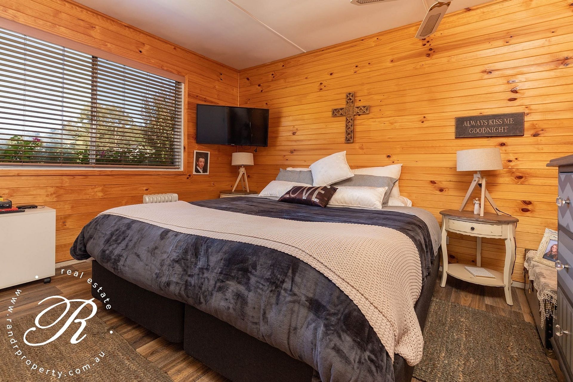 A settler’s style timber cabin, with outdoor shower, plus deck overlooking the picturesque dam also offers Airbnb income or family accommodation.