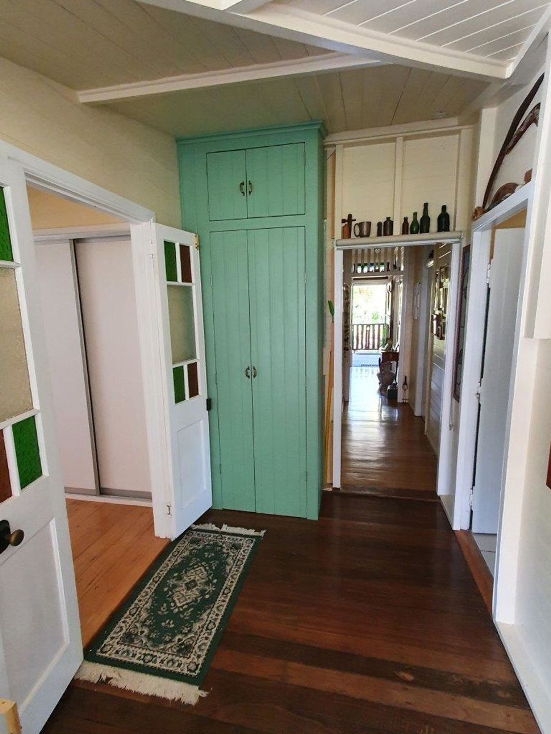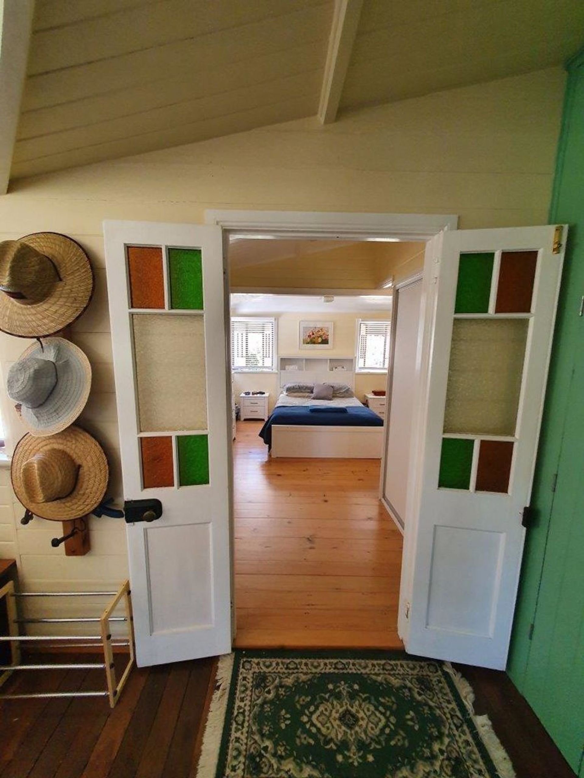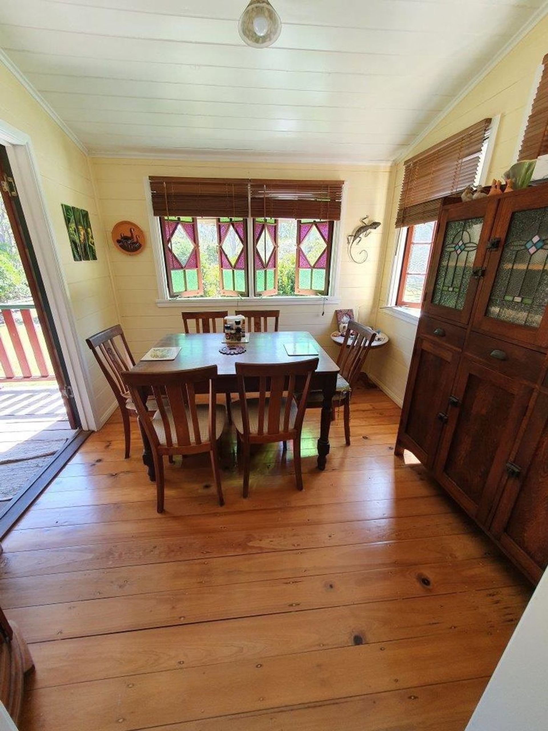Silky oak french doors, coloured glass windows and stained glass features in the entrance door.