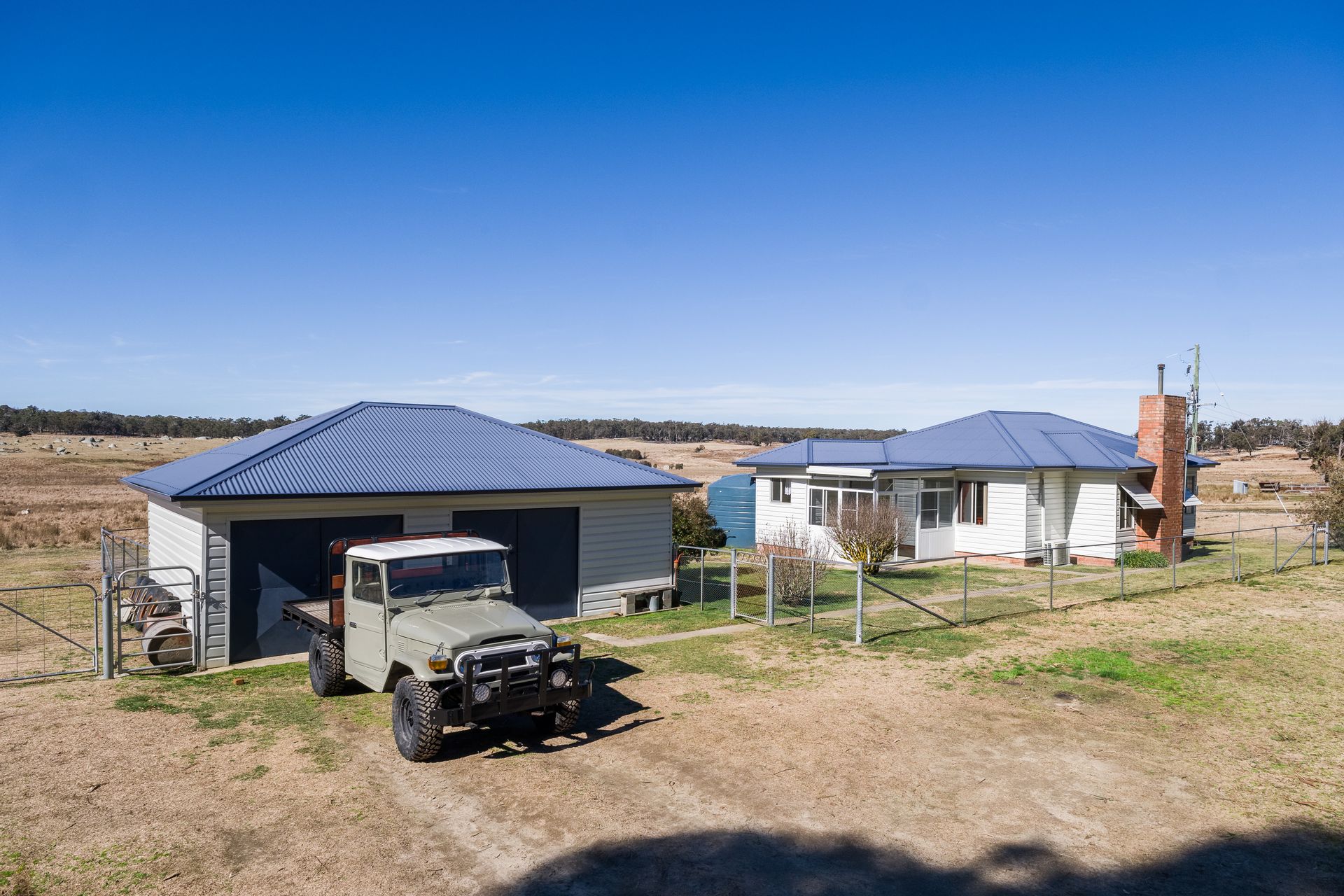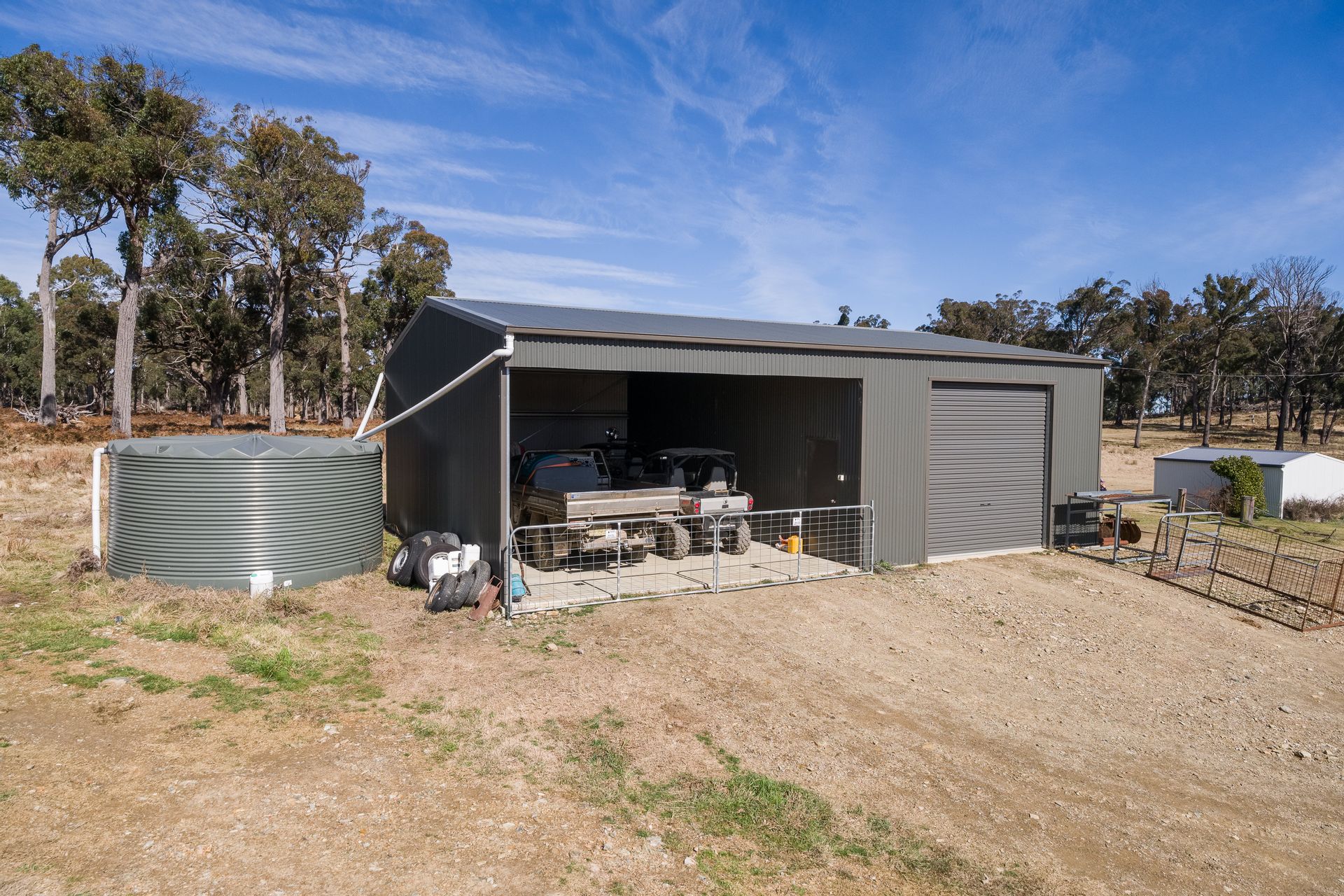 "The Tops" also boasts a new lockable, concrete floor workshop. This new steel workshop and machinery shed is constructed to the highest levels. There is also a hay shed and machinery shed situated next to the woolshed and yards.