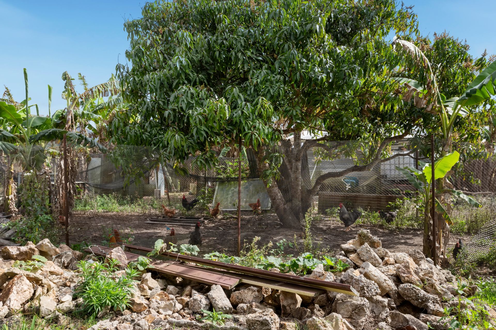 To add further support to the semi-sustainable living is a large chicken enclosure already stocked with chickens and roosters. Established fruit trees including citrus, mulberry, olive as well as banana palms and prolific pumpkins and 3 x 5,000-gallon rainwater tanks and onsite waste treatment plant.
