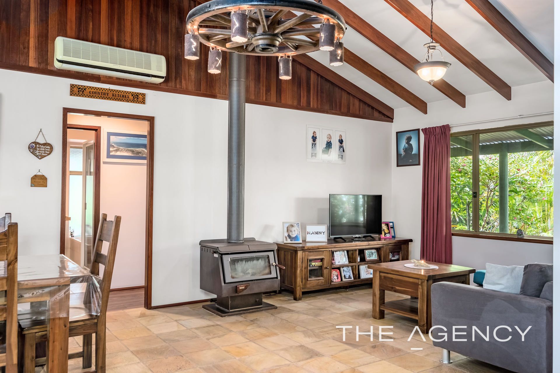The hub of the home is the open plan family and dining room which is overlooked by an attractive kitchen with gas cooktop and timber cabinetry. Soaring raked ceilings with exposed timber beams feature here and an impressive wagon wheel light fixture lends an air of rustic charm to the room. A slow combustion wood fire keeps the entire house cosy in the cooler winter months and a large reverse cycle split system air conditioning unit takes care of the summer heat. A glass sliding door from the family room provides direct access out to the front verandah and the adjacent gabled al fresco entertaining area. This is a great spot to sit and relax whilst family and friends take advantage of the sparkling pool in summer or just to enjoy the outlook over the pretty gardens and lawns. The rear patio provides another option for outdoor entertaining and has been fully enclosed to create a delightful shade house with an array of gorgeous shade loving plants.