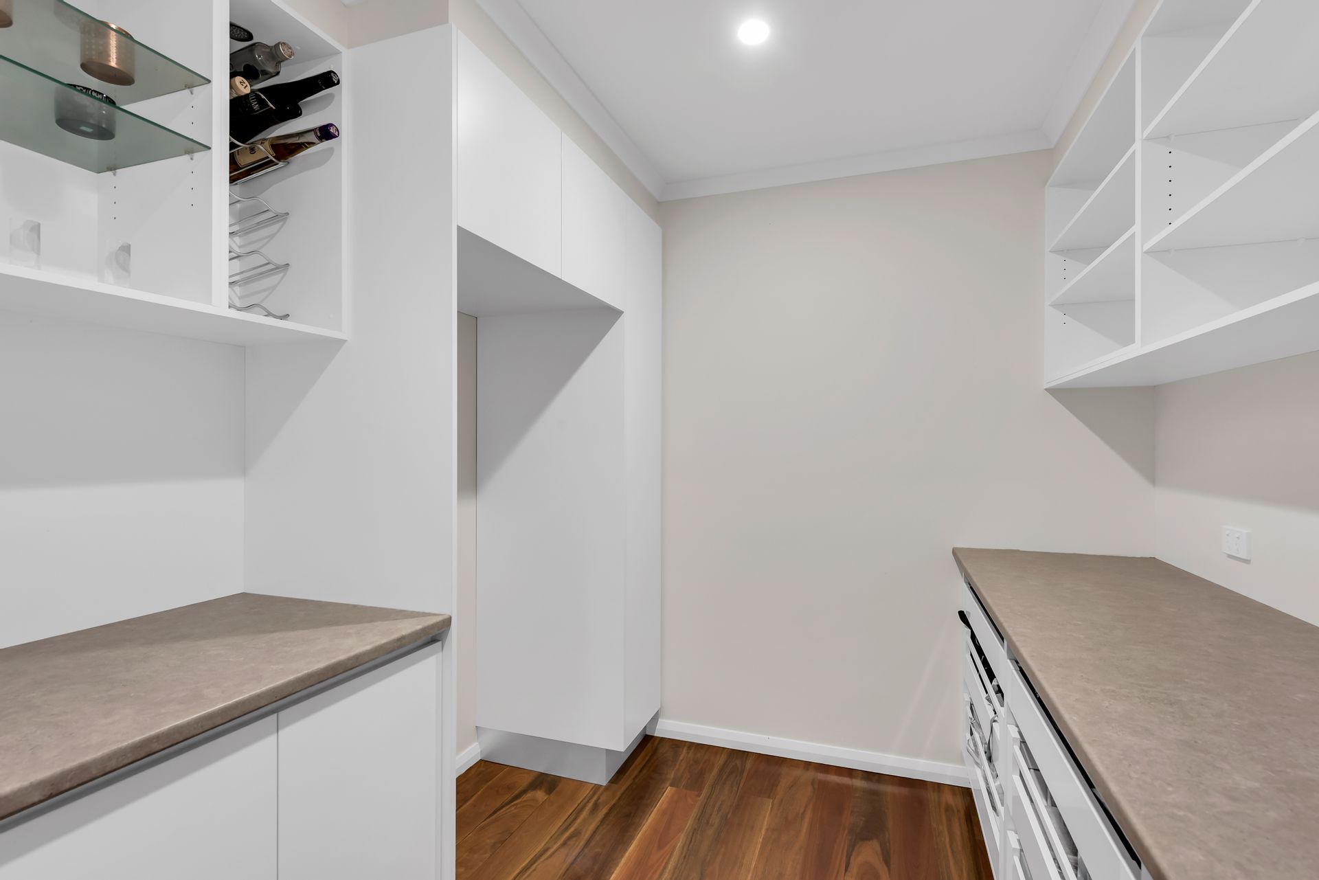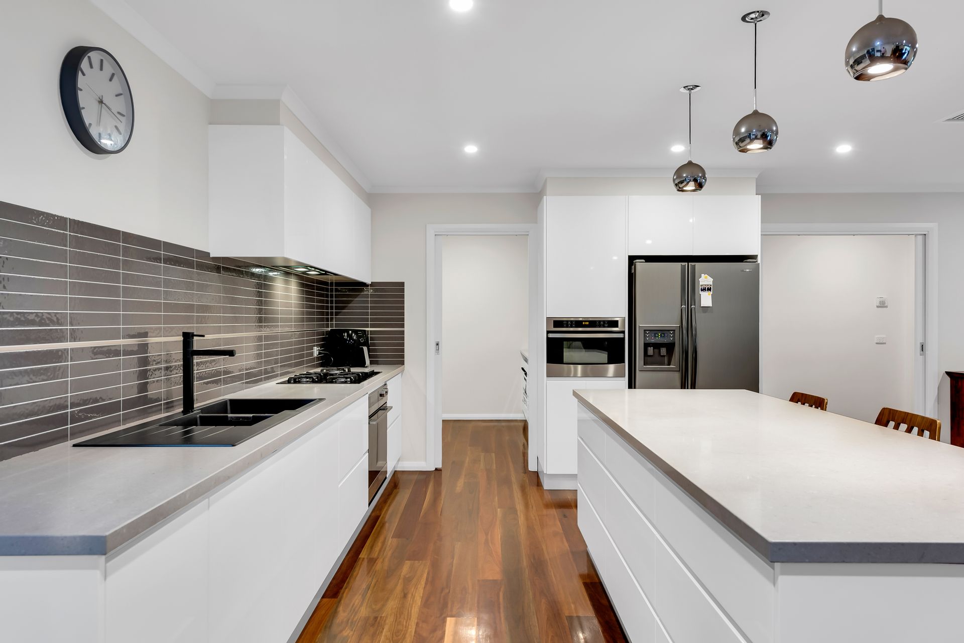Fitted with quality from top to bottom, be immediately impressed by the Queensland spotted gum timber floors, accentuated by LED downlights and natural sunlight. The open-plan kitchen is fitted for any home-chef. Complete with stone bench tops, island bench, integrated appliances, matte black double sink, soft closing drawers, and a pantry that any butler would be satisfied with.