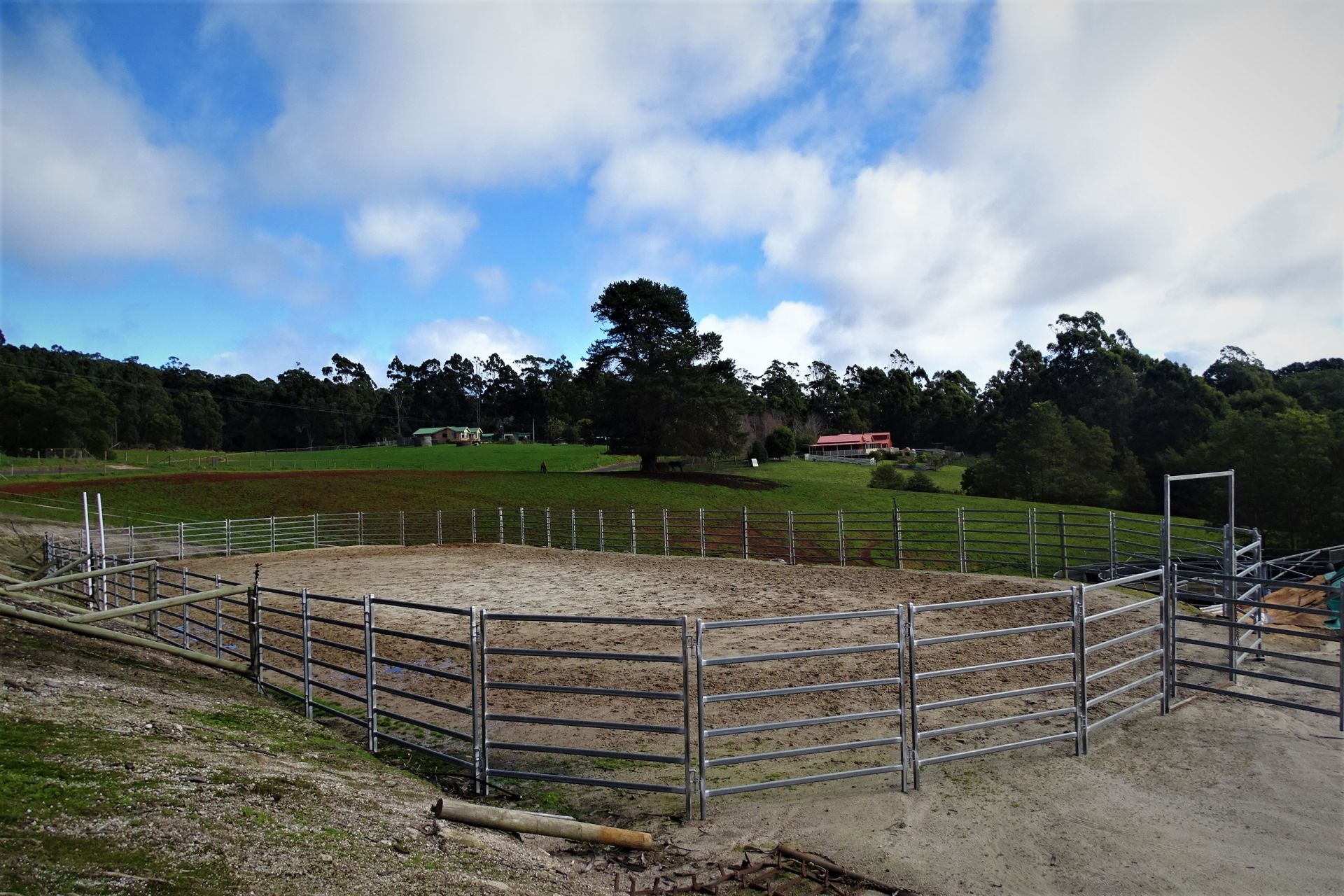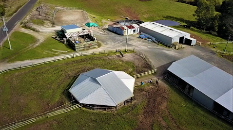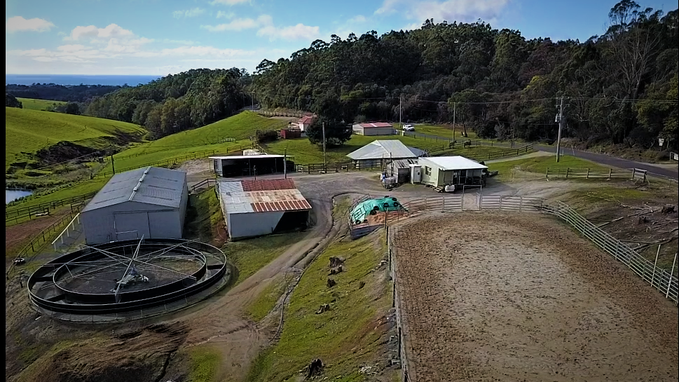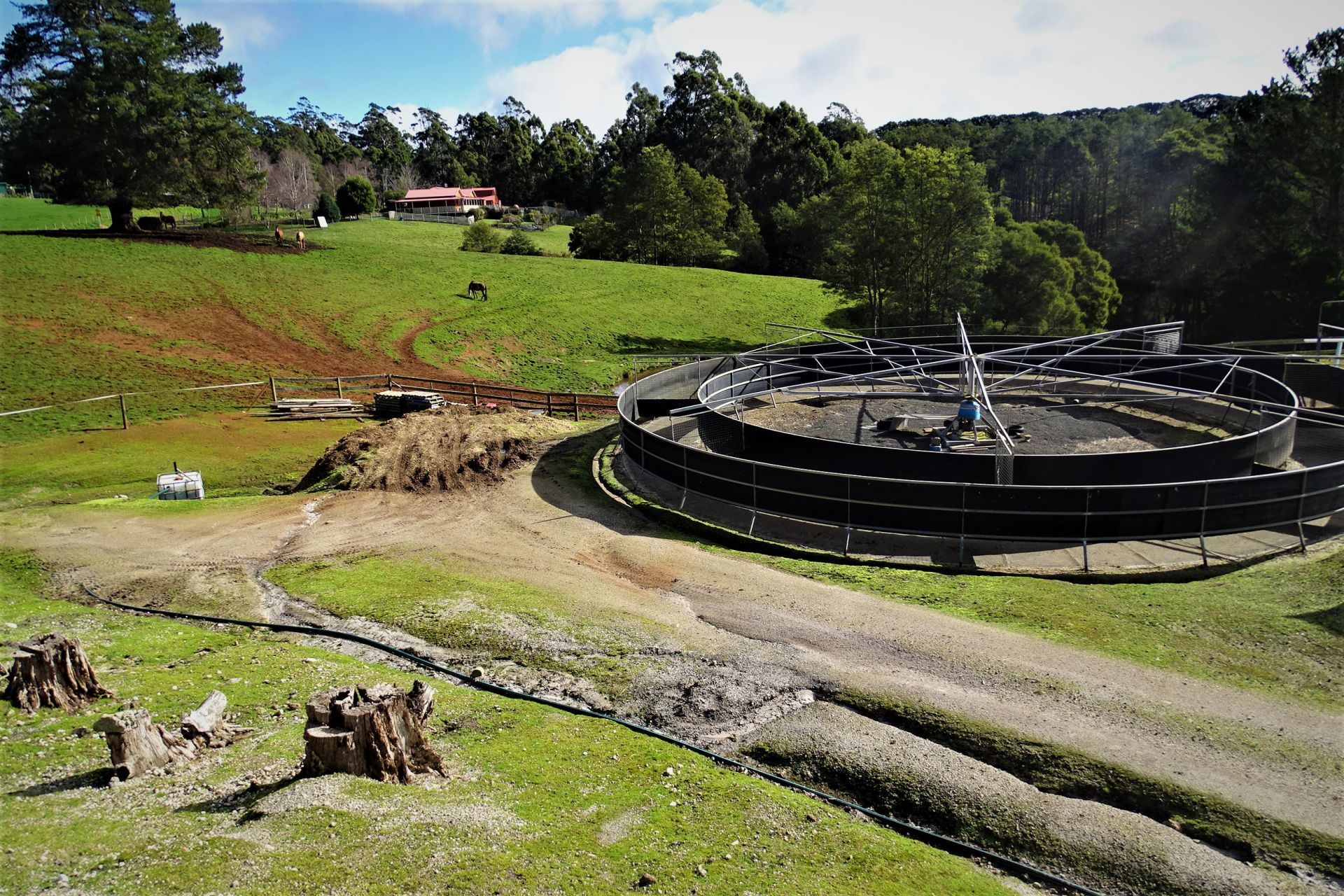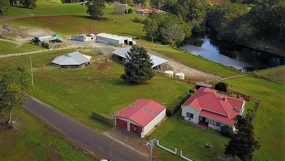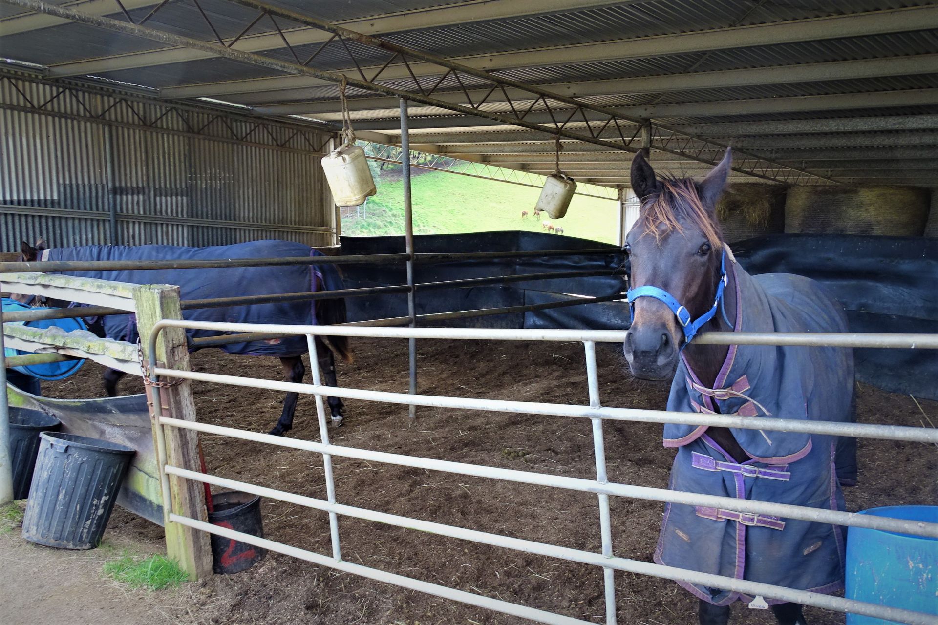 all weather arena, A horse swimming dam, an automatic 8 horse walker, 16 under cover stables, tie up stalls, an undercover round yard and electric fencing all-round plus other buildings/sheds for storage and equipment.