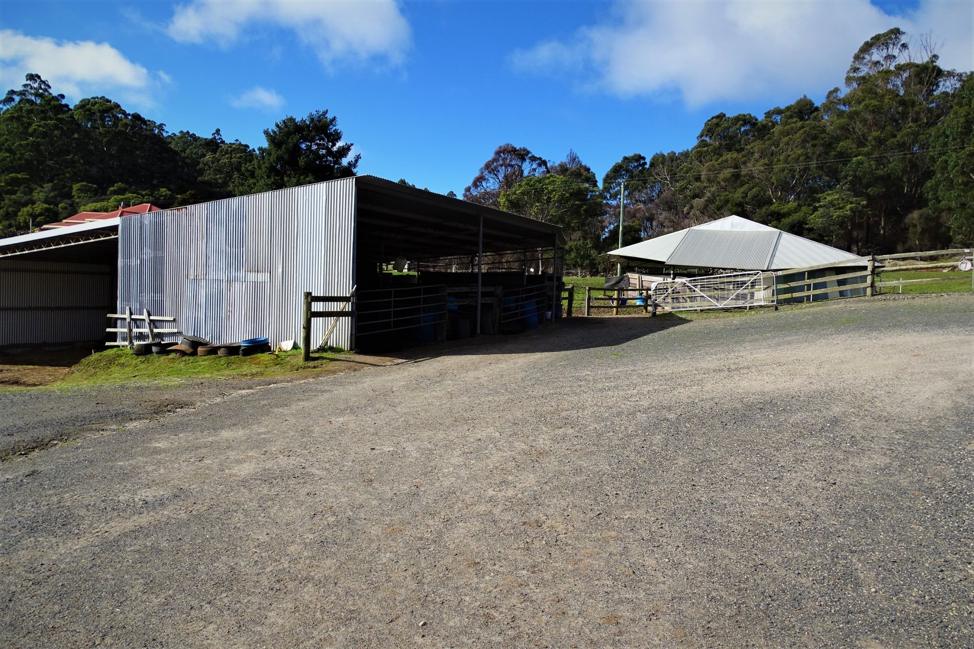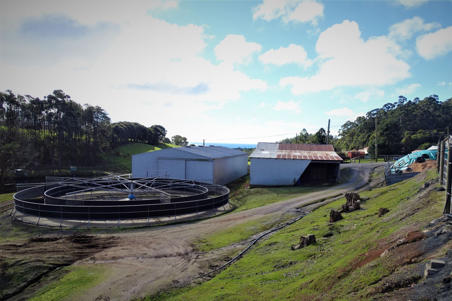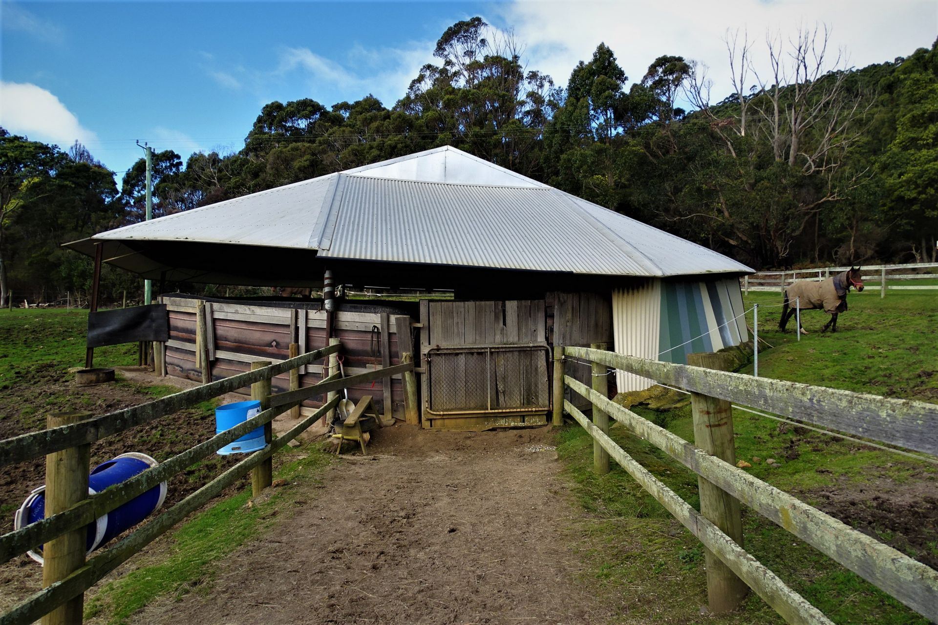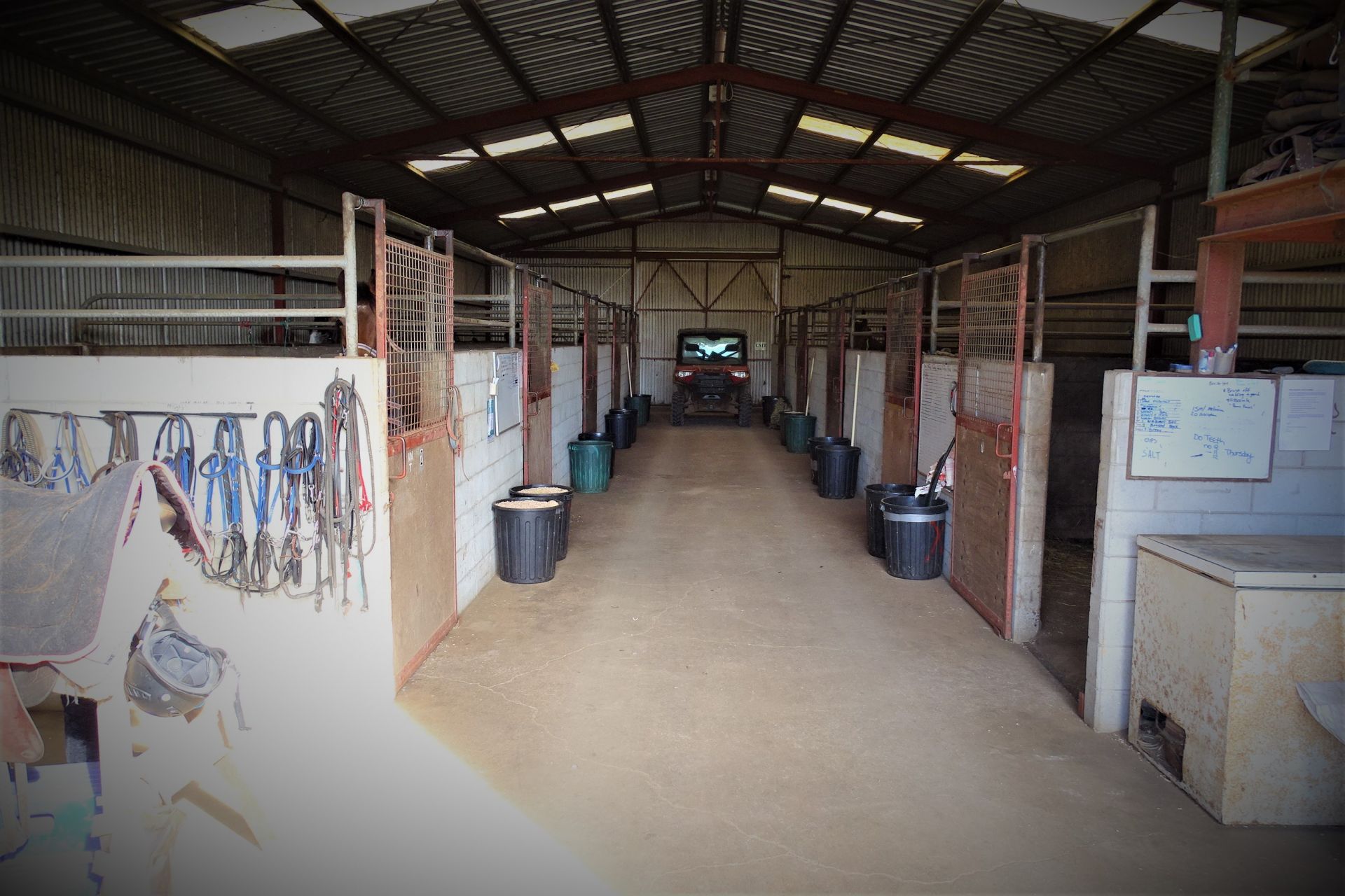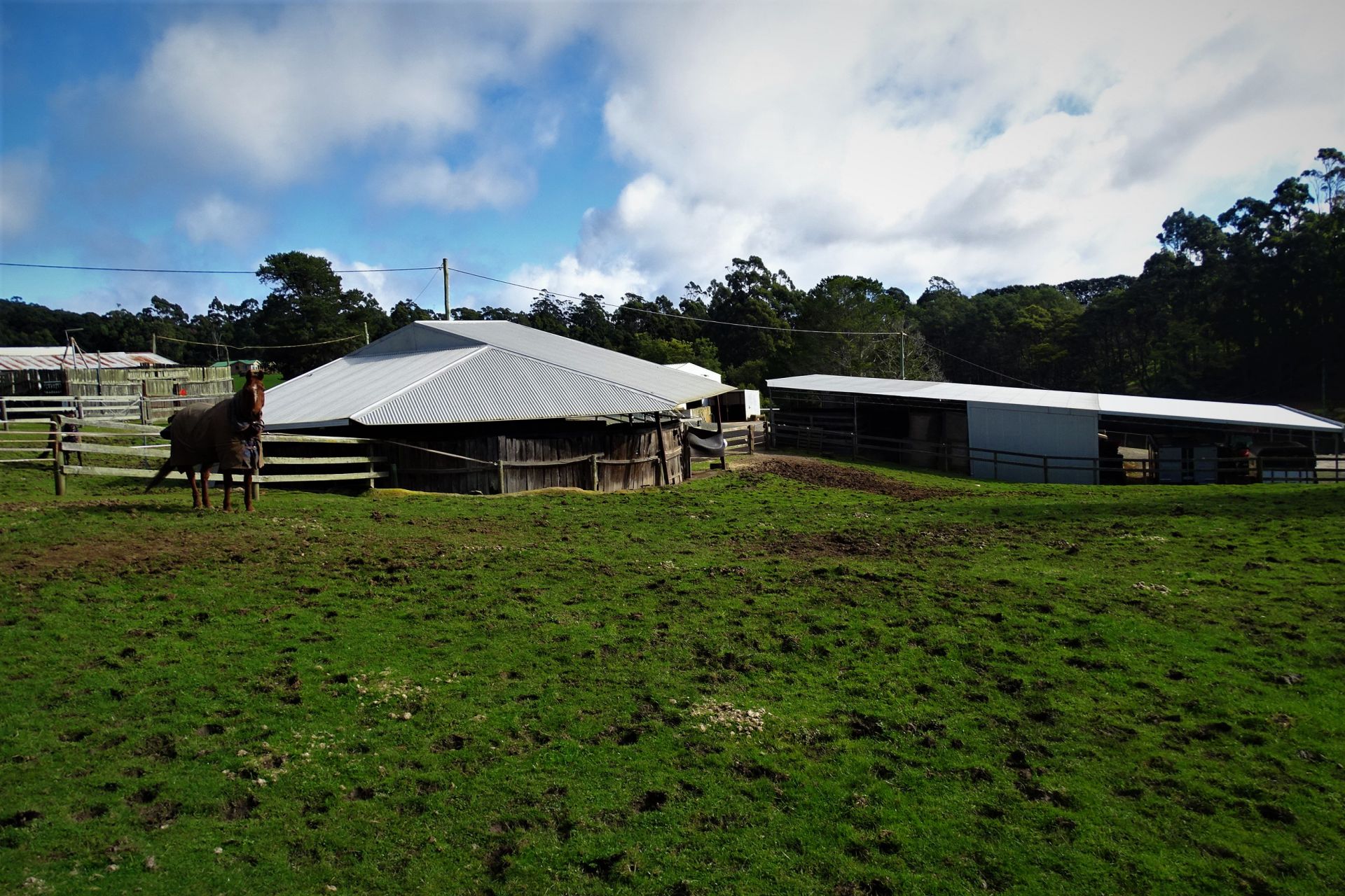all weather arena, A horse swimming dam, an automatic 8 horse walker, 16 under cover stables, tie up stalls, an undercover round yard and electric fencing all-round plus other buildings/sheds for storage and equipment.