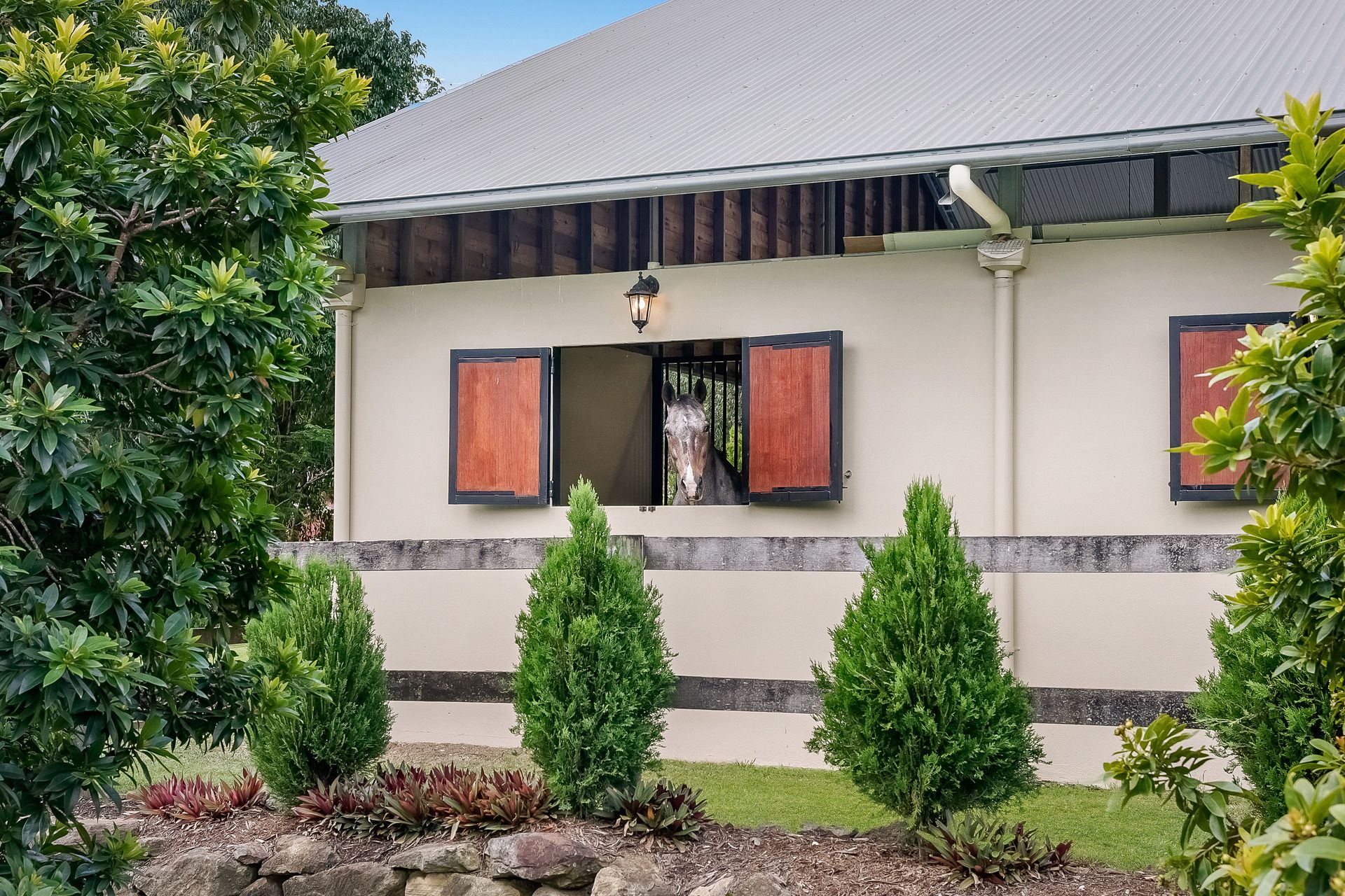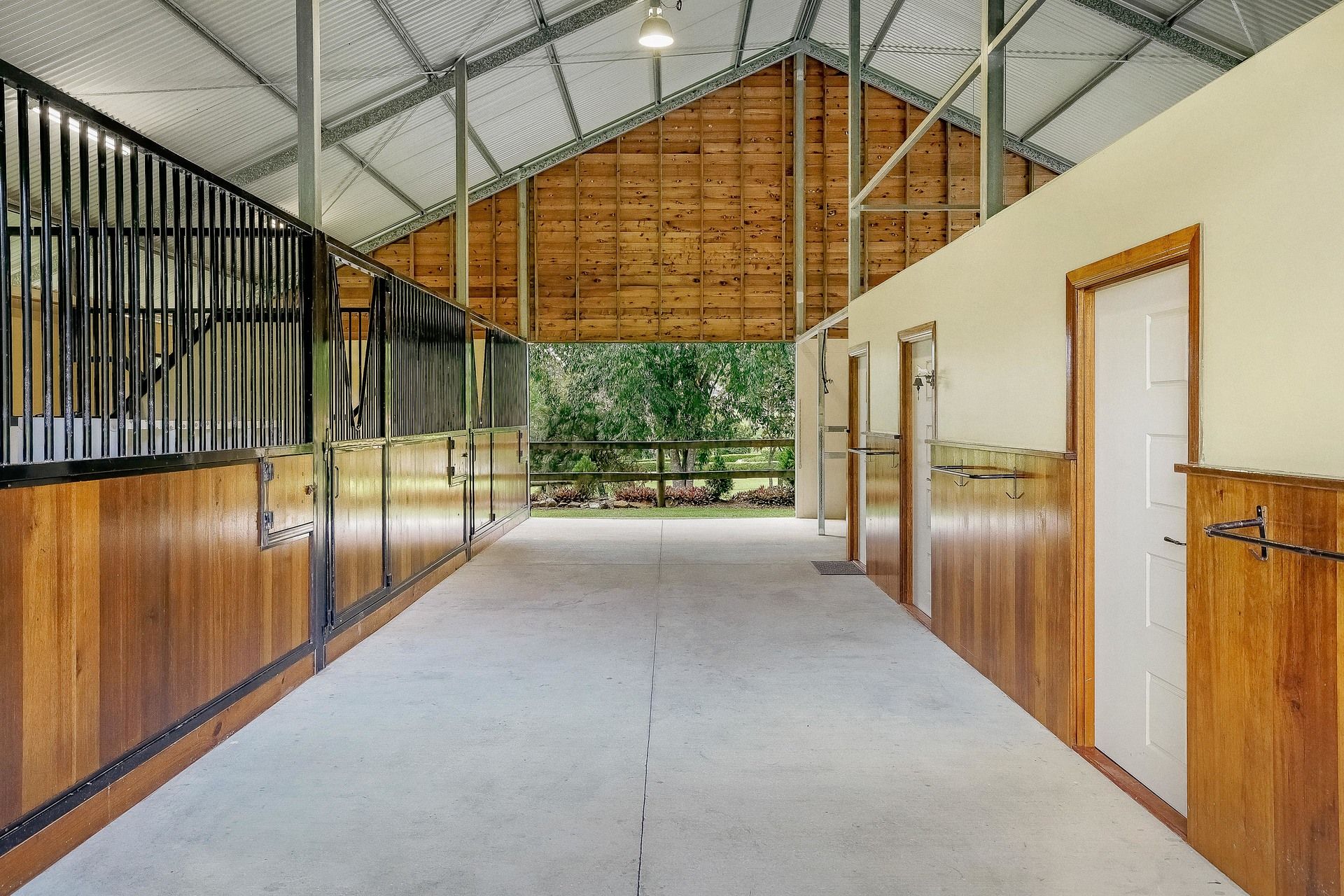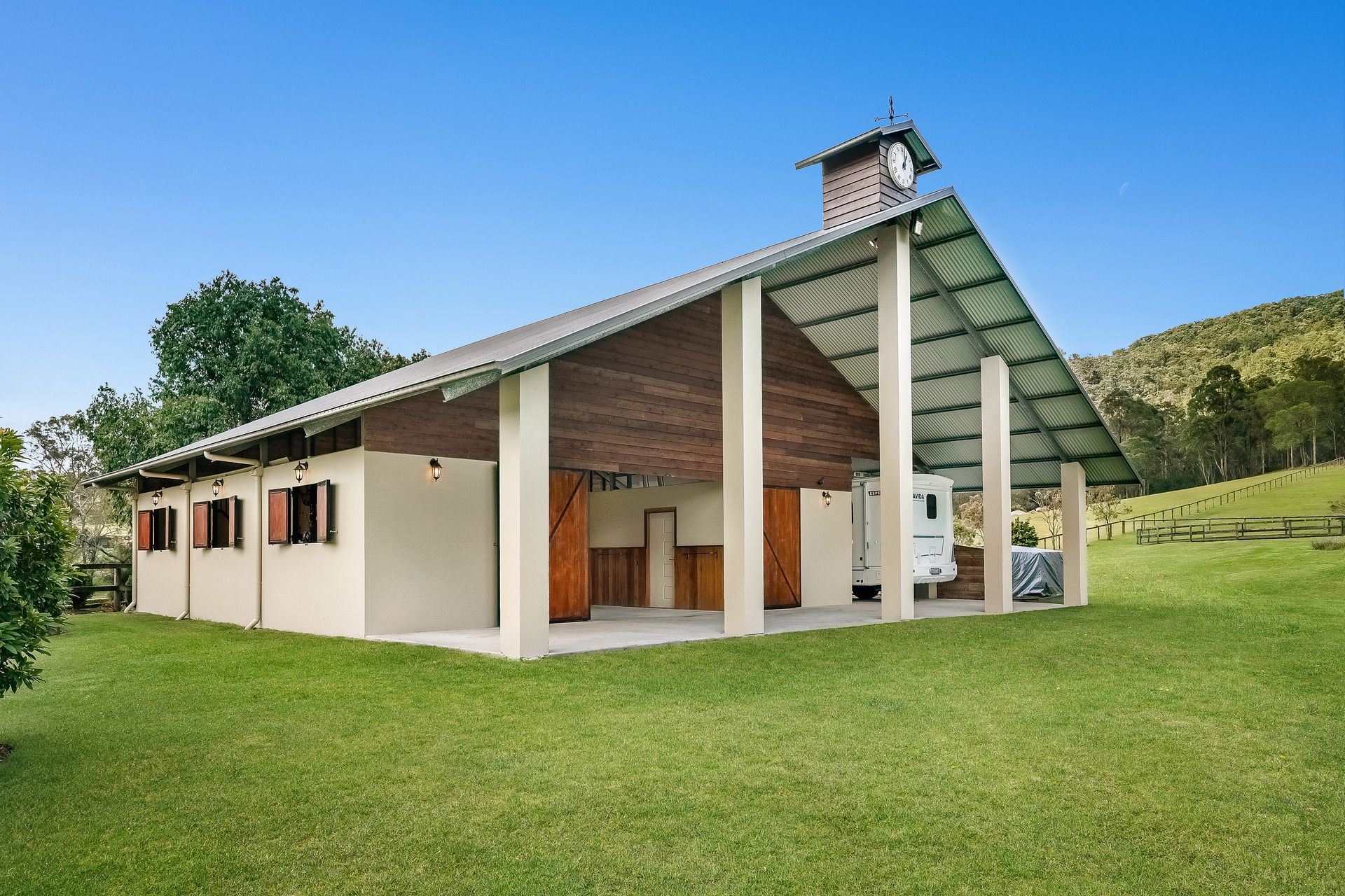 Architecturally designed 254m2 equestrian barn with clock tower, 3 stables, mezzanine floor, bathroom, feed and tack rooms, hot water wash bay and sawdust bay. High clearance and covered float/car/caravan/truck parking bay adjoins stable.
