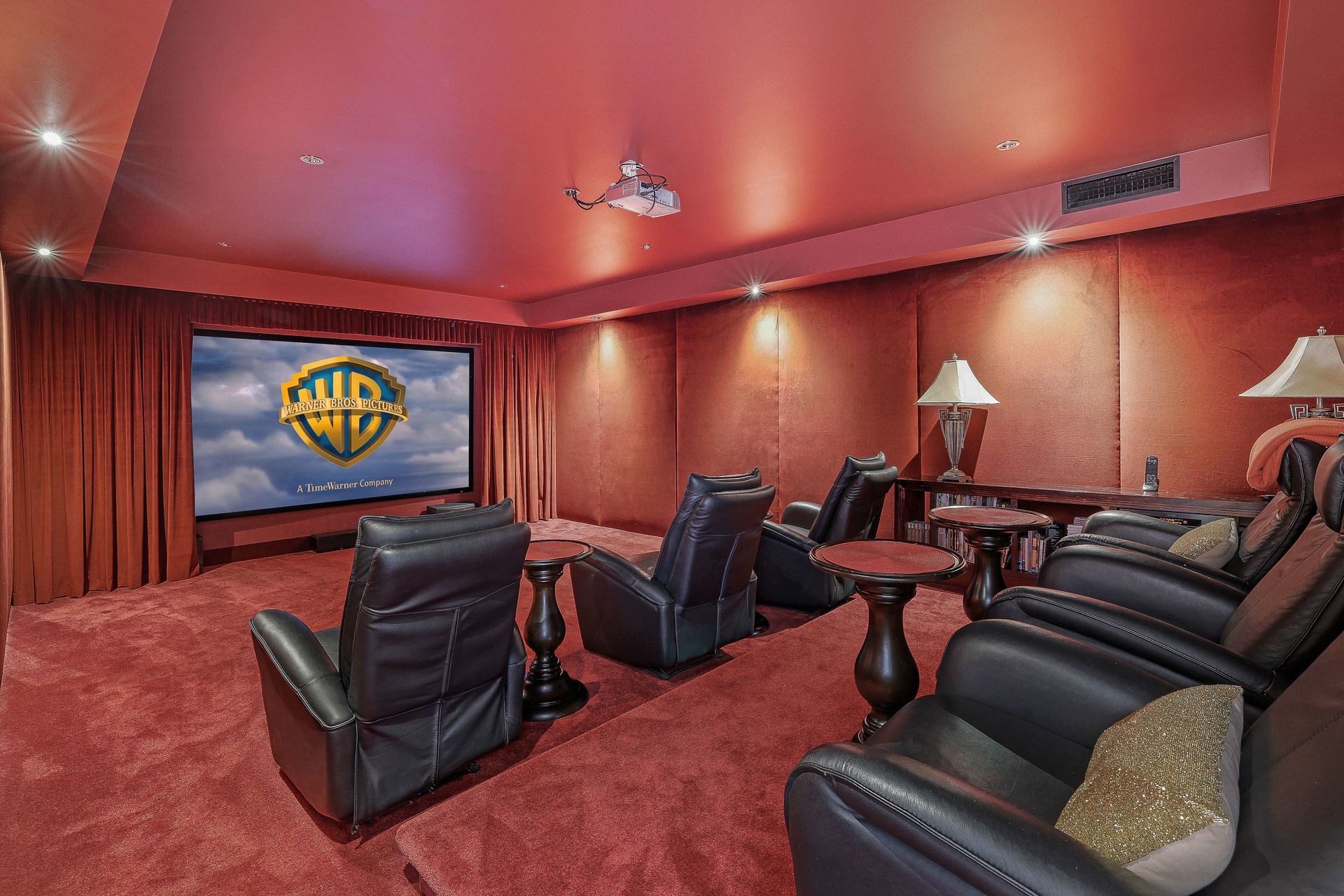 - Soundproof, velvet-lined cinema with projector, large screen, tiered seating and electric recliners;