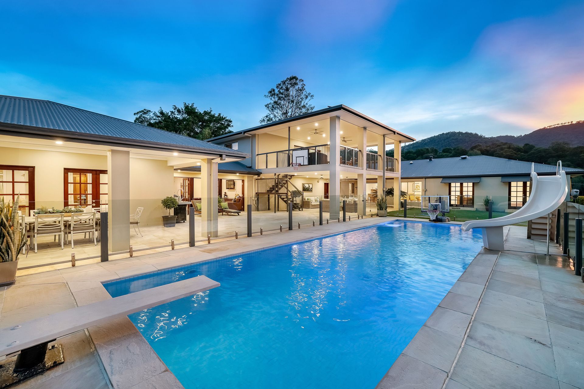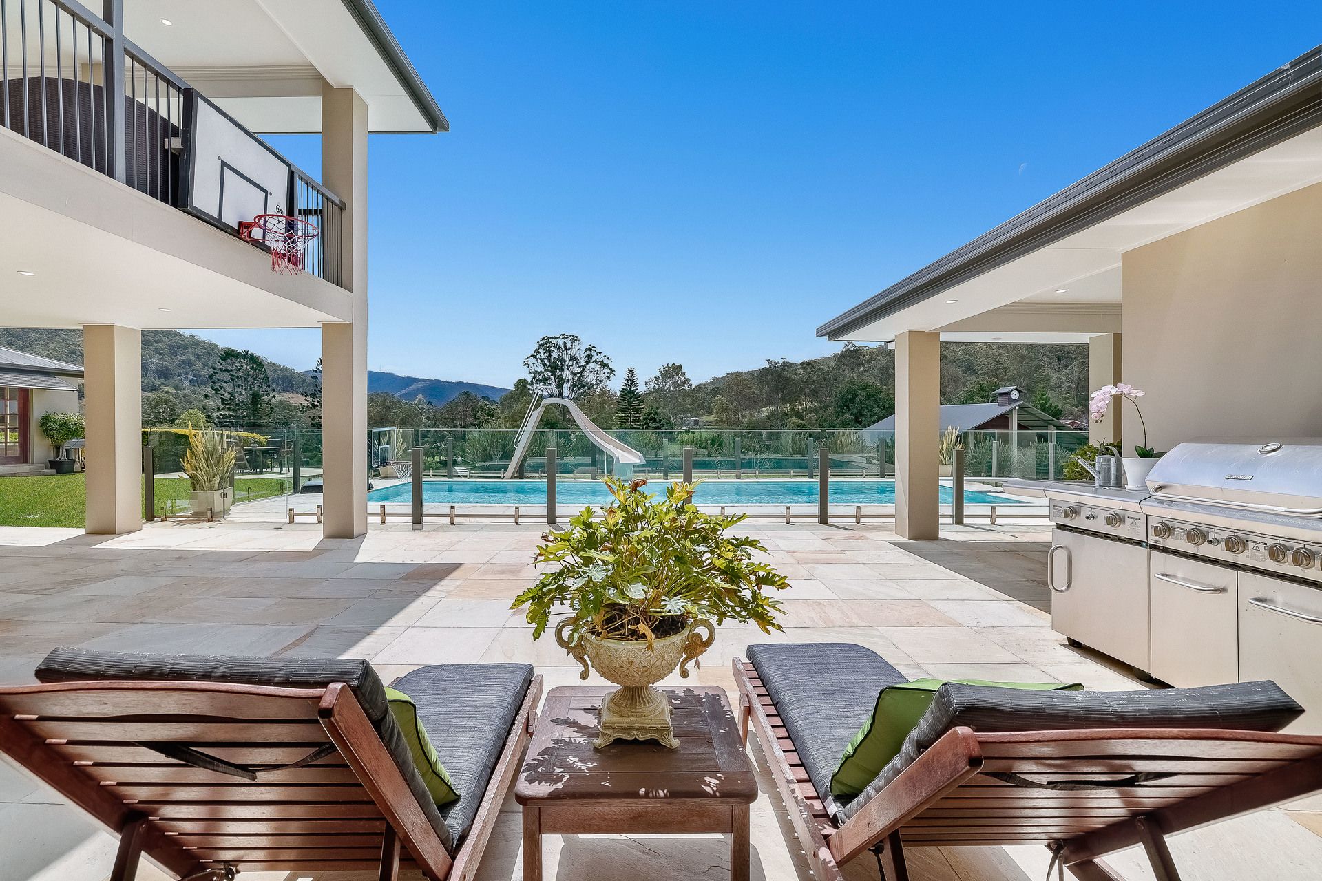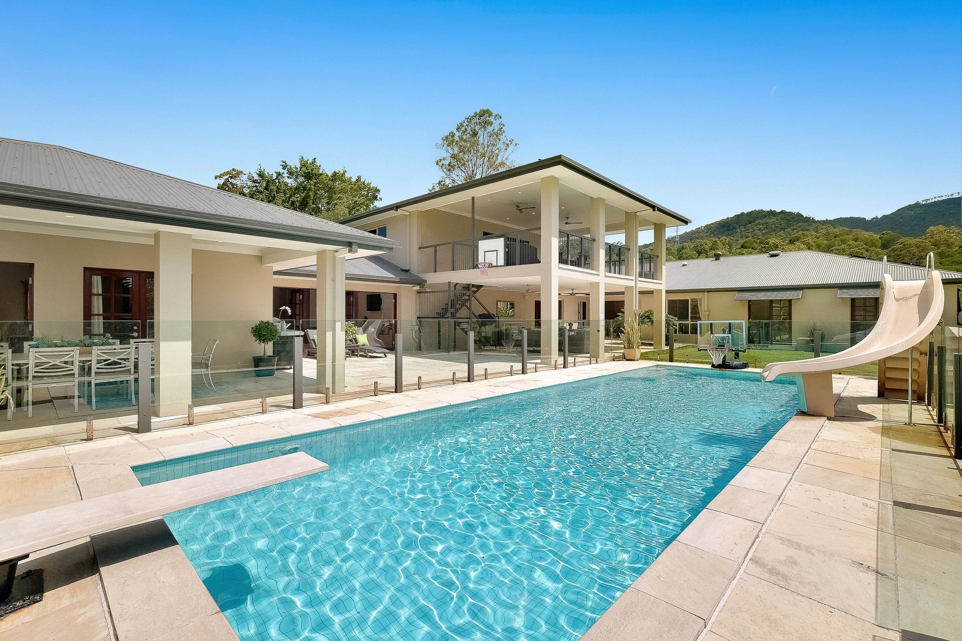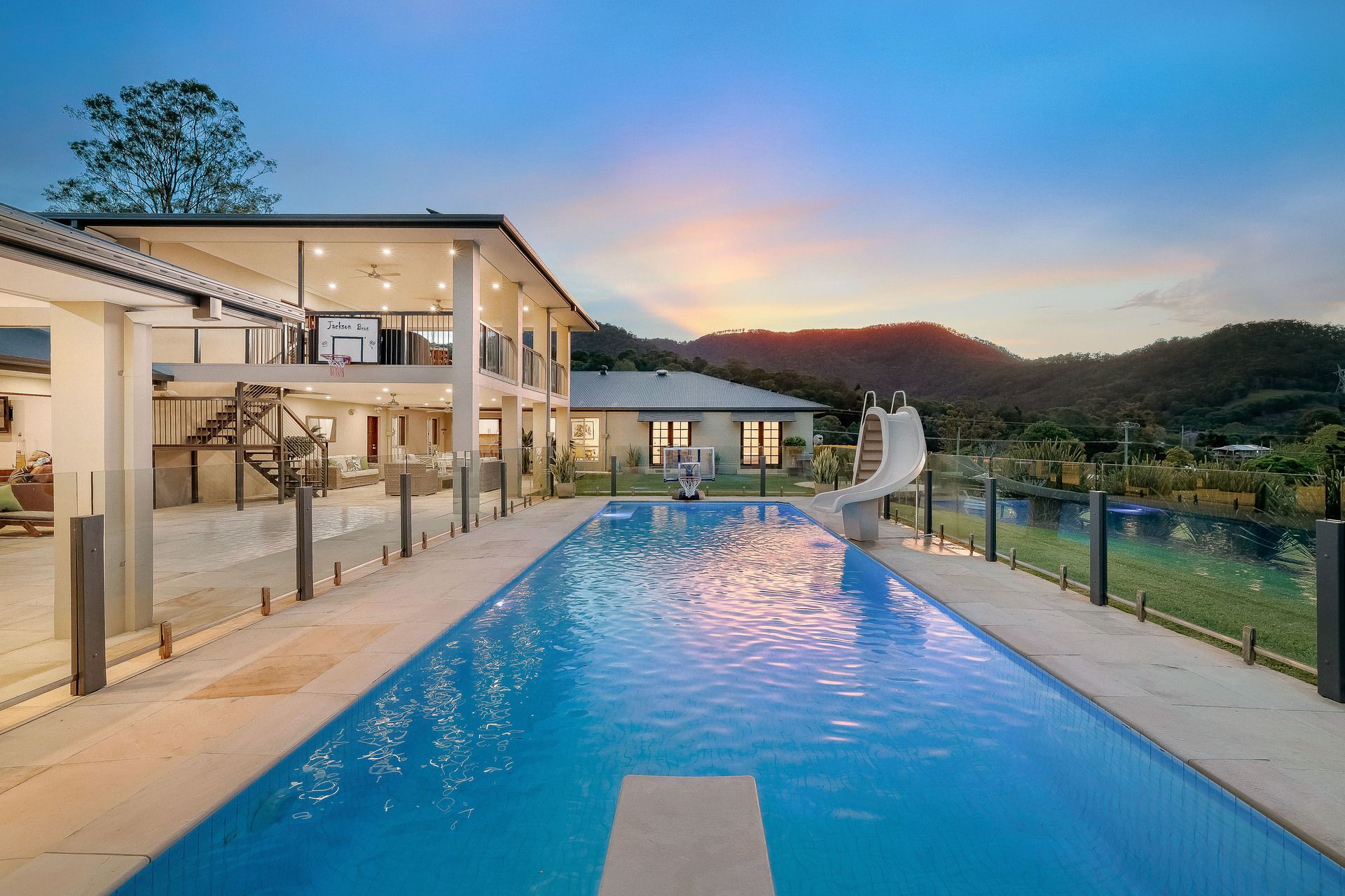 - Sandstone outdoor entertaining terrace plus large gas heated saltwater pool with springboard, waterslide and multi-coloured lights;