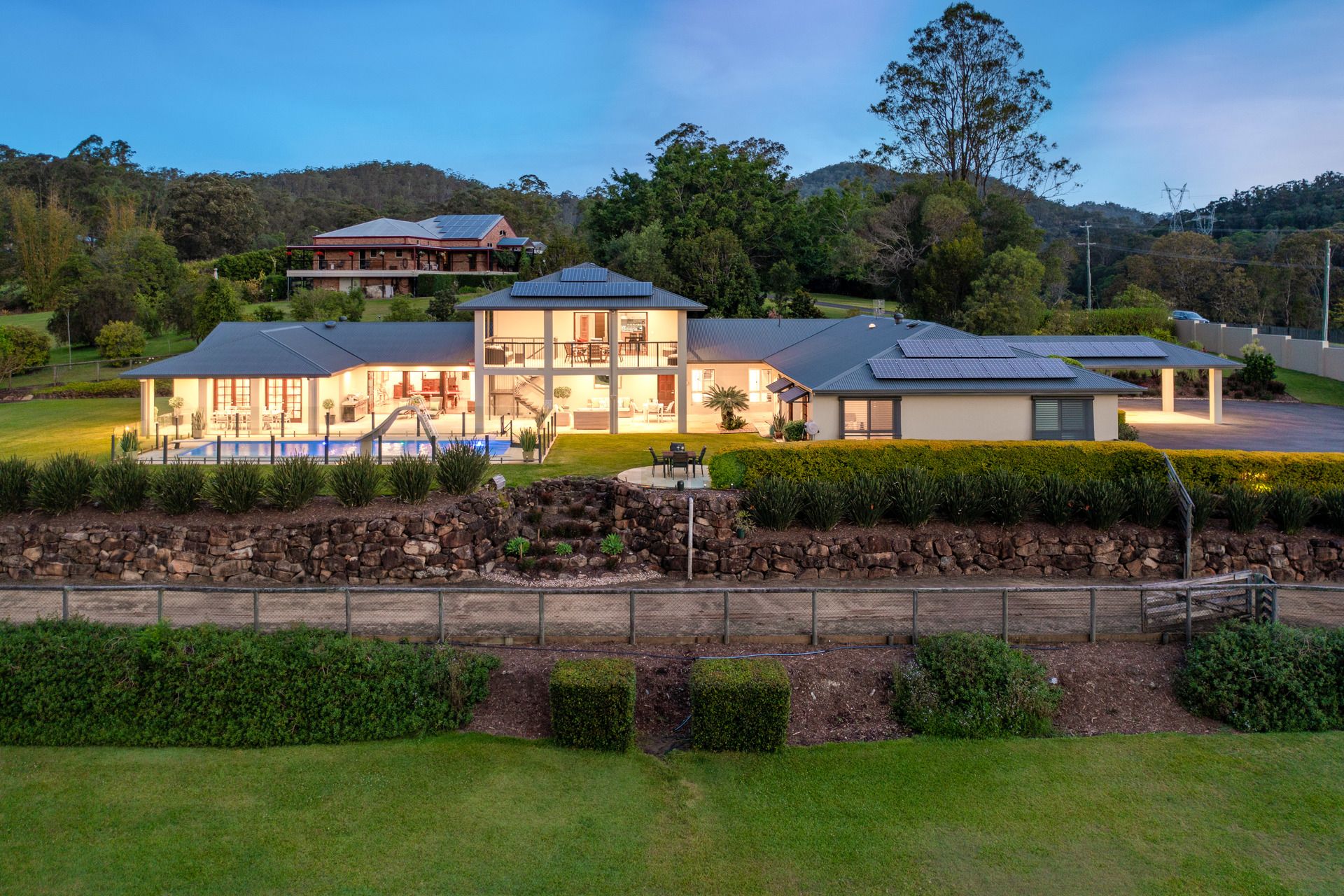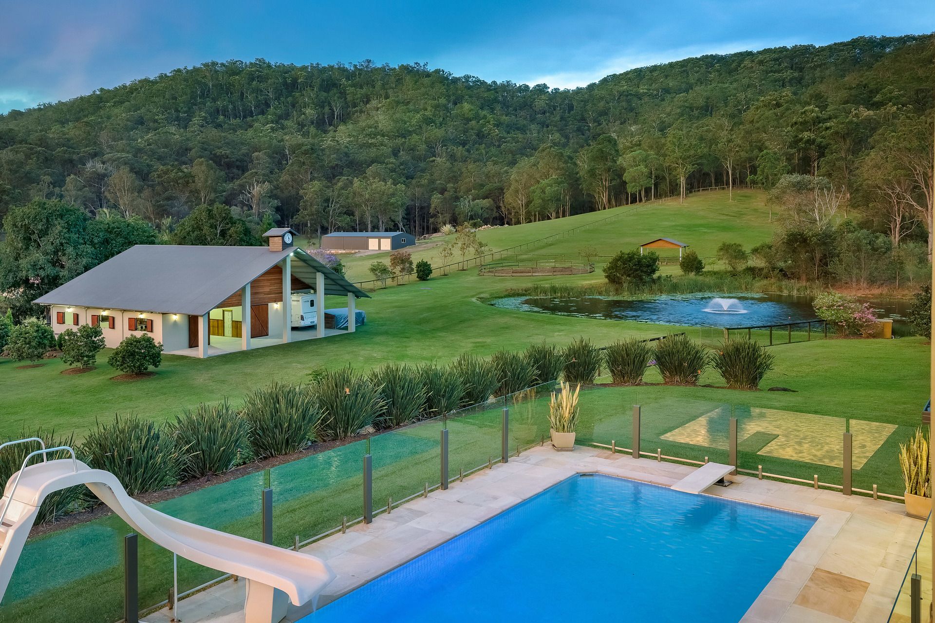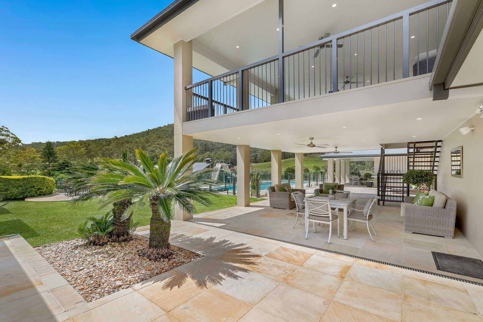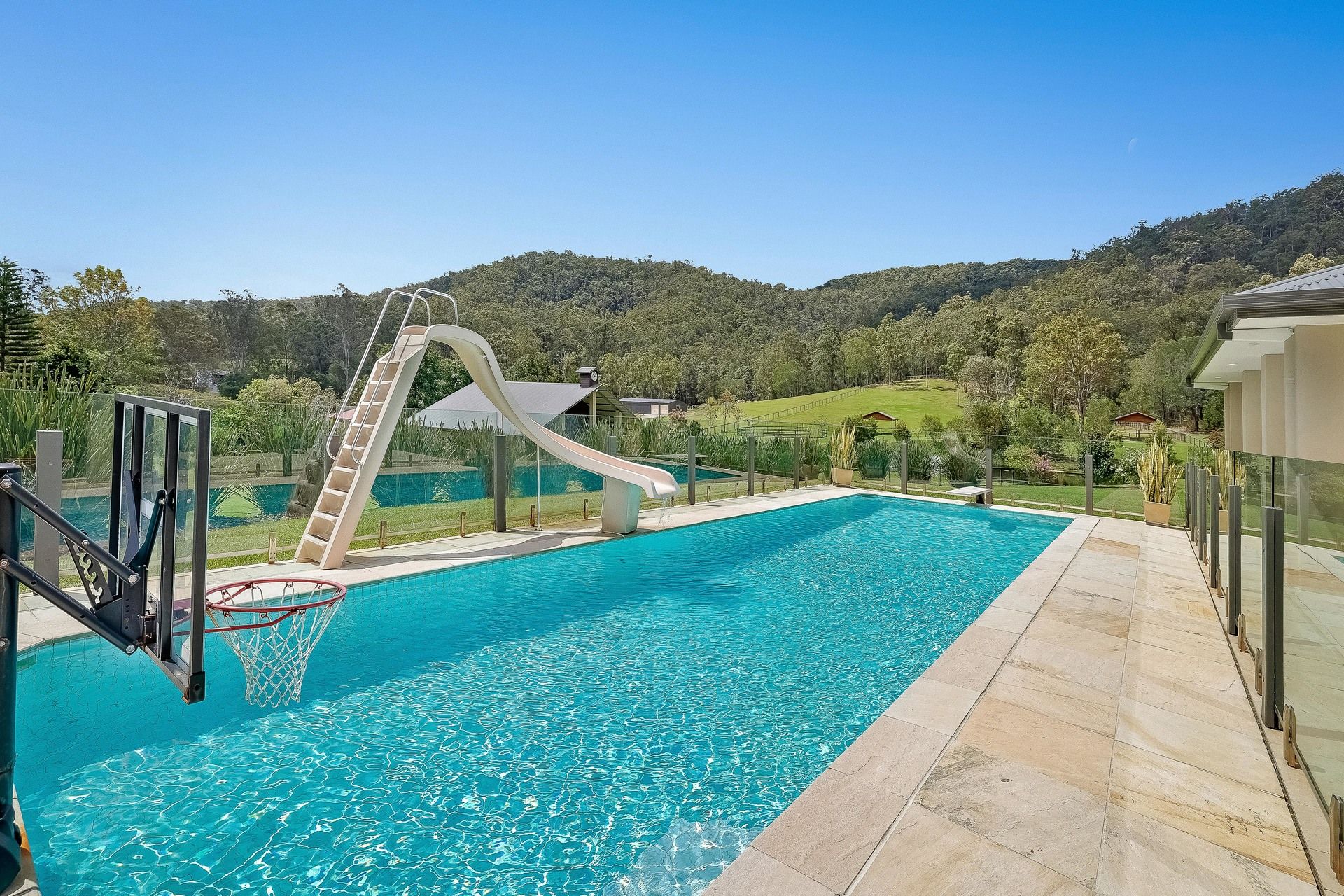 - Sandstone outdoor entertaining terrace plus large gas heated saltwater pool with springboard, waterslide and multi-coloured lights;