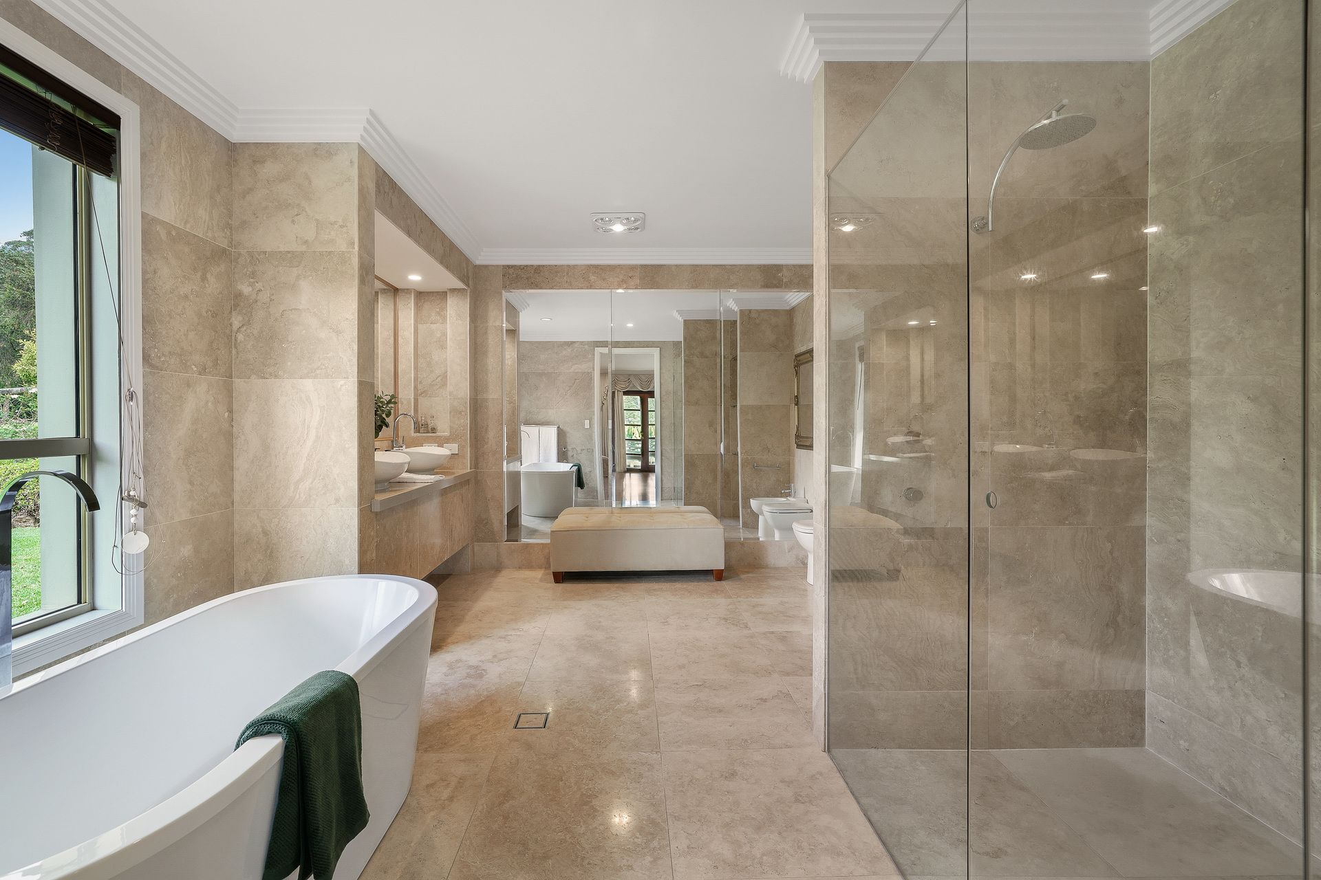 - Supersized master suite opens onto terrace, dressing room with skylight and a travertine ensuite with dual showers and freestanding bath;