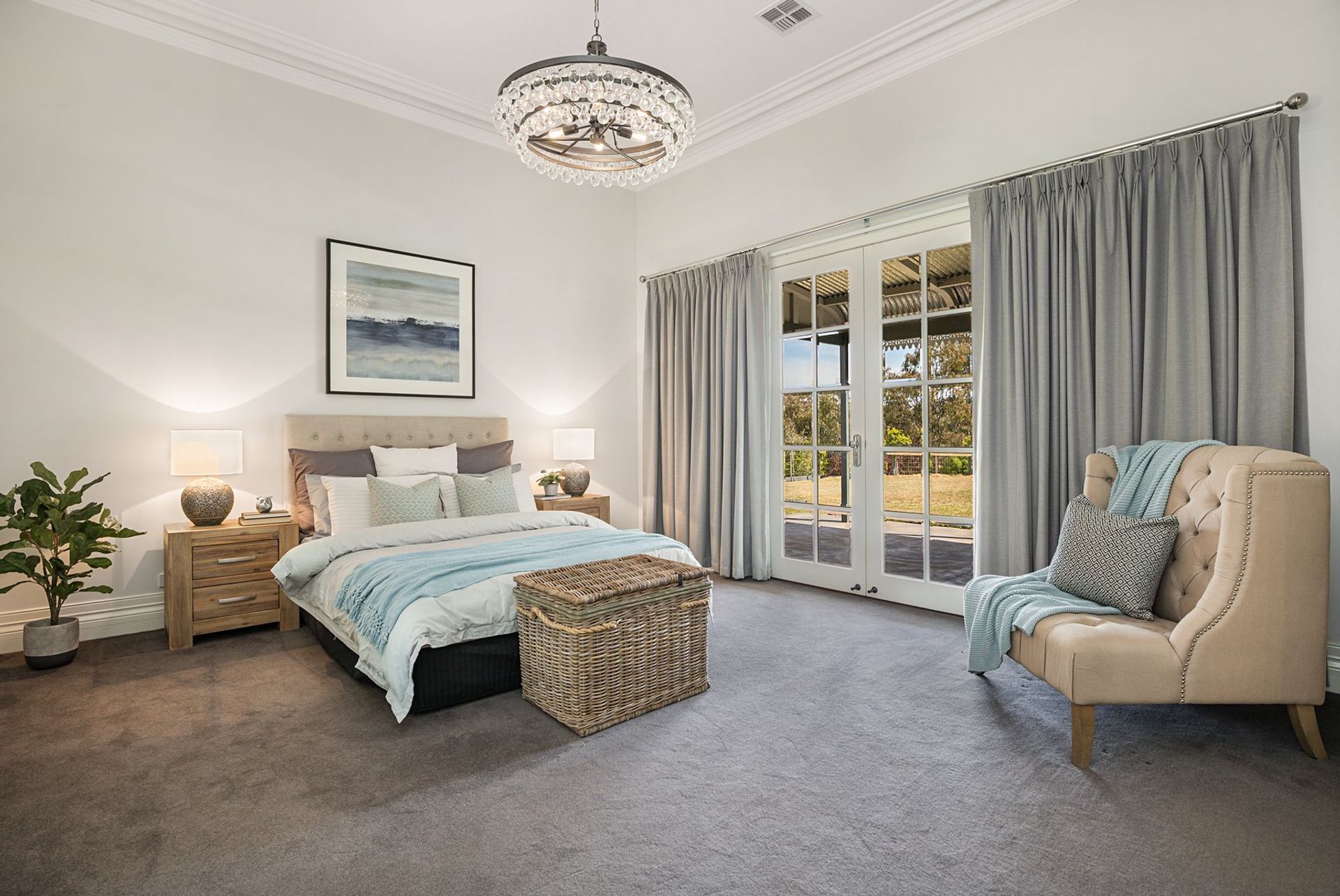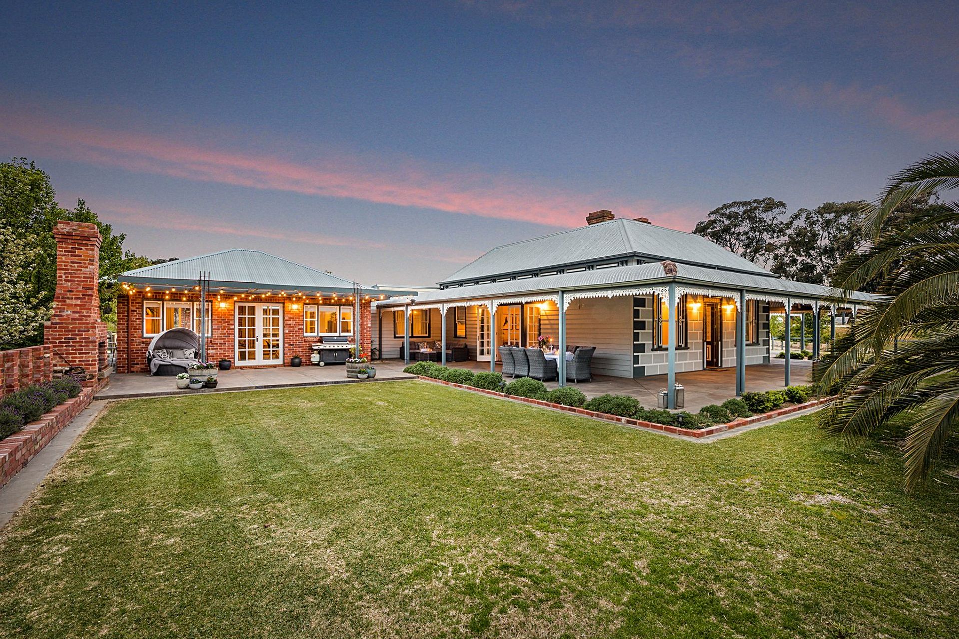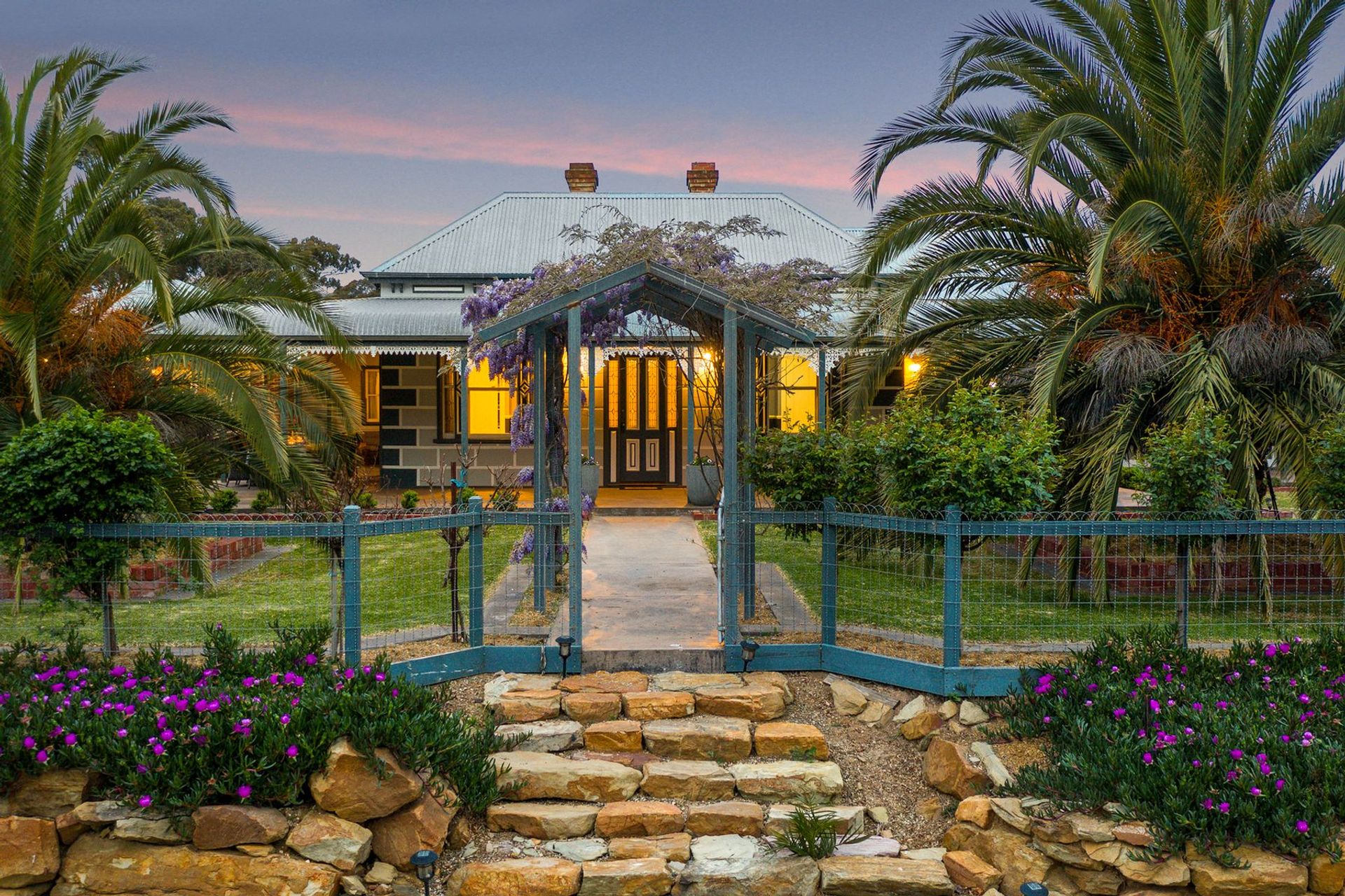 Established palms at the entrance offer a grand welcome, and the older section of this heritage build is rich with character charm – from the rambling bullnose veranda, to the spacious rooms with open fireplaces indoors. The main entry offers two bedrooms, and this entrance hall leads down to an open plan kitchen, living and dining space. The stylish country kitchen features every modern convenience and French doors open from many of the living areas to the outdoors. A hallway from the main living takes you past a study with built-in storage and desk, and a spacious formal lounge. This section of the property also features a stunning master suite with ensuite and walk-in robe. On the other side of the home are two additional bedrooms, a family bathroom, laundry and mudroom with shower and drying room, sunroom, space for an additional toilet and a third living area.