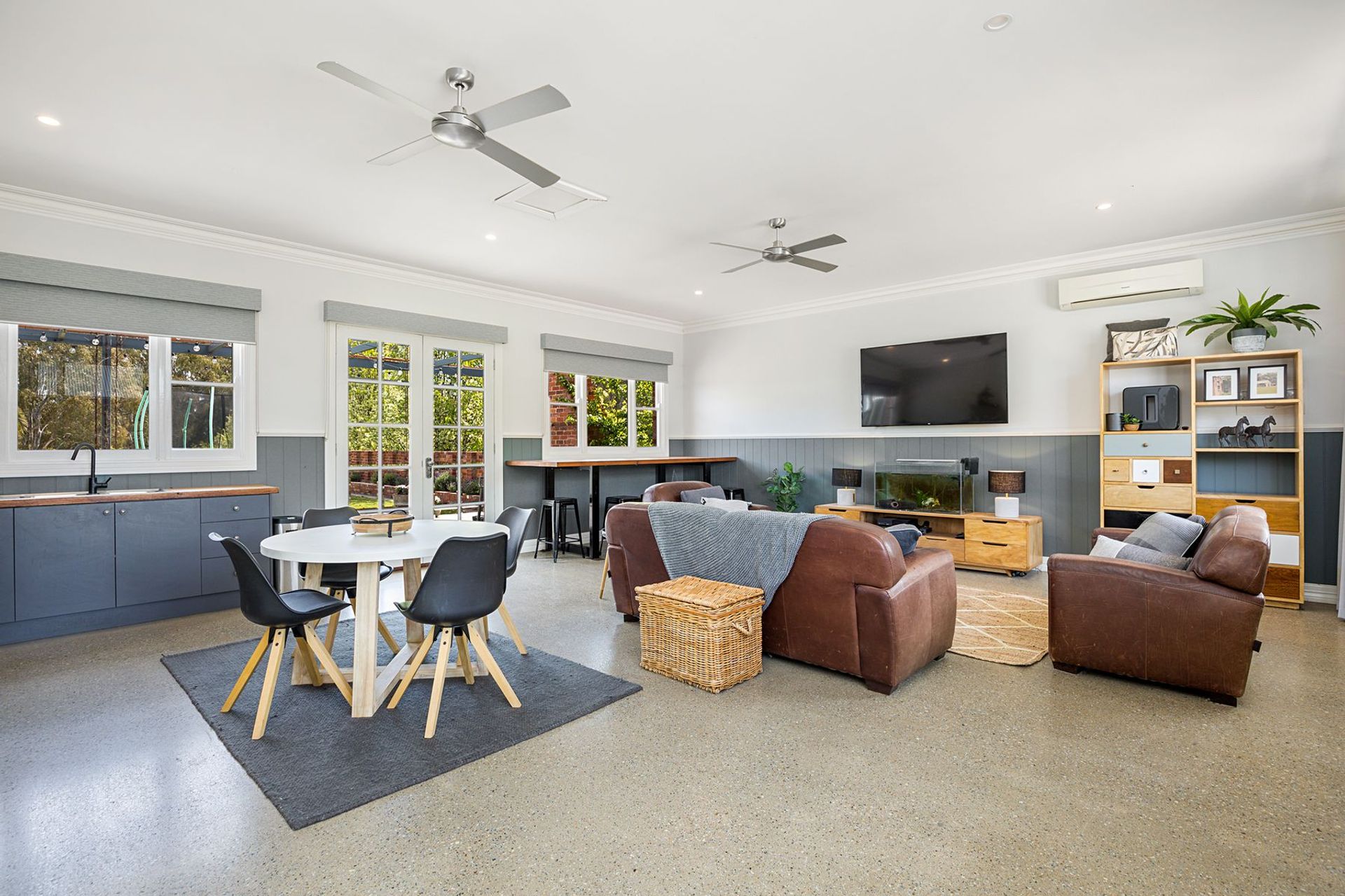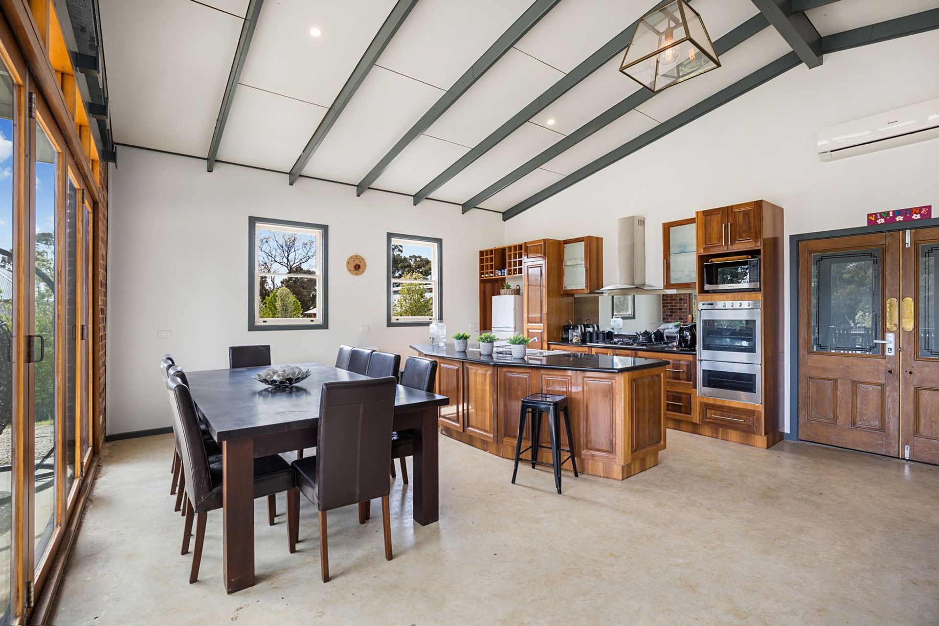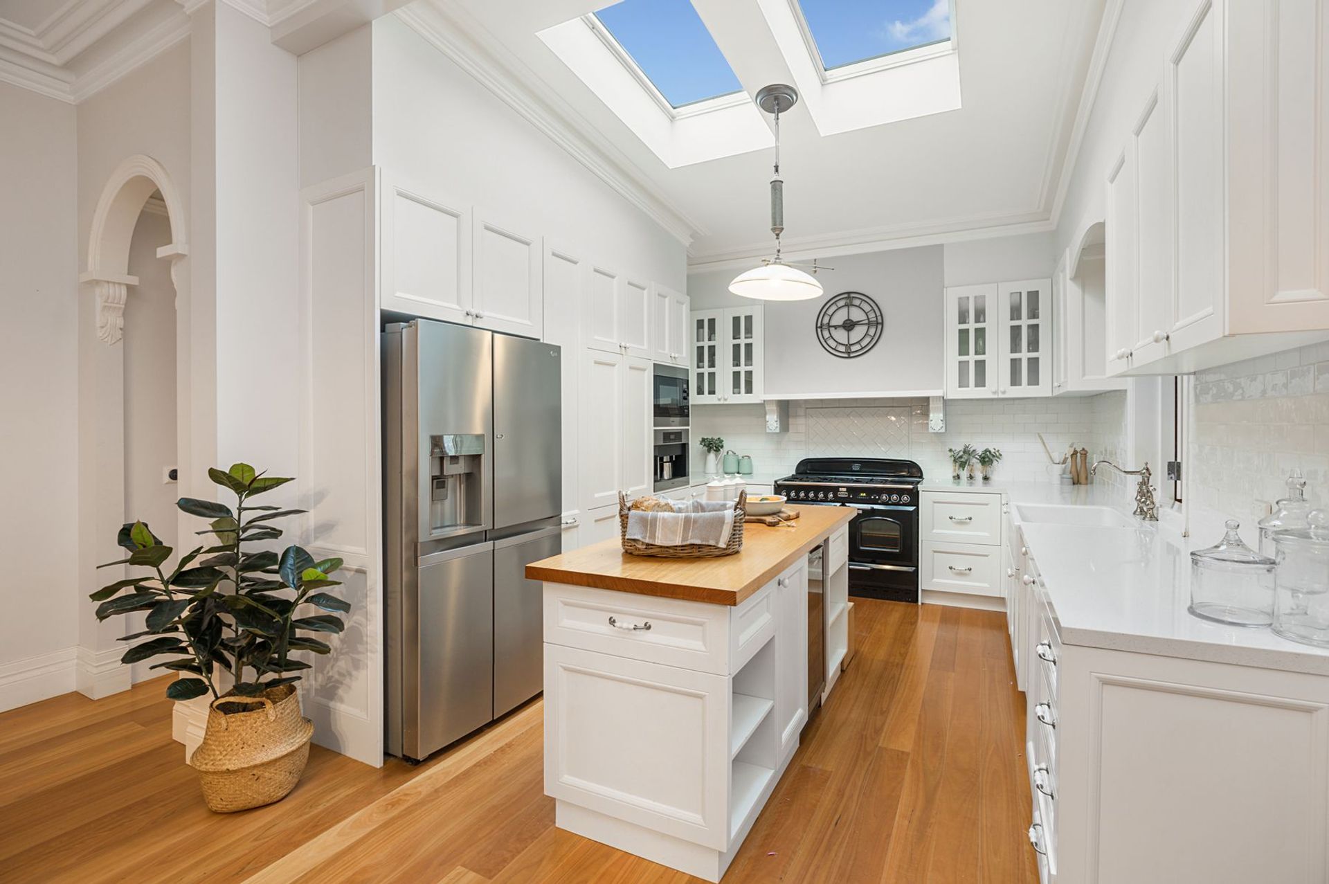 - Modern country kitchen with large skylight (electric blinds), stone and timber benchtops and Belfast sink