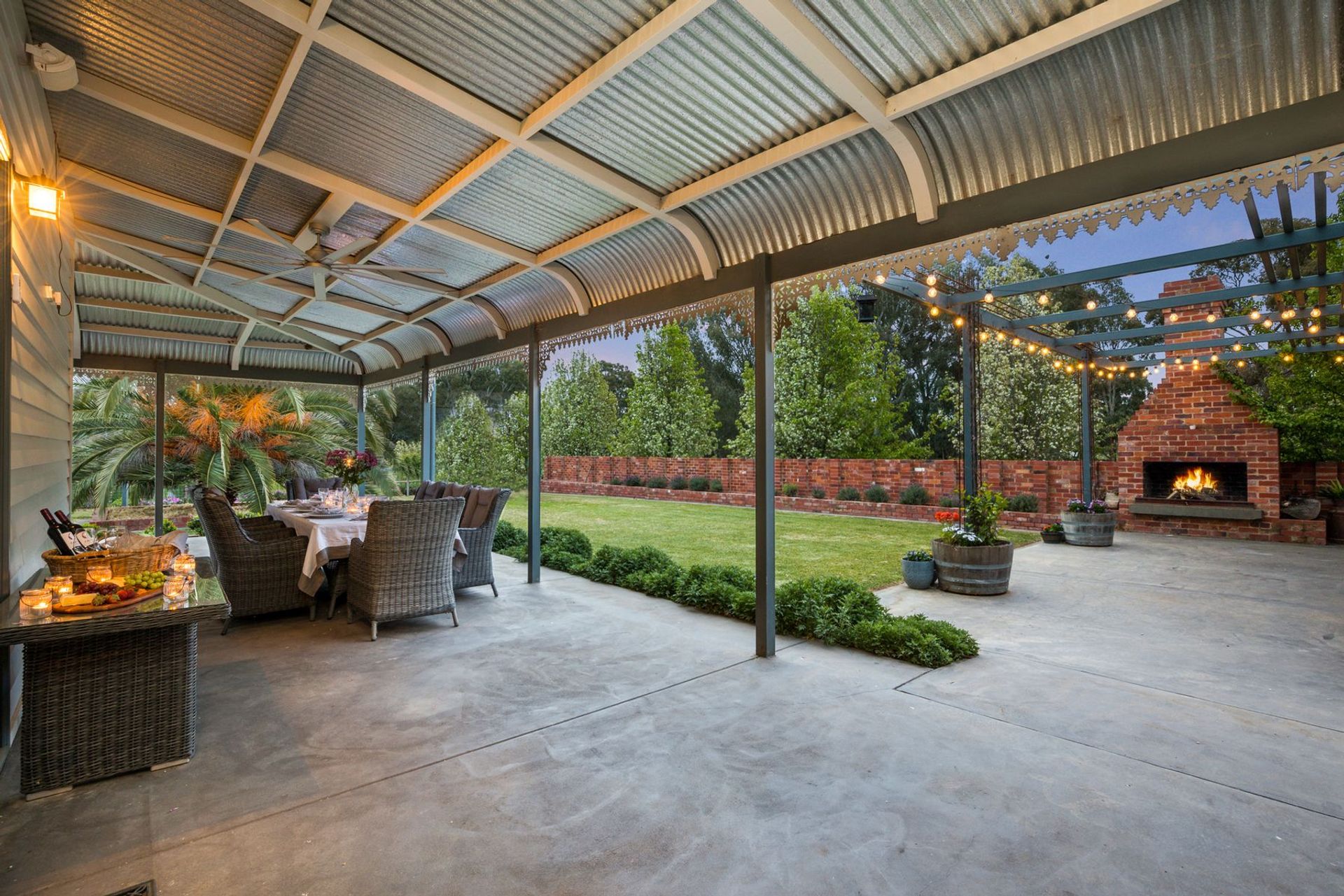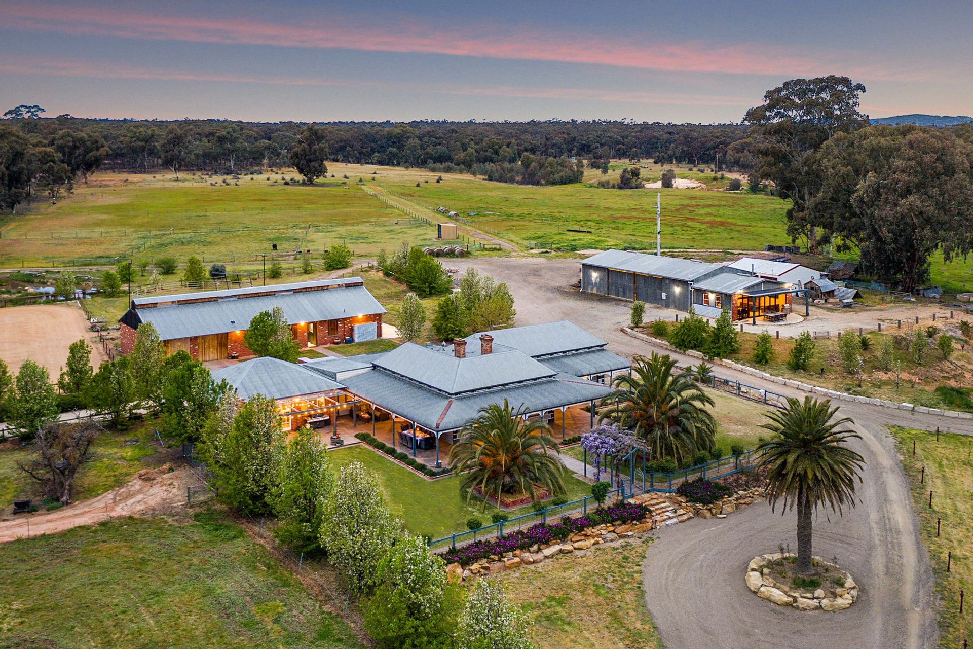 The outside of this home has enjoyed as much consideration as the inside, with multiple outbuildings providing everything you may need. An immaculate brick barn with paved flooring and timber detail overlooks an arena and round yard, and 14 paddocks beyond this space are fully-fenced with dedicated horse fencing. A large machinery shed also features additional living at one end with fireplace, full kitchen, bathroom, and bedroom. This opens out, with bi-fold doors, to a porch overlooking the dam and creek – ideal for entertaining. Further entertaining spaces around the home includes multiple living zones, both undercover and to make the most of the sunshine.
