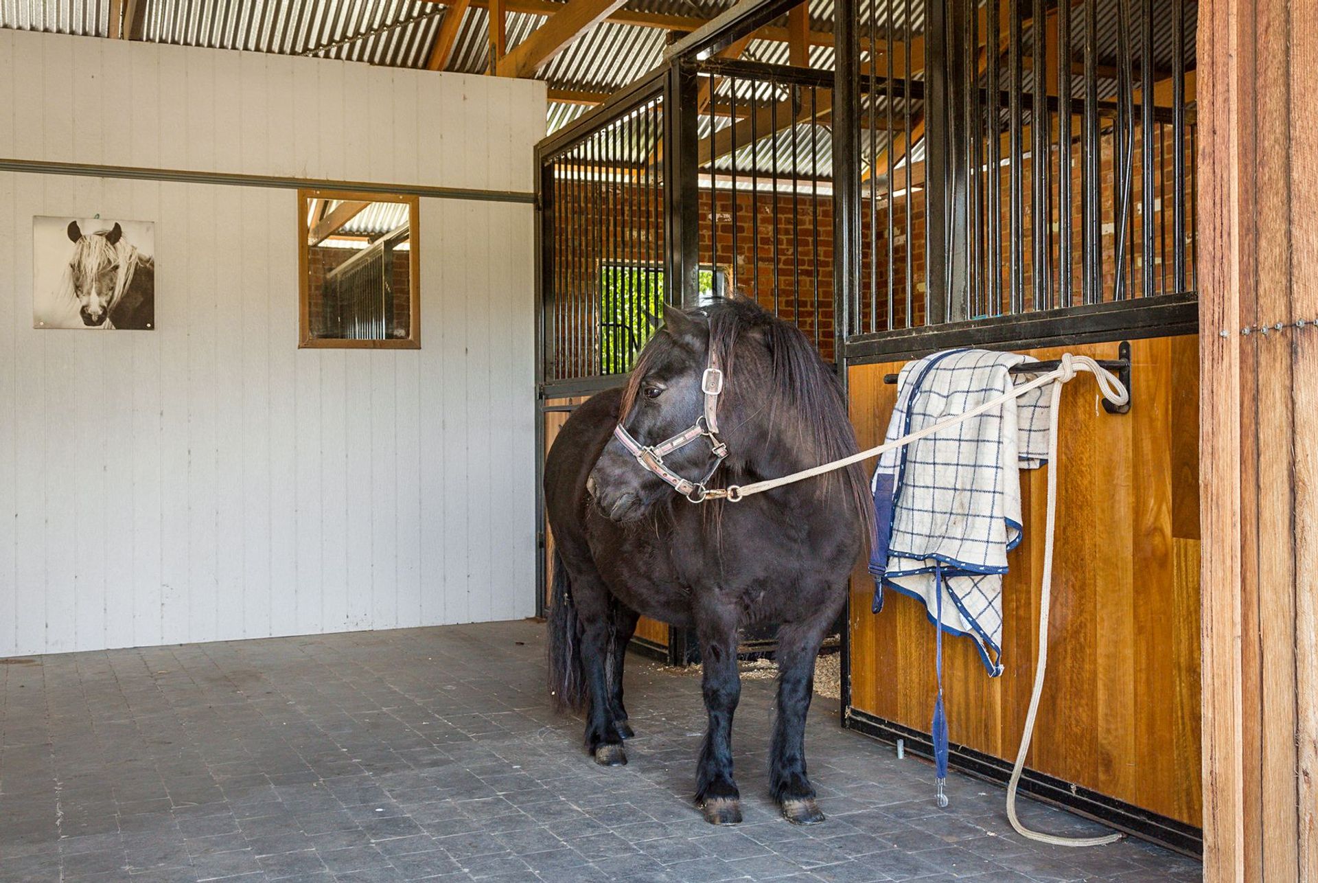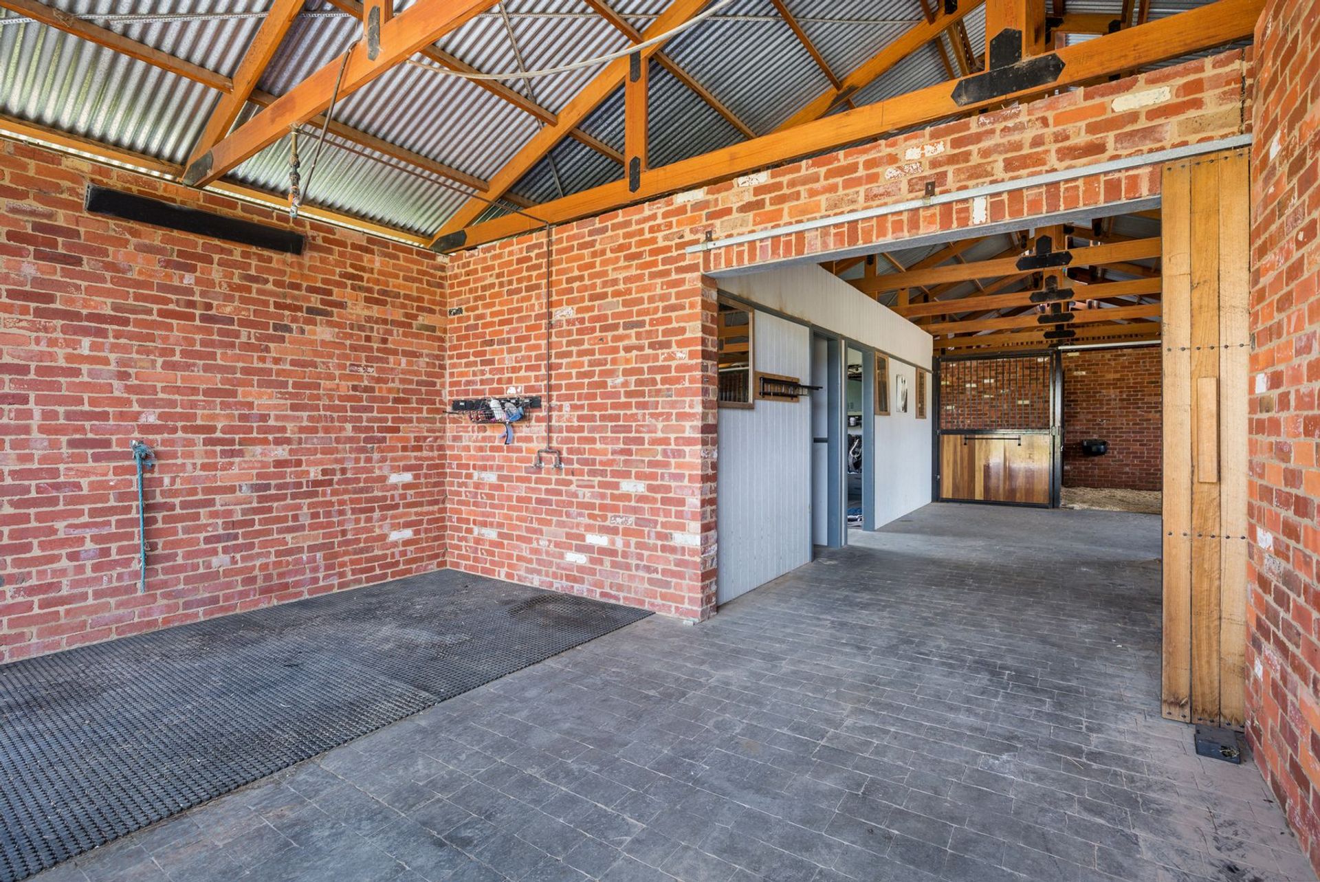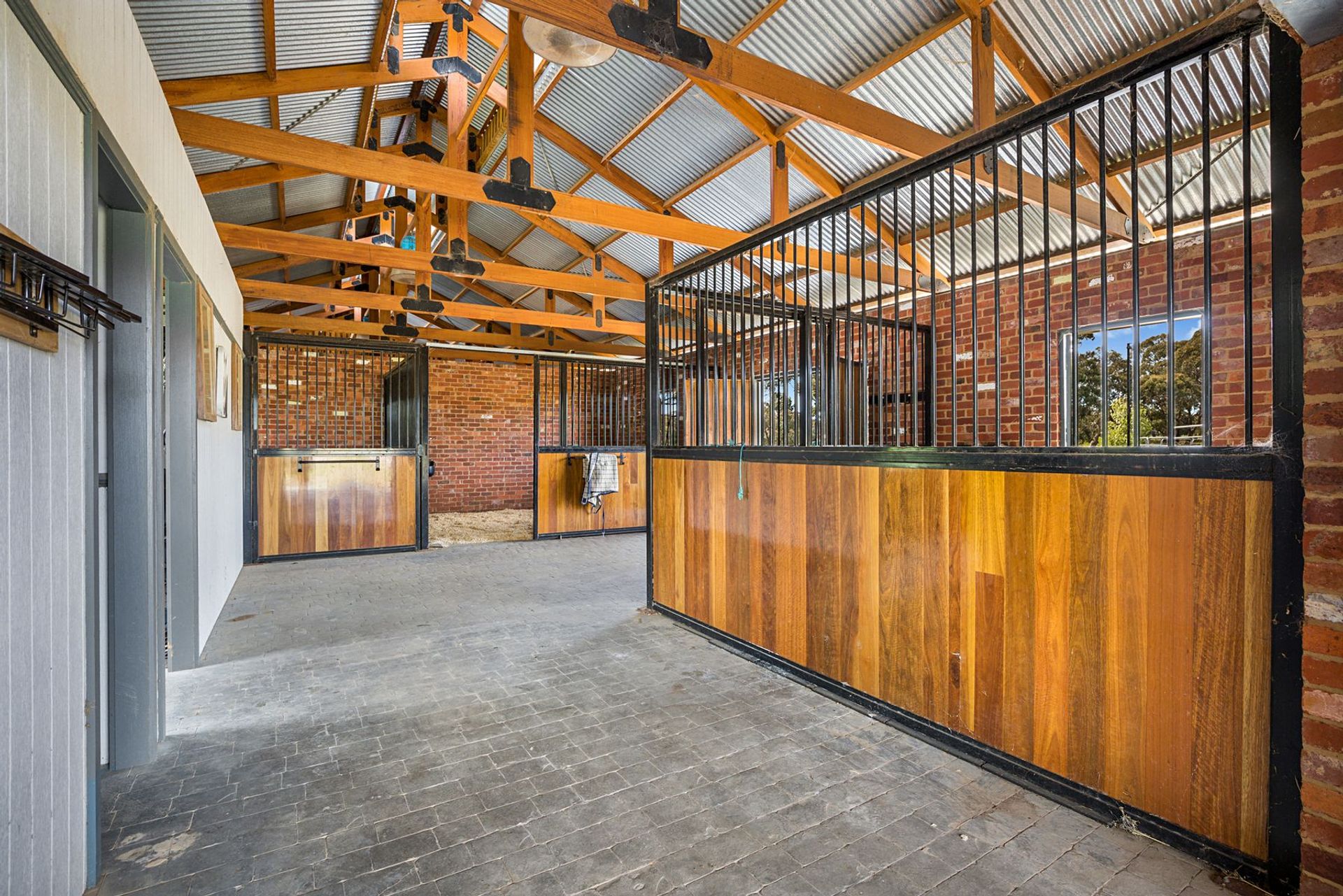 - Brick barn and stables (inc. 3 x 5m x 4m bays, 2 x workrooms, machinery and feed rooms, lights); horse fencing on all paddocks (electric, no barb wire); arena (20m x 60m) and round yard with lights