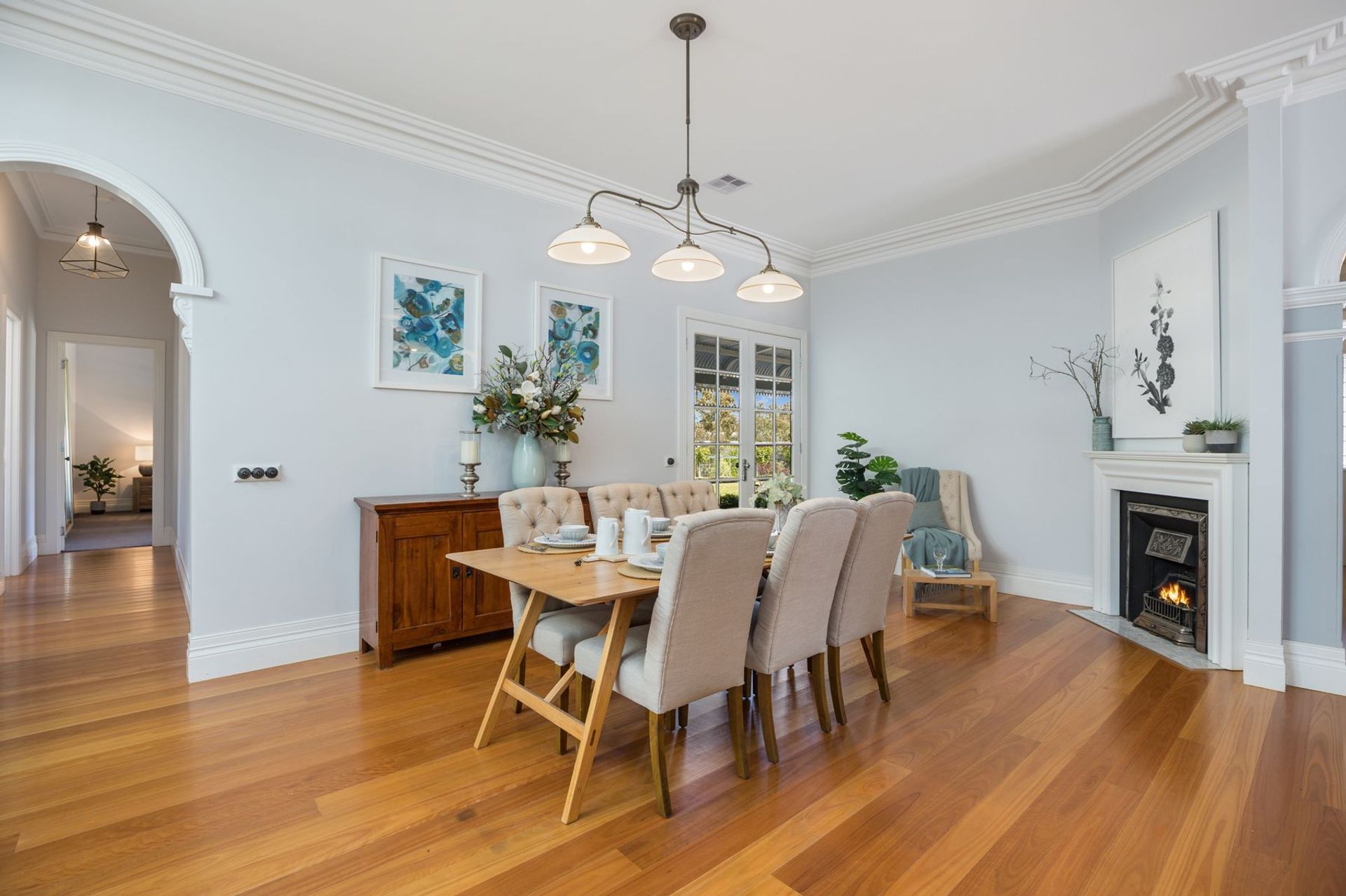 - Character details including timber flooring, cast iron fireplaces, high ceilings with decorative cornice and corbels, picture railing and 3m wide bullnose veranda wrapping around three sides of the house