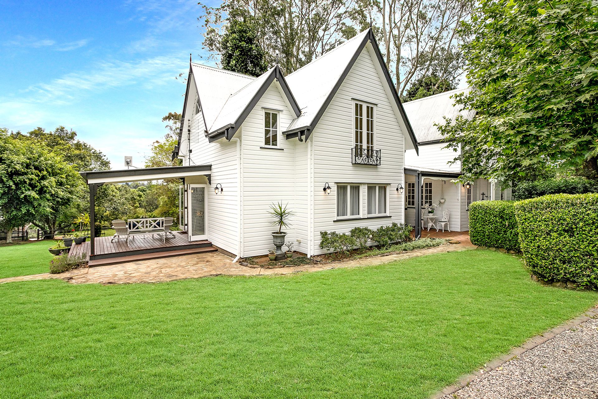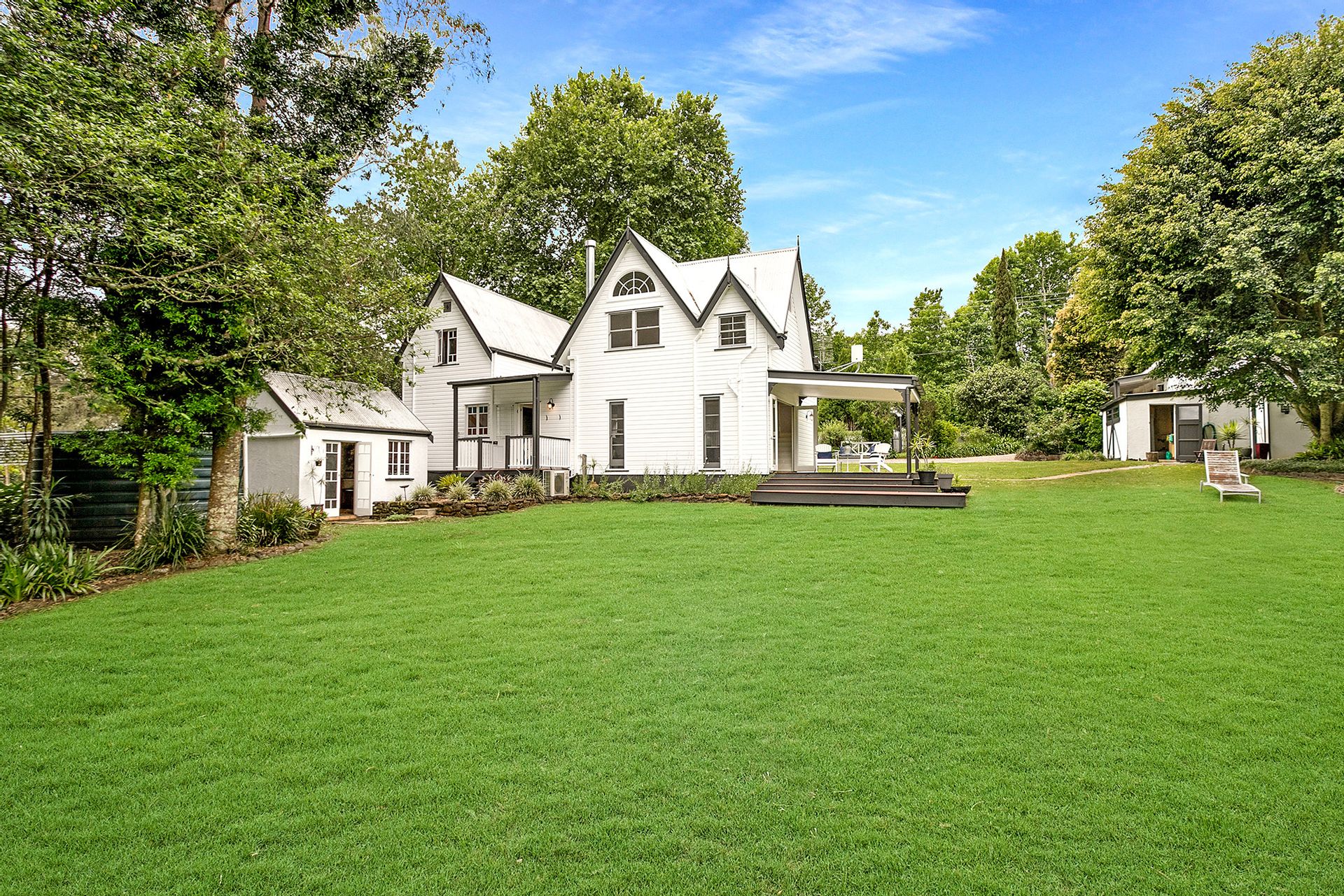 Maple trees grace the circular driveway which is framed by a white picket fence with an elegant white timber arbour at the entrance. Even the laundry, studio, garden shed and chicken coop are in keeping with the nostalgic style of this gorgeous home. Set amongst pretty and private gardens with lovely old-world trees, on just over one acre, there is plenty of room for children and pets or even a pool.