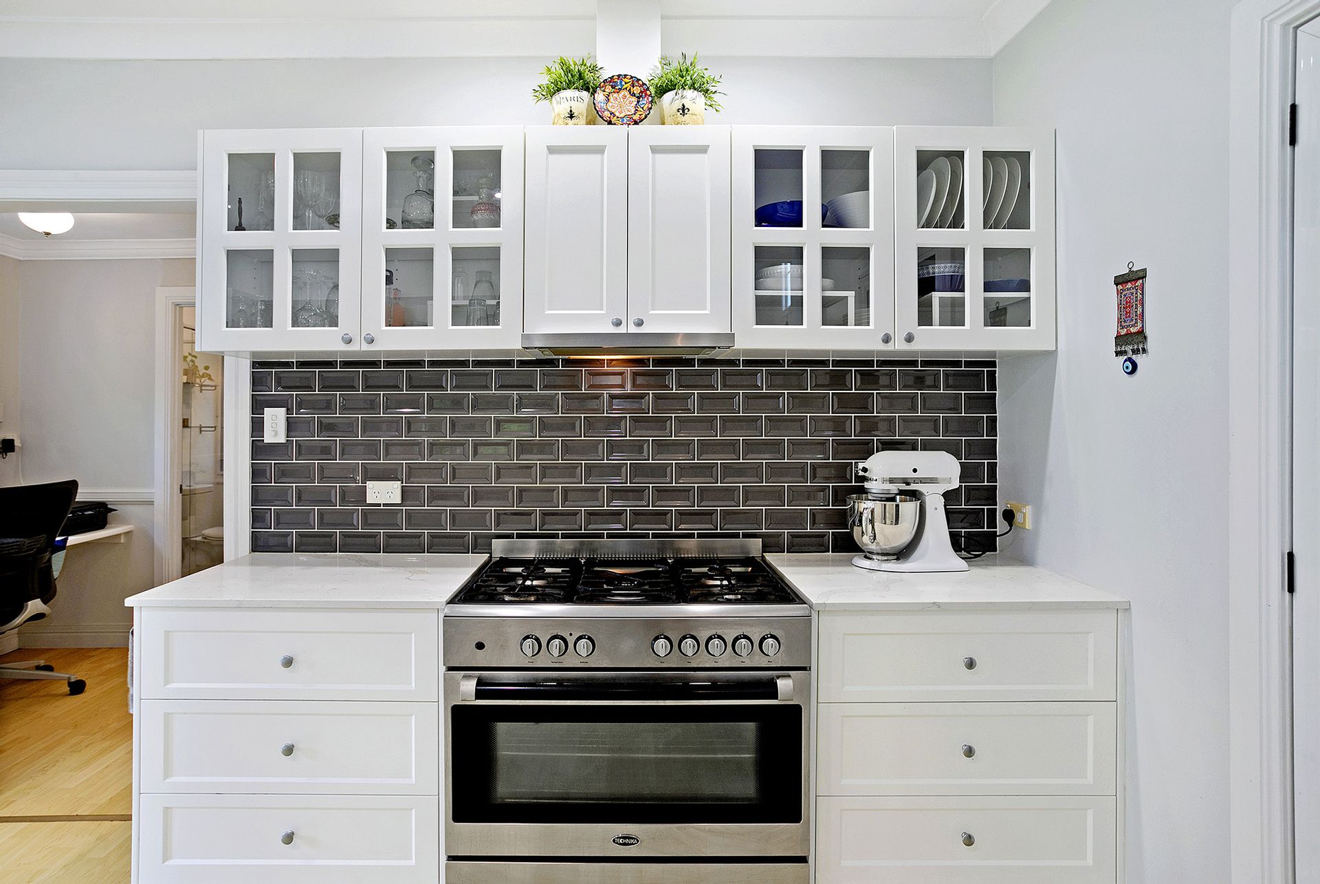 · New country style kitchen with stone waterfall benches, dual drawer dishwasher, 900mm stove with gas cooktop and electric oven, inverted, bevelled subway feature tiles are a stunning contrast to the white marbled stone tops, double door pantry and quality white cabinetry complete this stunning kitchen