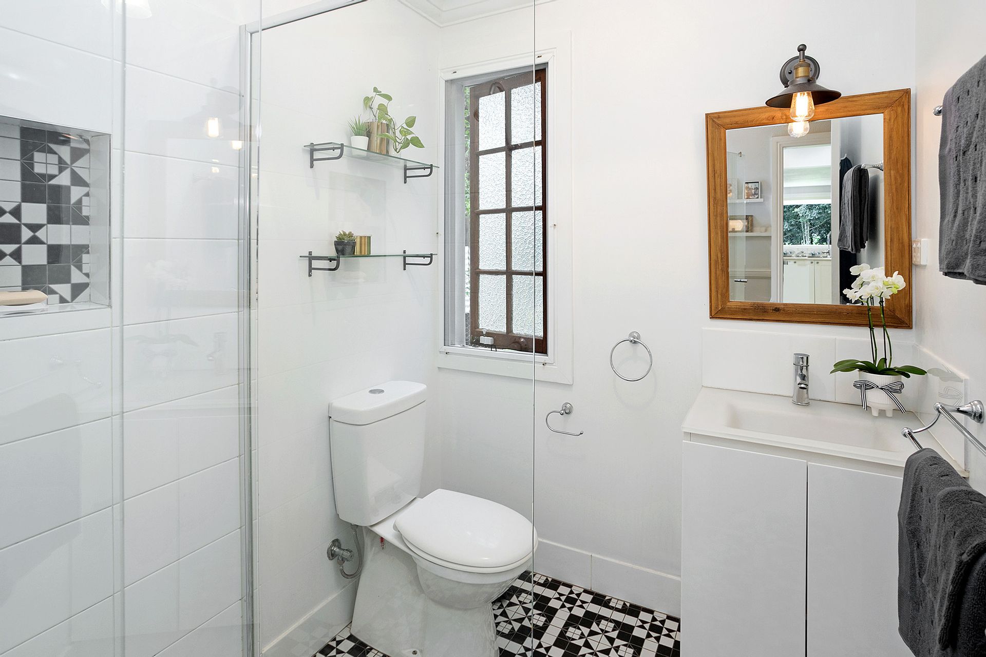 · Newly renovated guest bathroom with large shower, encaustic tiles, glass moulded vanity top plus vintage tapware and lighting