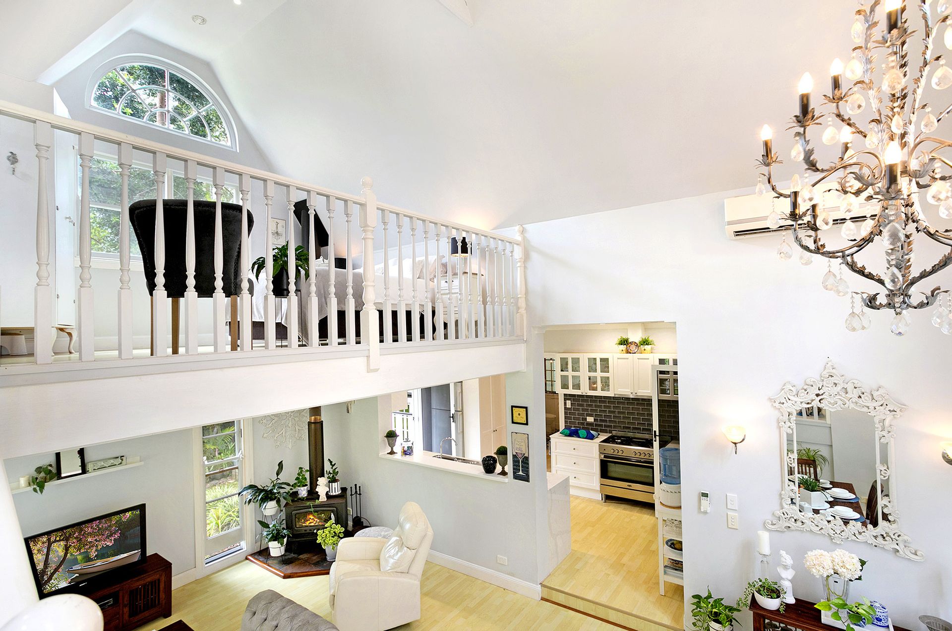 · Open plan second living and dining area with soaring vaulted ceilings, split system air conditioning, large feature windows, large scale ornate, filigree iron and teardrop glass chandelier plus decorative staircase leading to the master bedroom