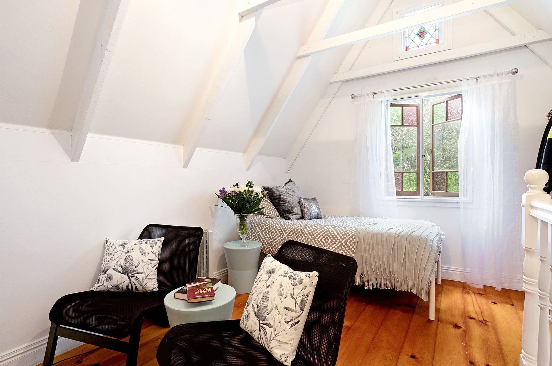 · Two guest loft bedrooms at the other end of the home feature exposed beam, apex ceilings plus stained glass and coloured glass feature windows