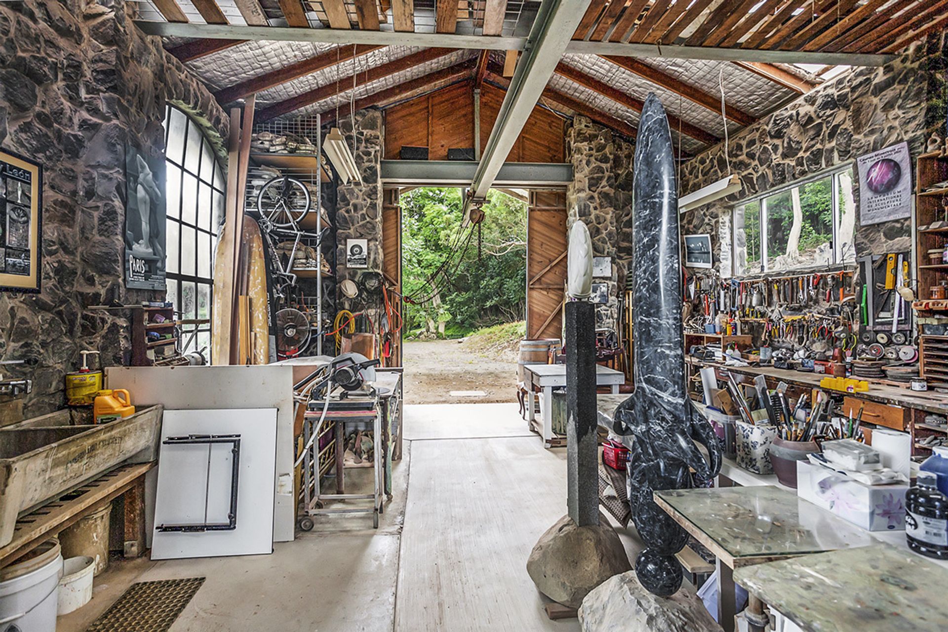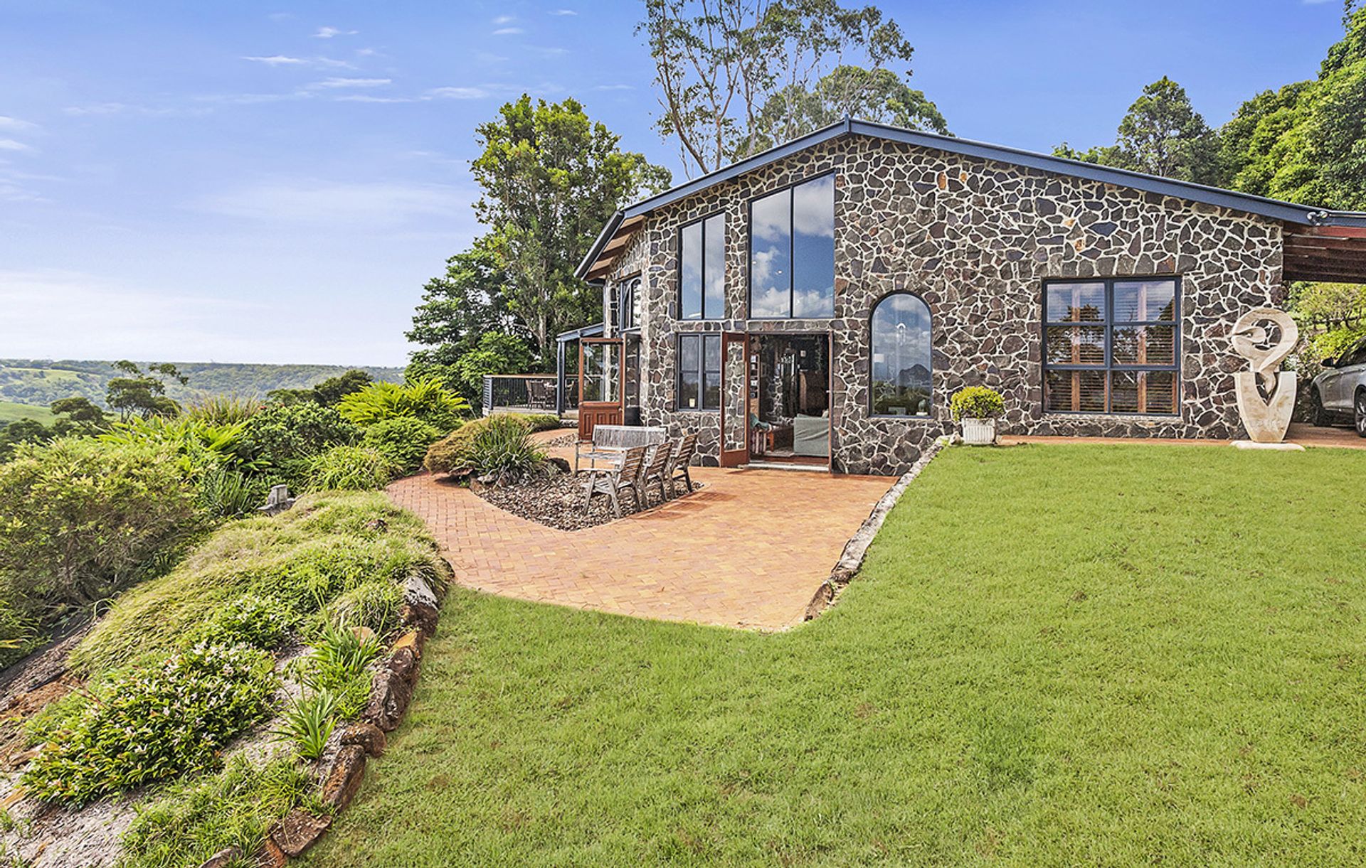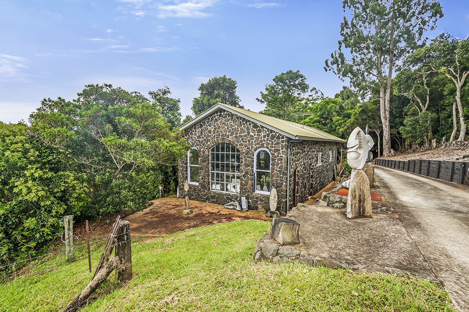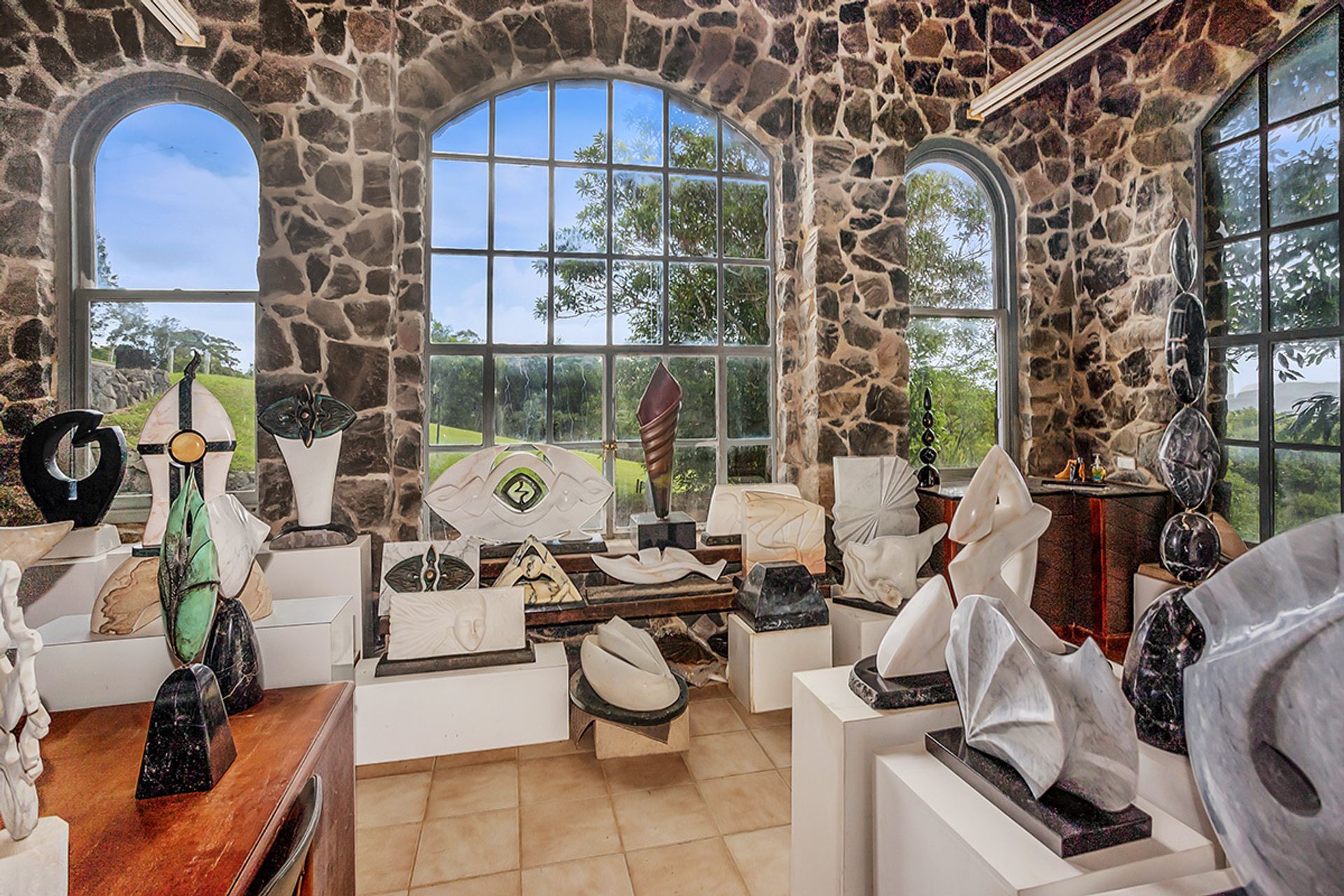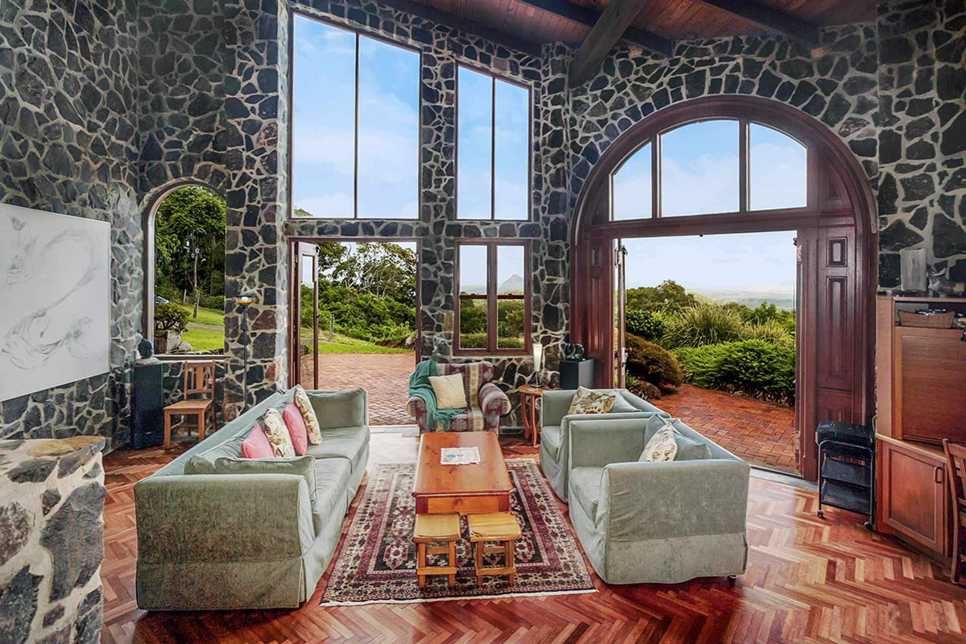 The Blue Stone for construction of the home were sourced from the Beerwah Quarry while the Blue Stone for the studio construction was sourced locally from Hovard Road Quarry, when operational. Expansive and captivating mountain views can be seen through the arched, solid silky oak doors that once graced the entrance to the iconic MIM Building in Brisbane. Solid timber beams feature in the vaulted ceilings which were once part of the Newstead Wharfs. Oregon timber ceilings add to the warmth and character of this beautiful home. The stunning arched windows in the studio and home were sourced from the operating theatres of the old St Martins Hospital in Brisbane. The stunning parquetry floors are constructed from Duran timber and are a real feature of this unique home. Magnificent leadlight windows throughout the home was designed by the owner and hand crafted by a Brisbane artist. If these walls could talk there would certainly be a tale to tell.