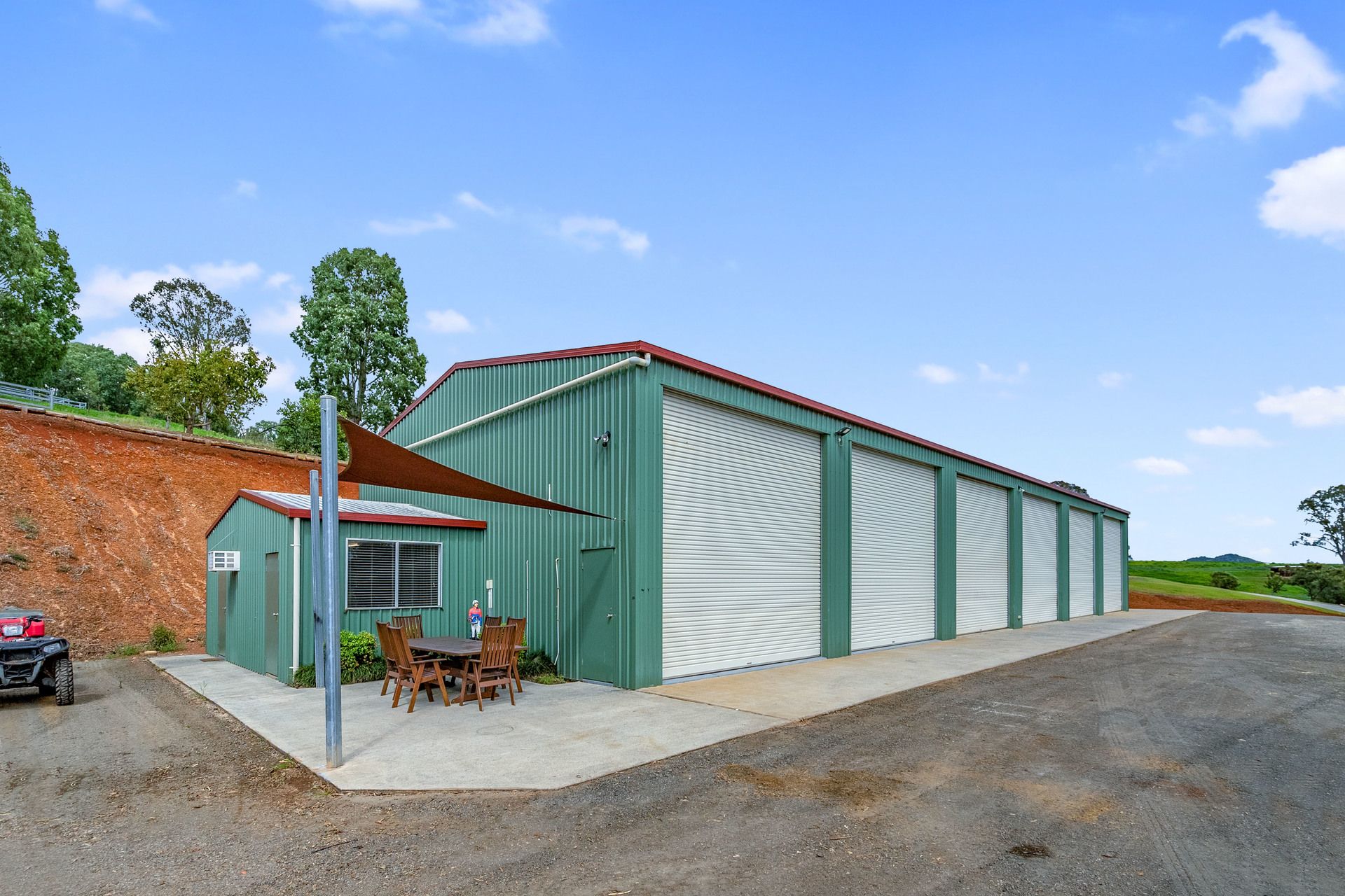 Machinery shed - 6 bay - 460m2 - High bay roof - 3 phase power + Industrial lighting - Air conditioned Office - Bathroom - Kitchen