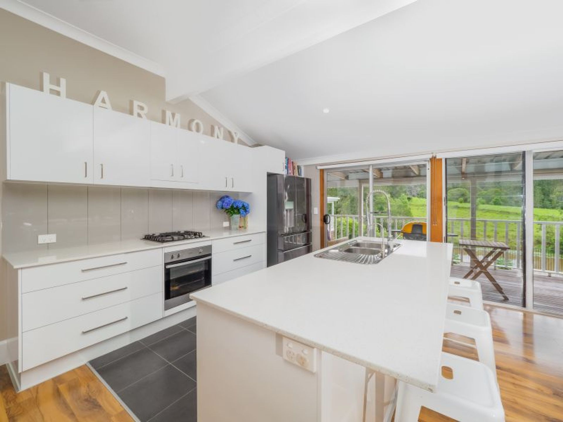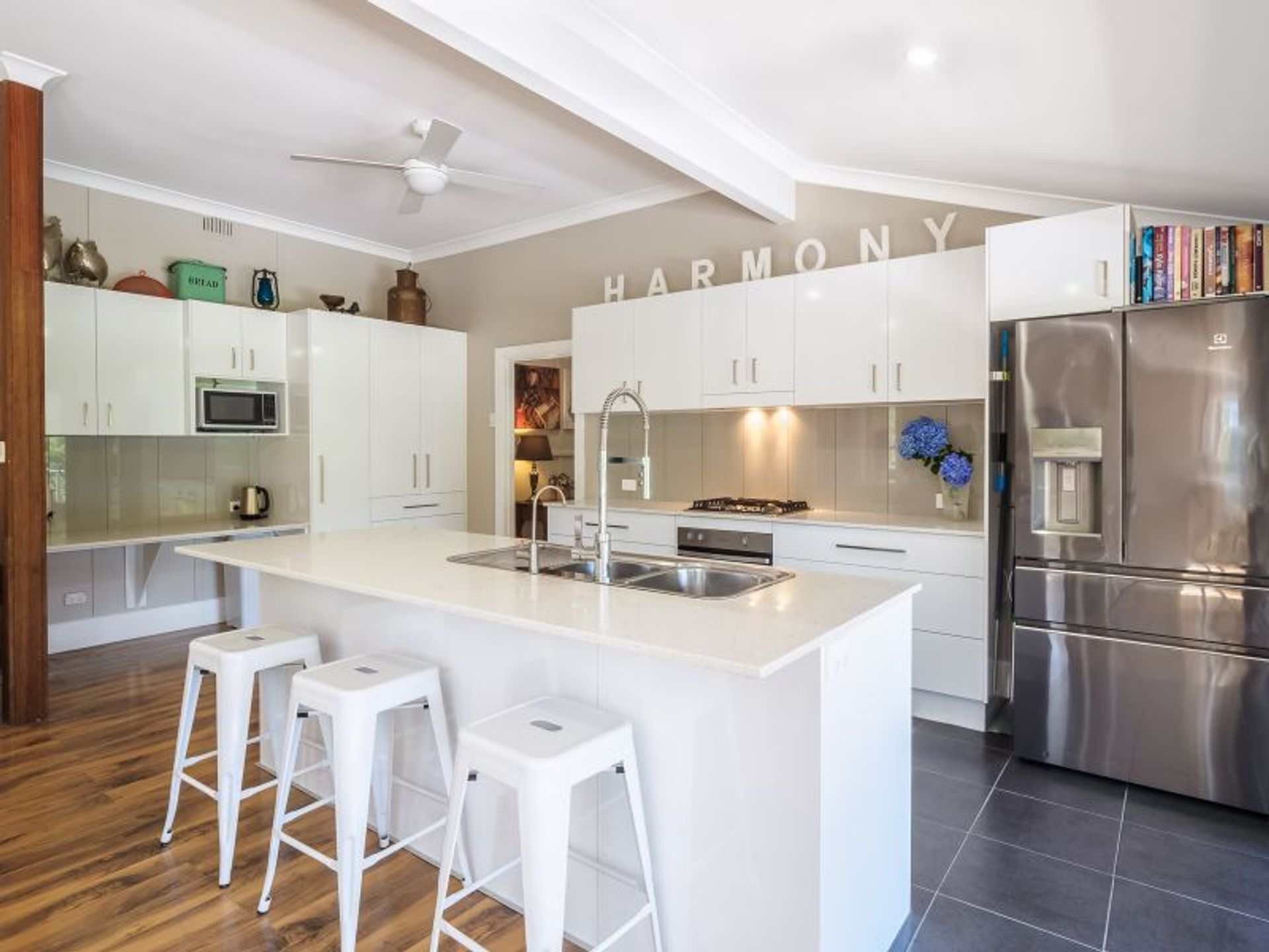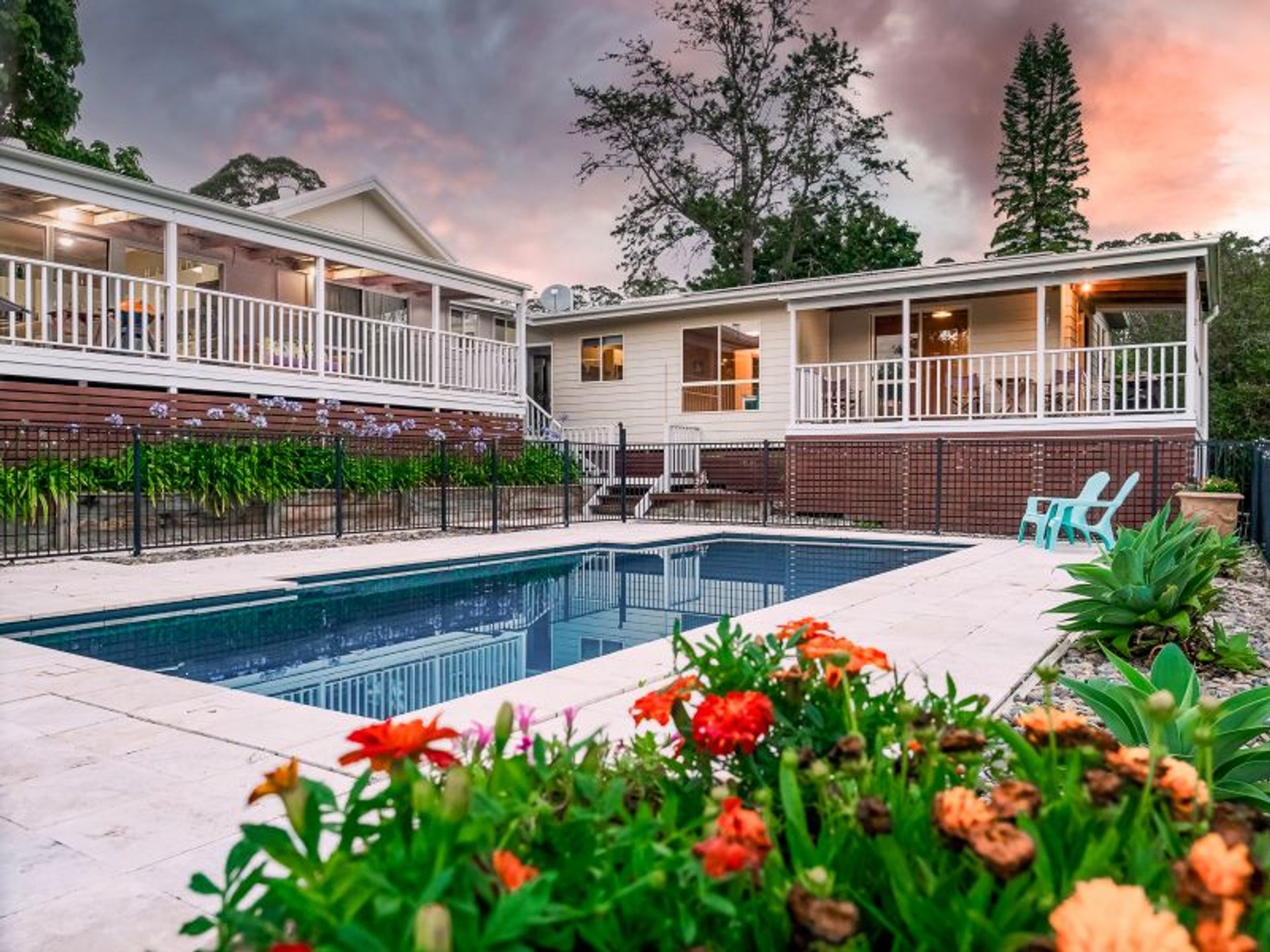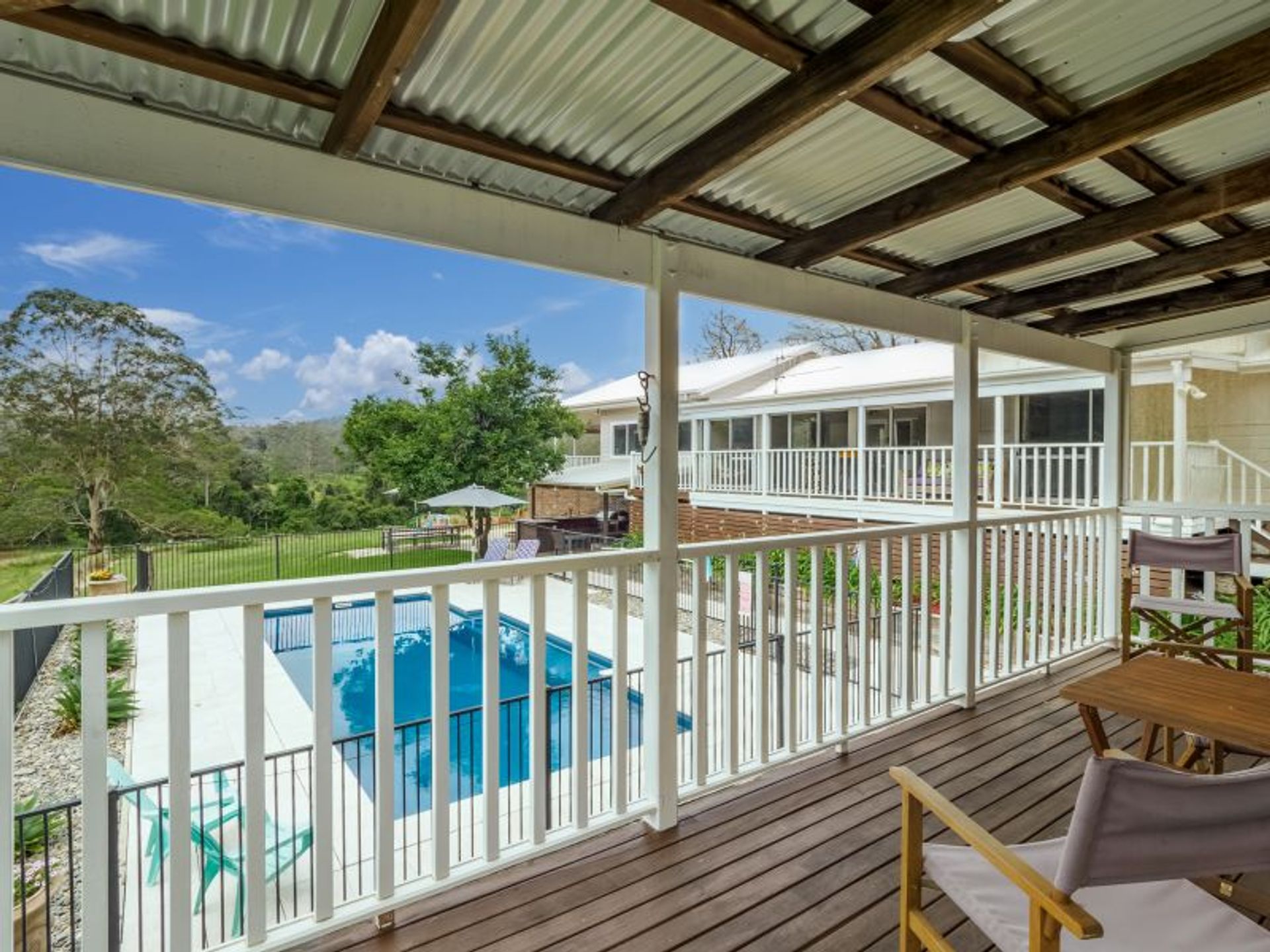 The main house has been meticulously renovated, featuring a modern kitchen with stone benchtops and an island bench overlooking the saltwater pool and the acreage beyond to Lorne Mountain.
