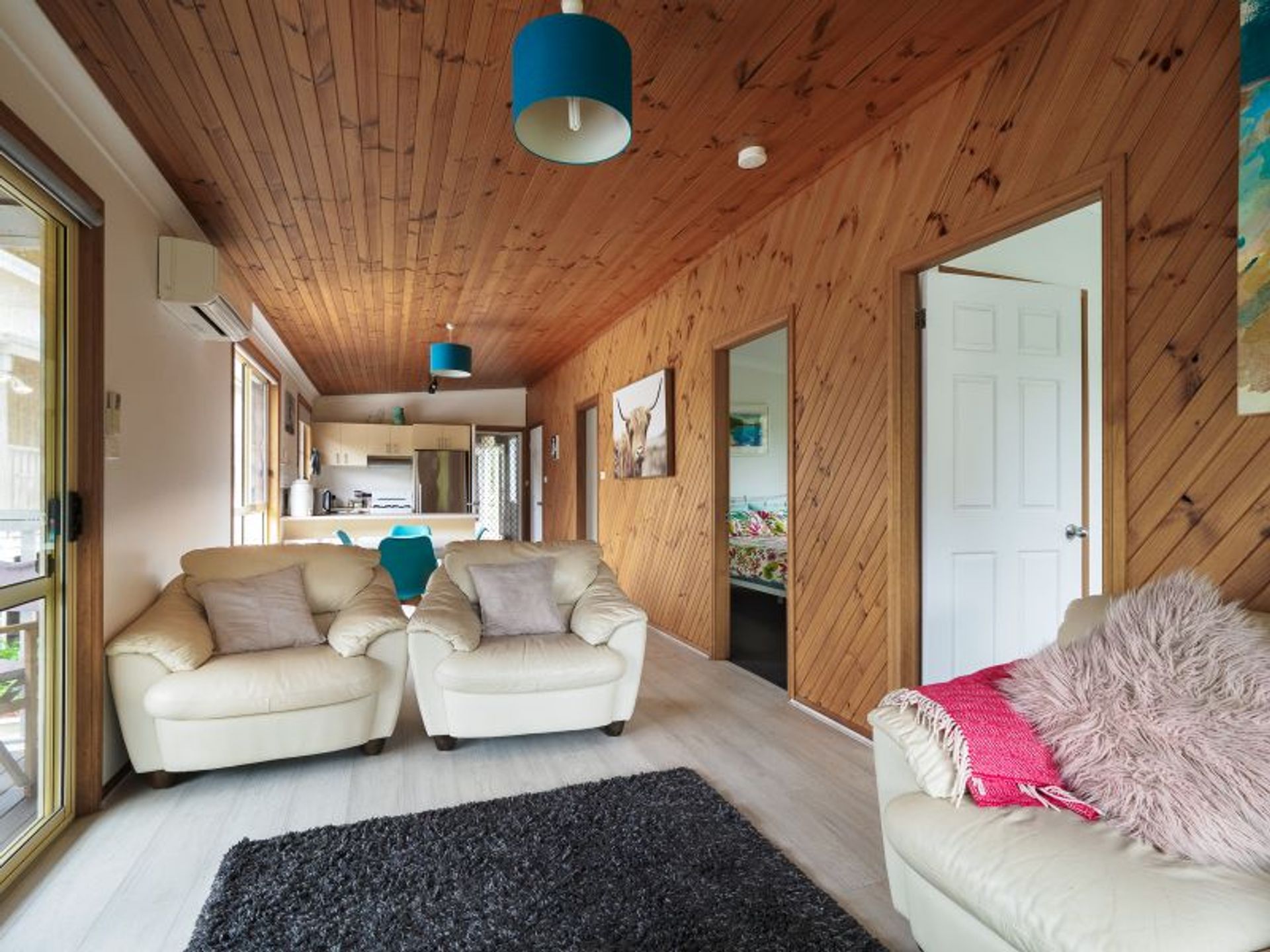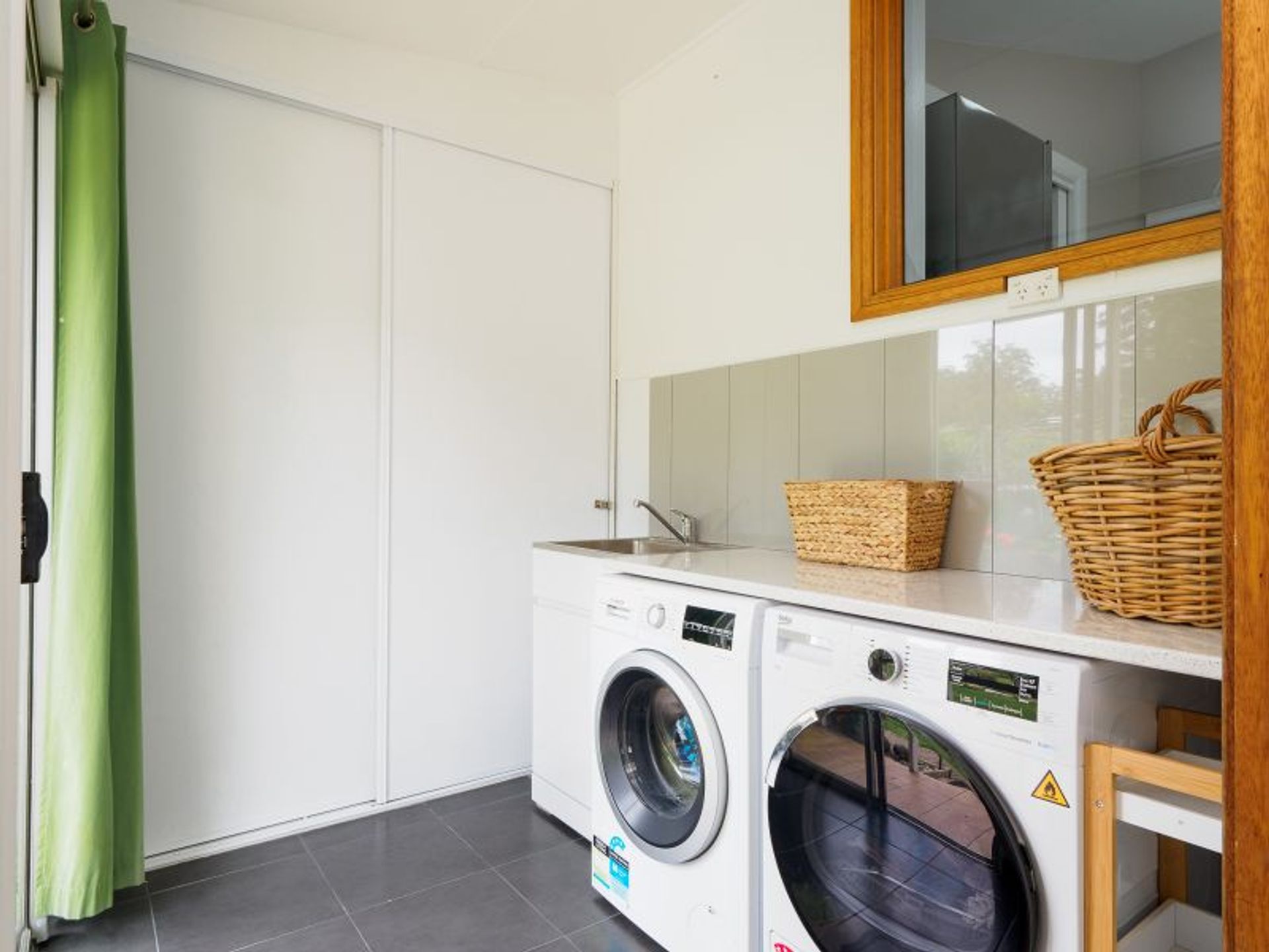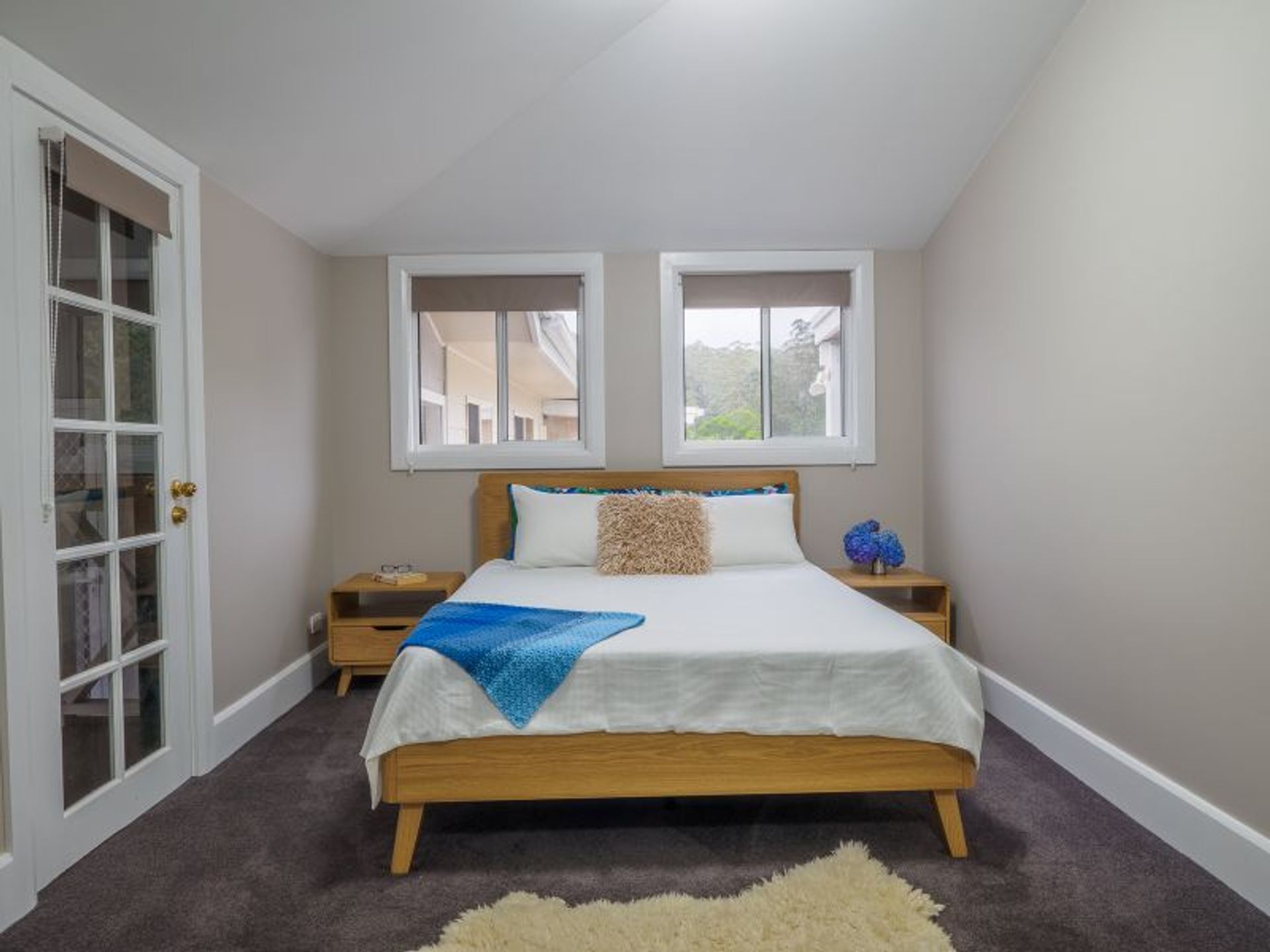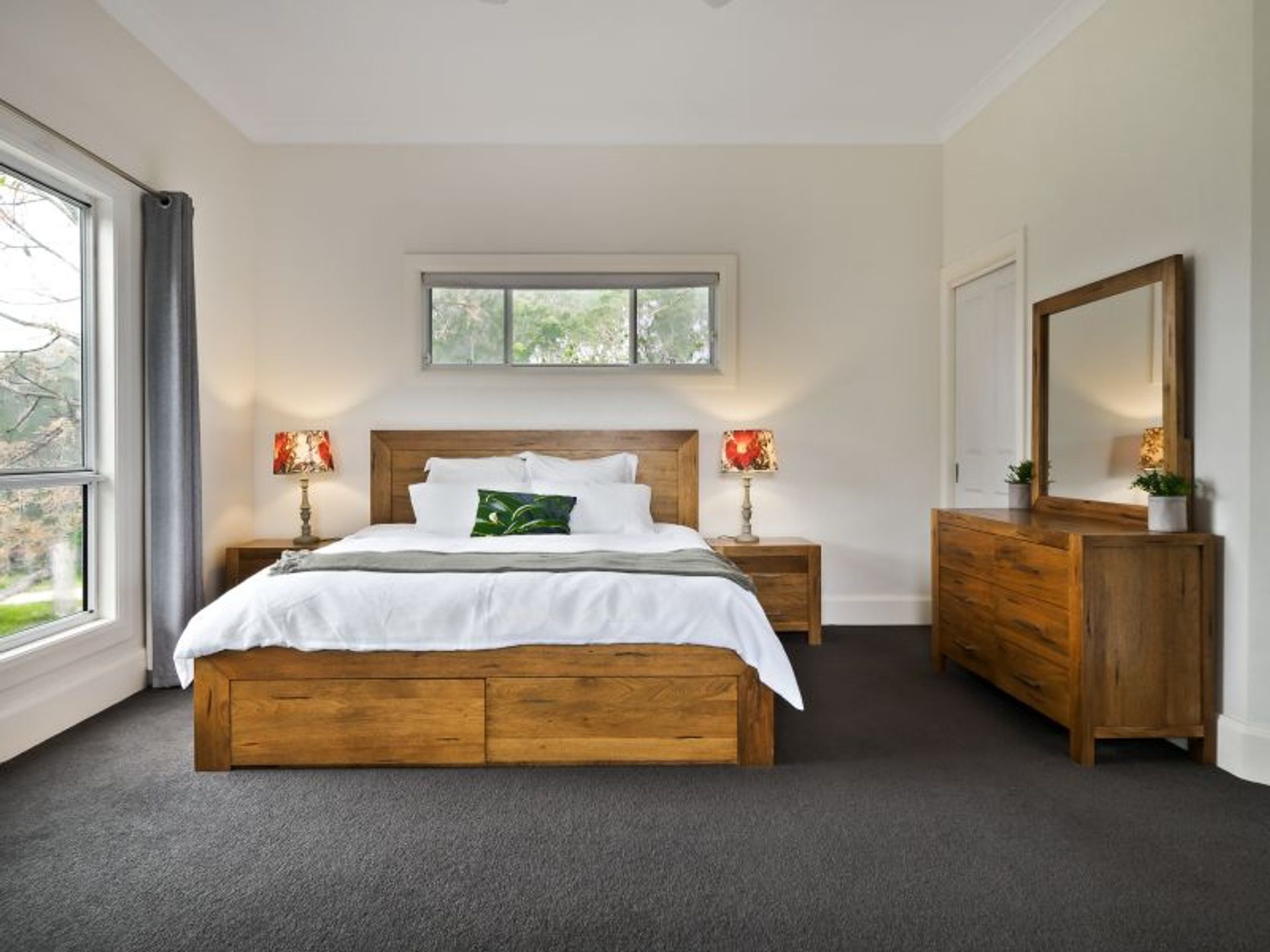 The main house has been meticulously renovated, featuring a modern kitchen with stone benchtops and an island bench overlooking the saltwater pool and the acreage beyond to Lorne Mountain.