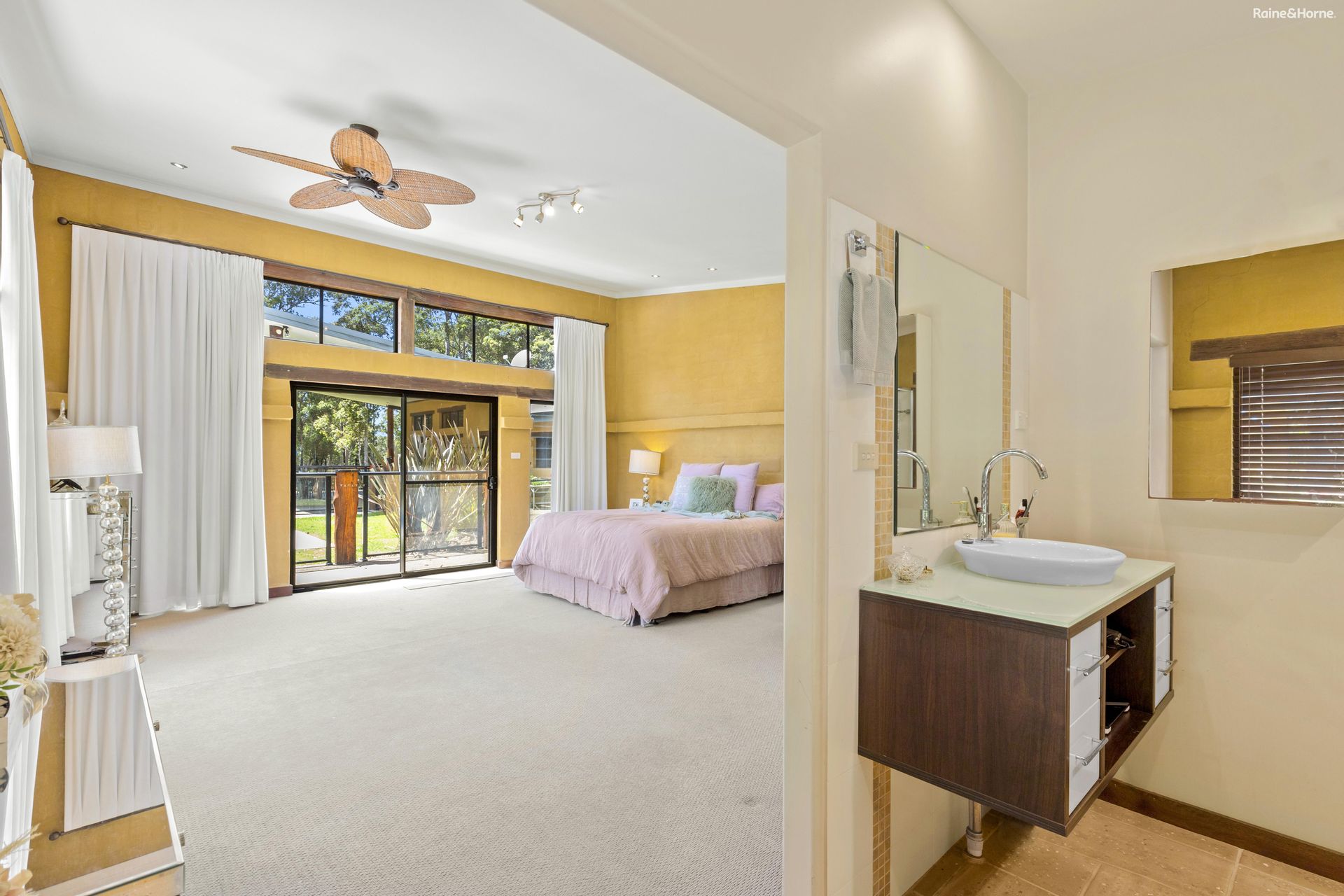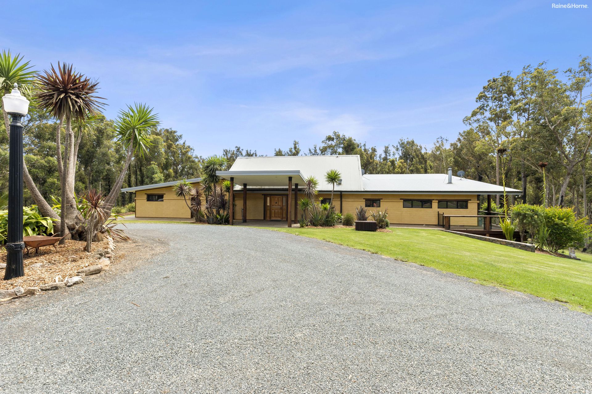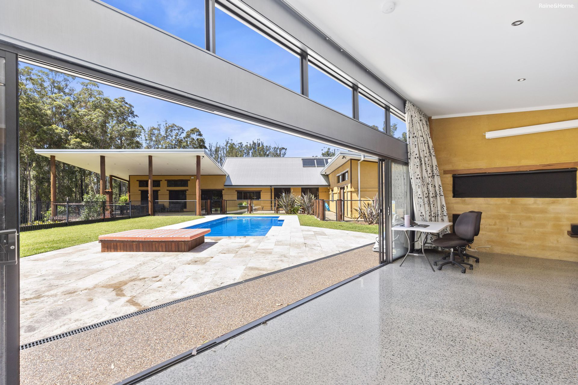 There is 240m2 of garaged/locked shedding with 3 bays with extra high ceilings with roller door access to hold the caravans, boats etc and the other shed has an air-conditioned office with running water and wood fireplace.