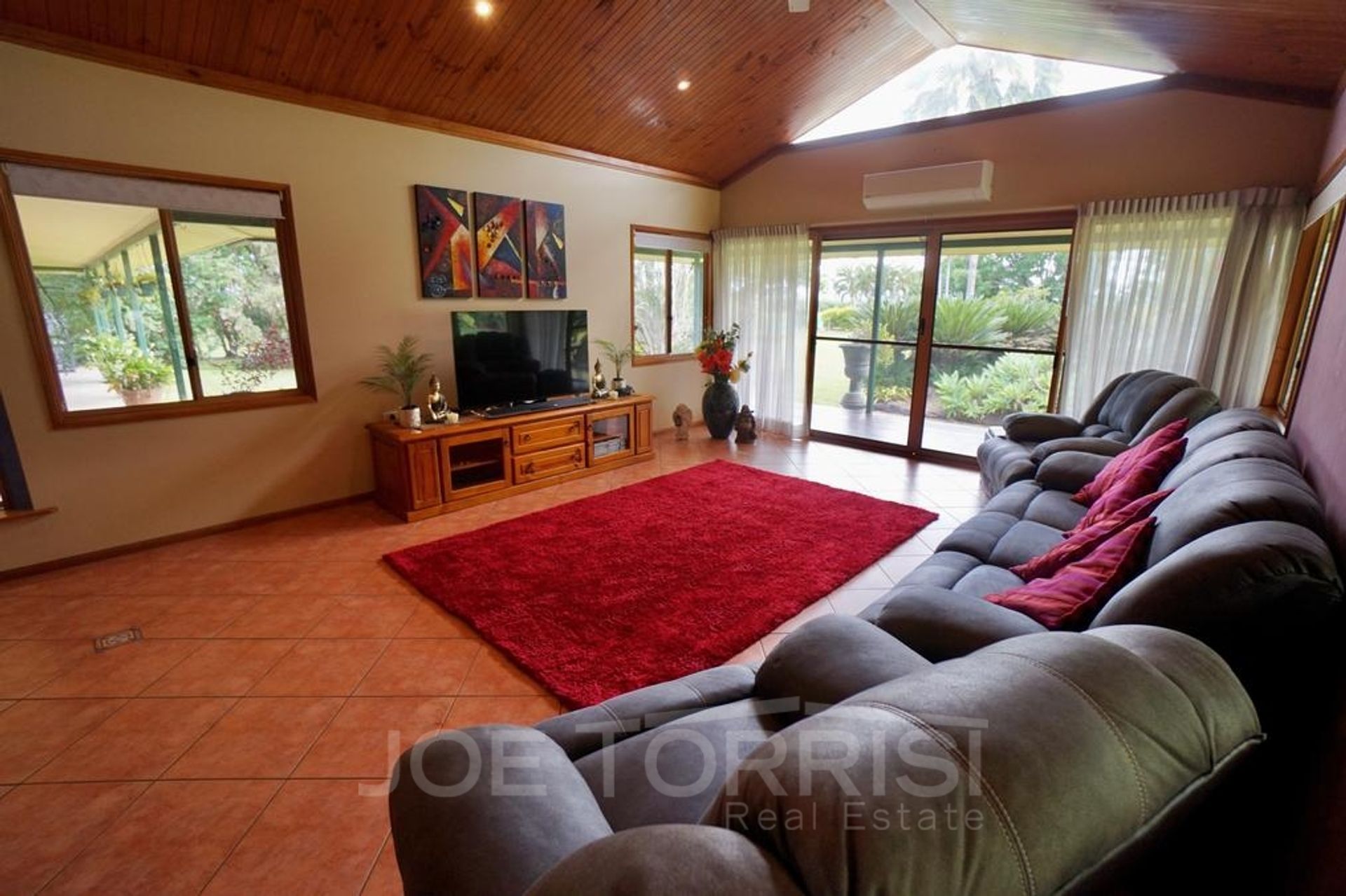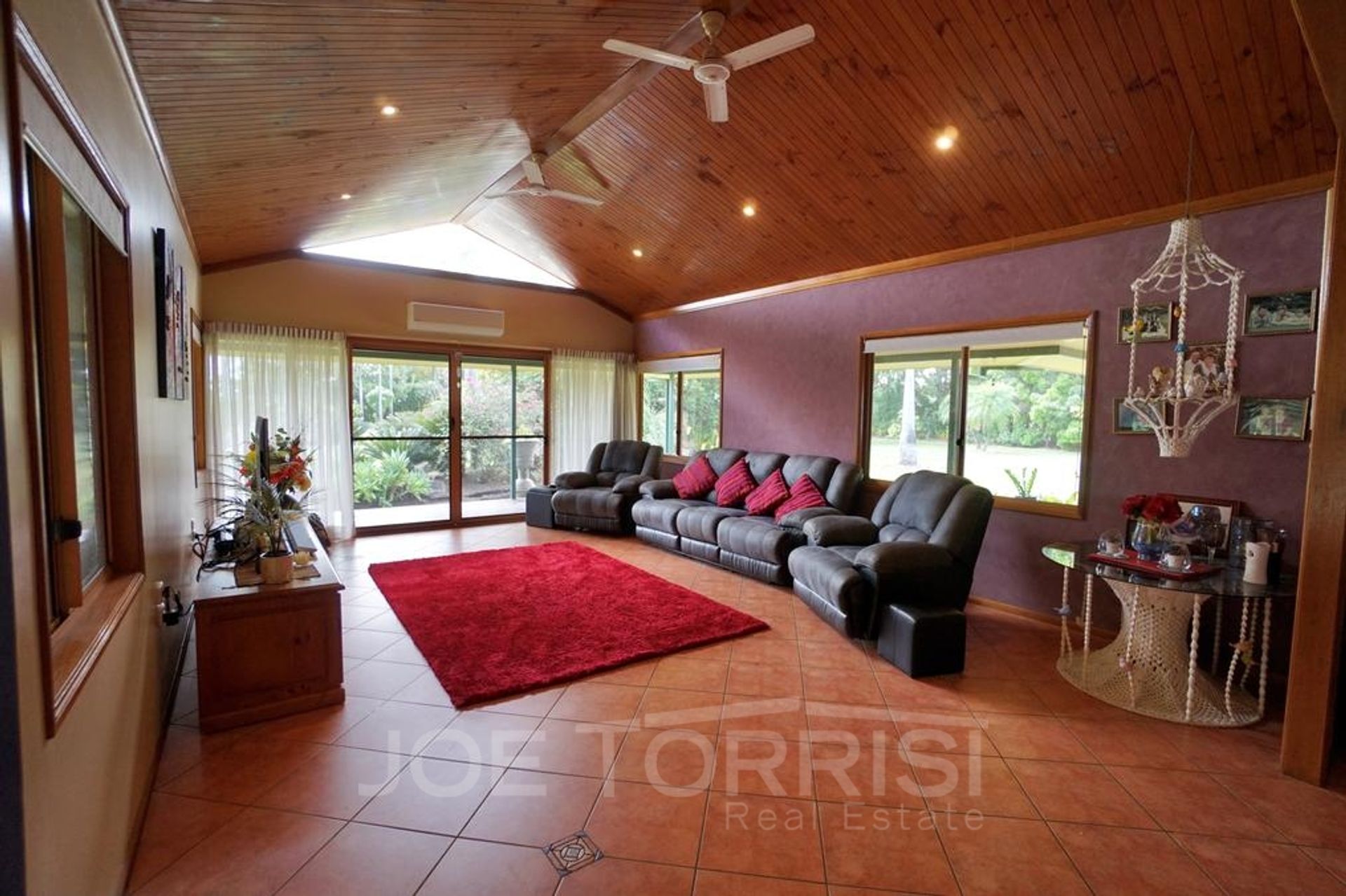 • Lounge/living area with stunning timber raked ceiling & sliding doors leading out to a timber deck