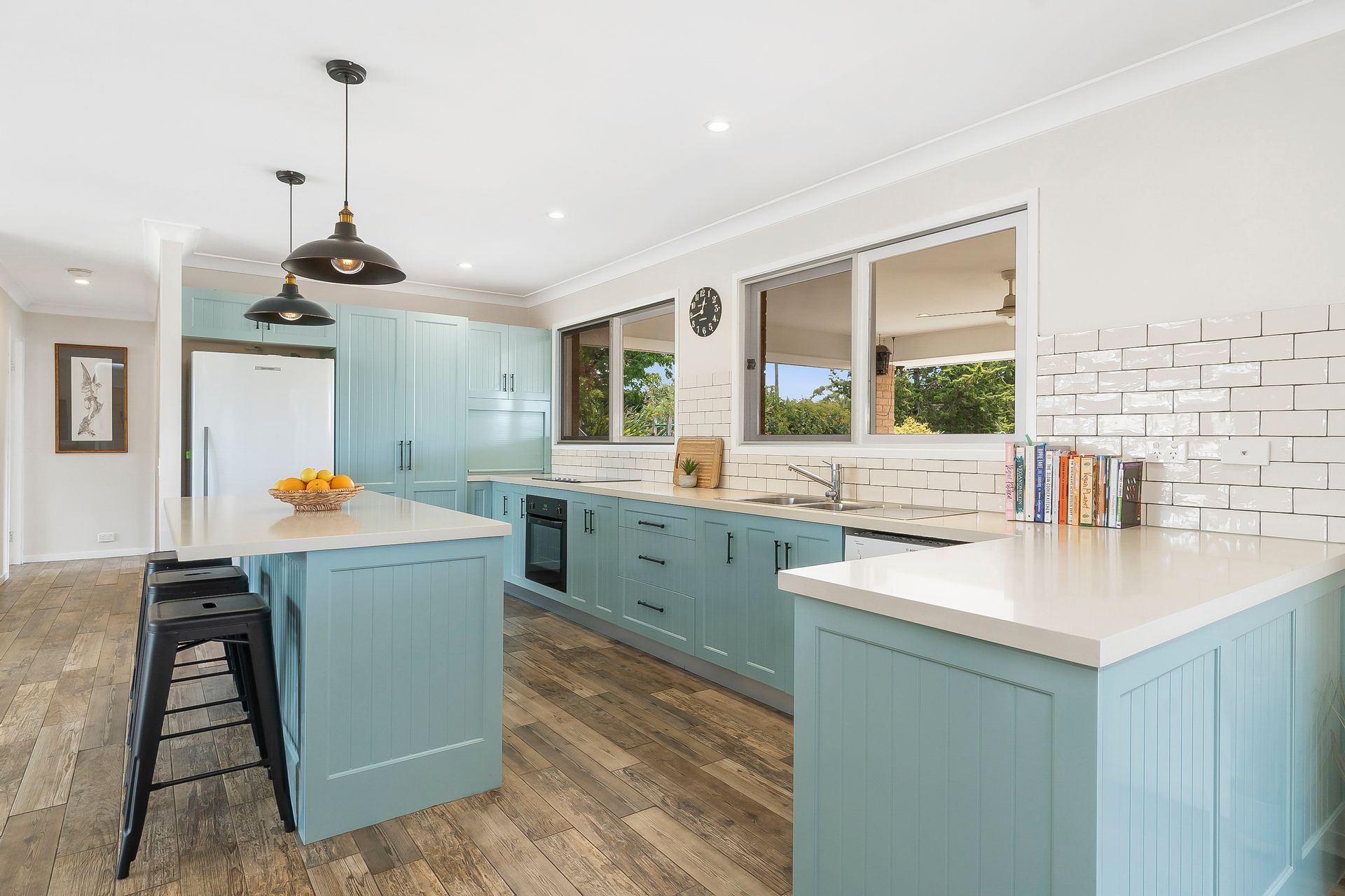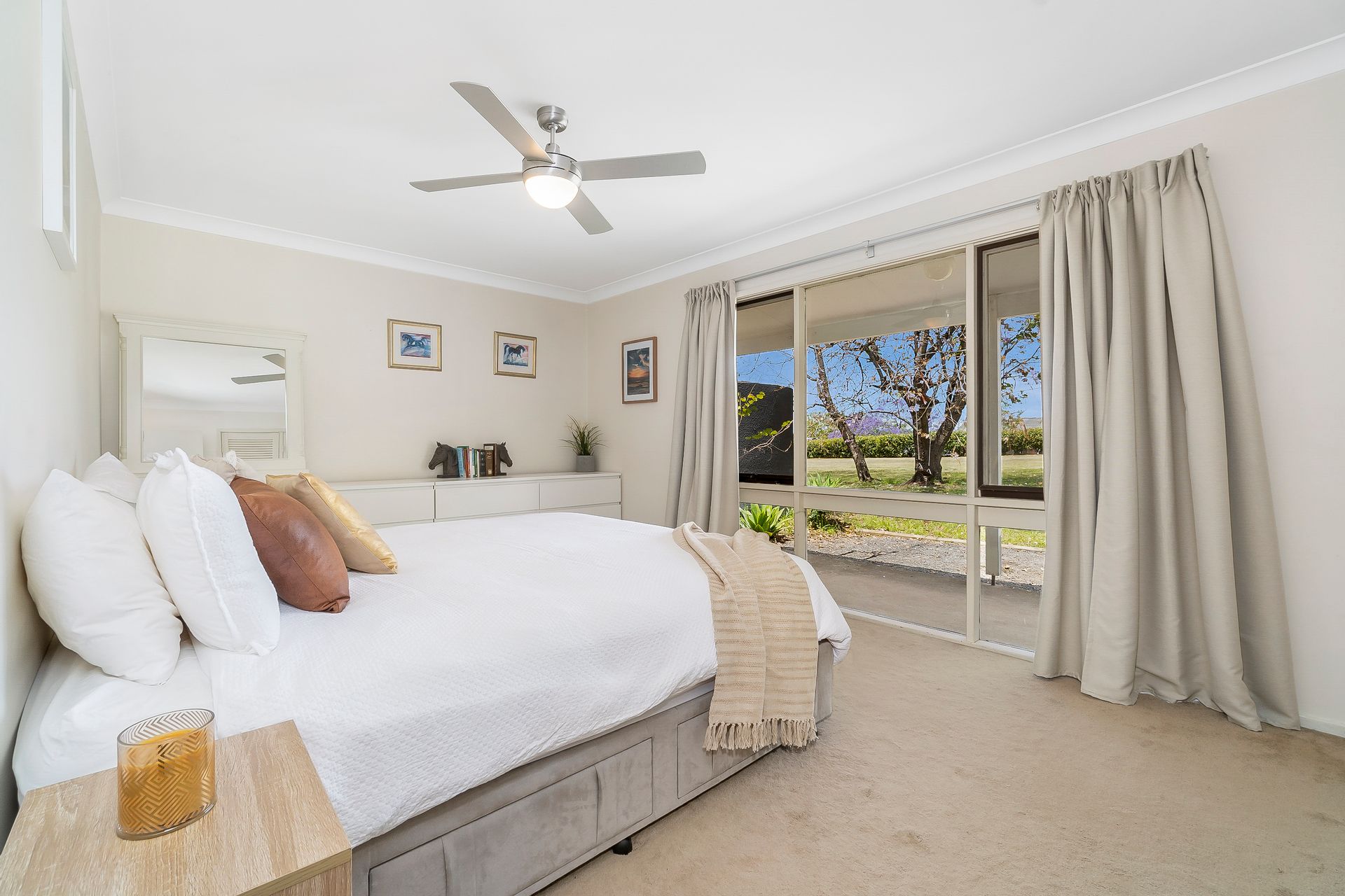 • Timber look floor tiles in the living spaces and ceiling fans throughout