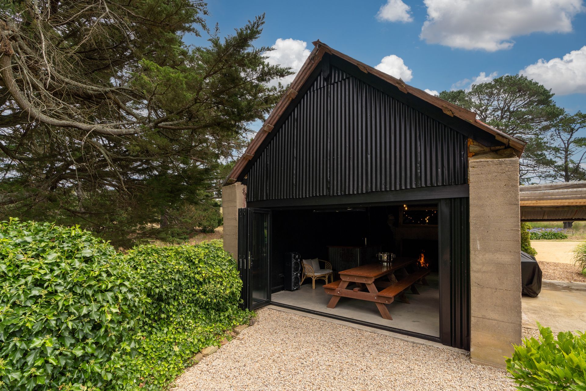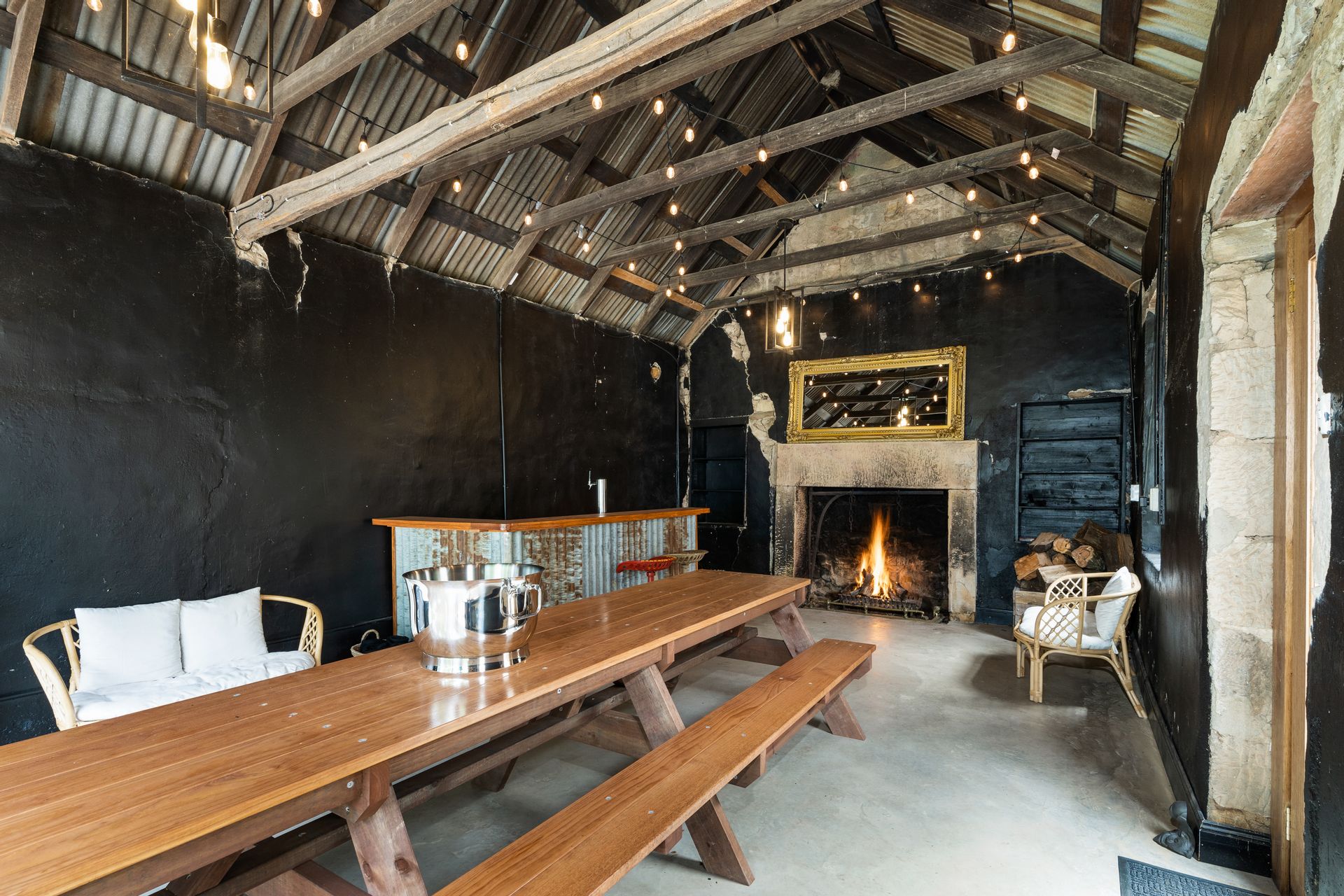 Separate to the main home, but very accessible is the fabulous games / recreation / bar room with concrete floor, massive open fire and bi-fold doors that bring the yard space into the room.