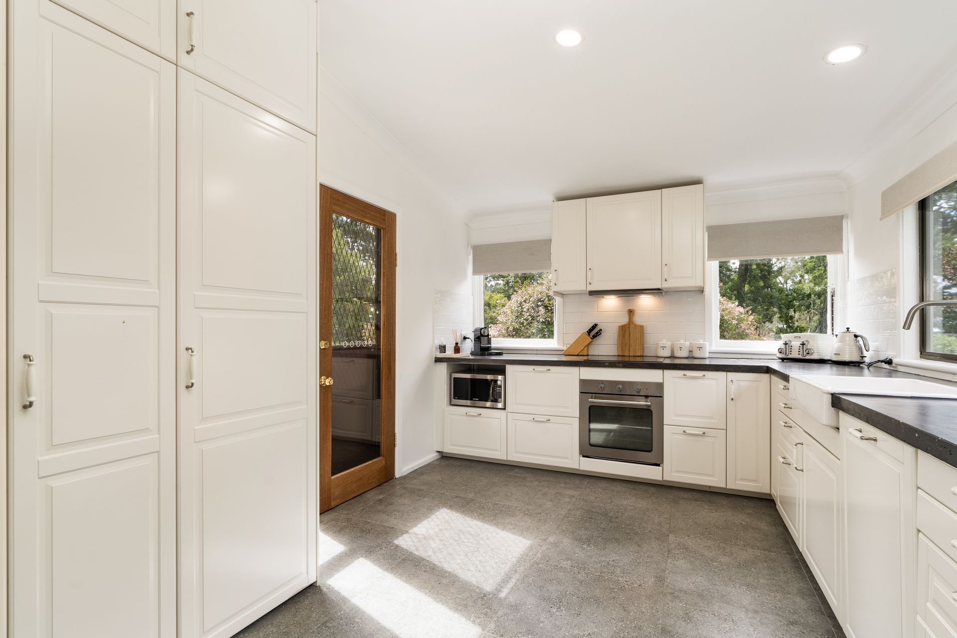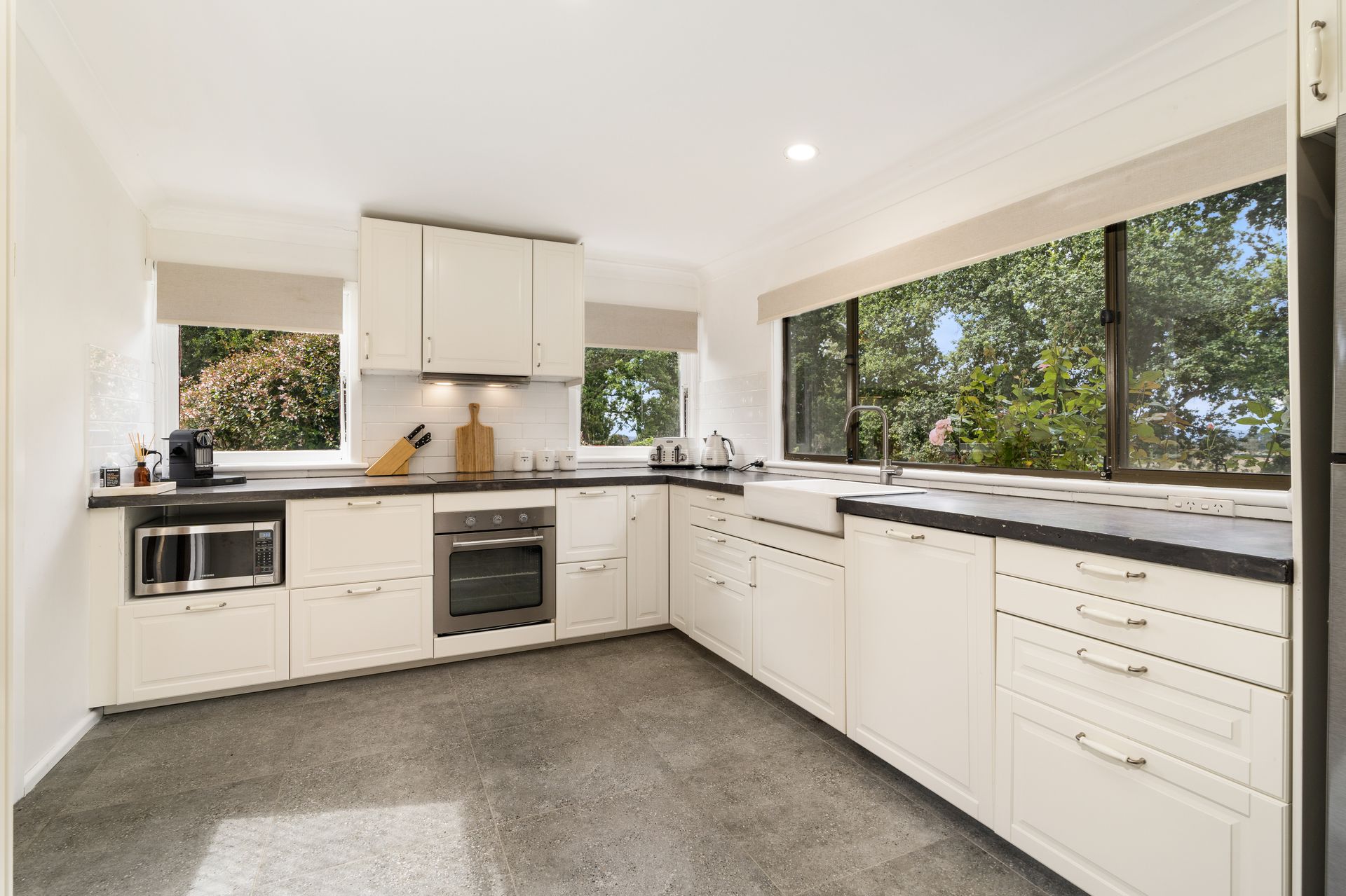 The kitchen has been completely updated also with new stainless steel appliances, chic concrete bench and an uninterrupted outlook across the sprawling house gardens.