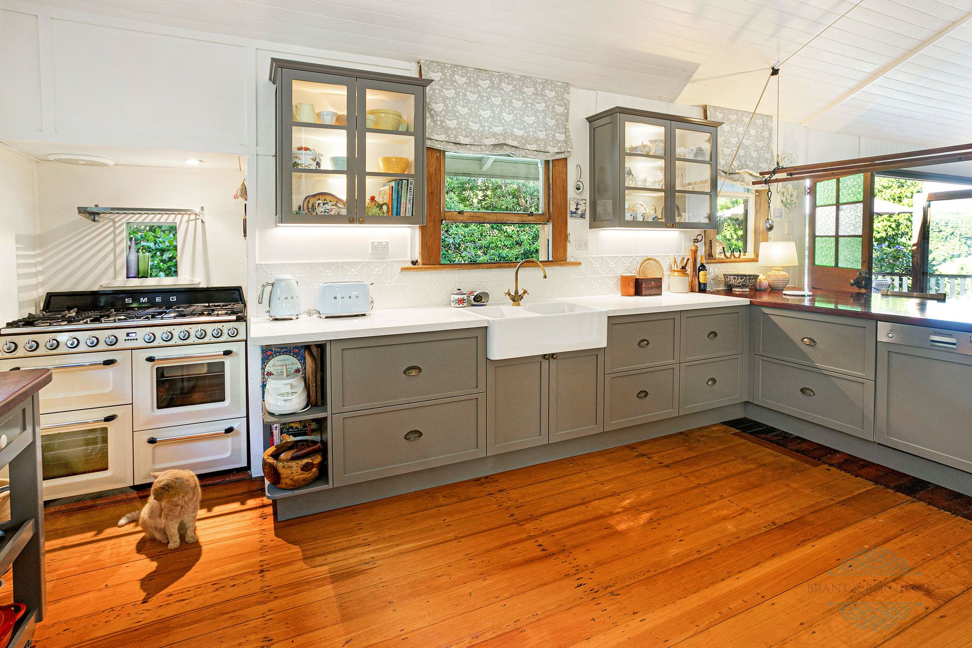 - The country kitchen has been recently renovated in keeping with the style of the home and features shaker style cabinetry, vintage look 1200mm SMEG upright stove with gas cooktop, stunning Rose Gum feature bench top as well as grey marbled stone tops, integrated dishwasher, double white ceramic sink, glass feature cabinets, embossed, pressed metal look tile splash back plus pantry with coffee nook