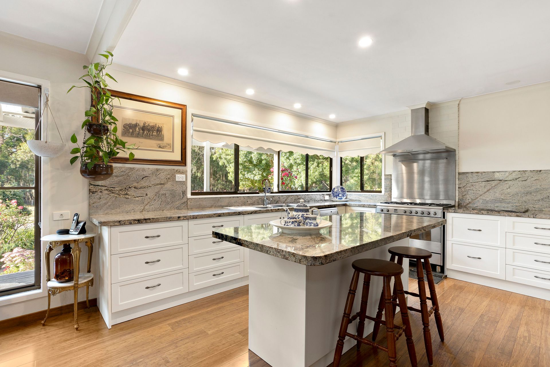 The beautifully renovated country-style kitchen with granite benchtops, double oven with gas hotplates and electric oven, double sink, dishwasher and large island bench opens onto the spacious dining and living areas, providing lots of flexible space and light, the home has a large split system, ceiling fans and Jindara wood fire heater for year-round comfort.