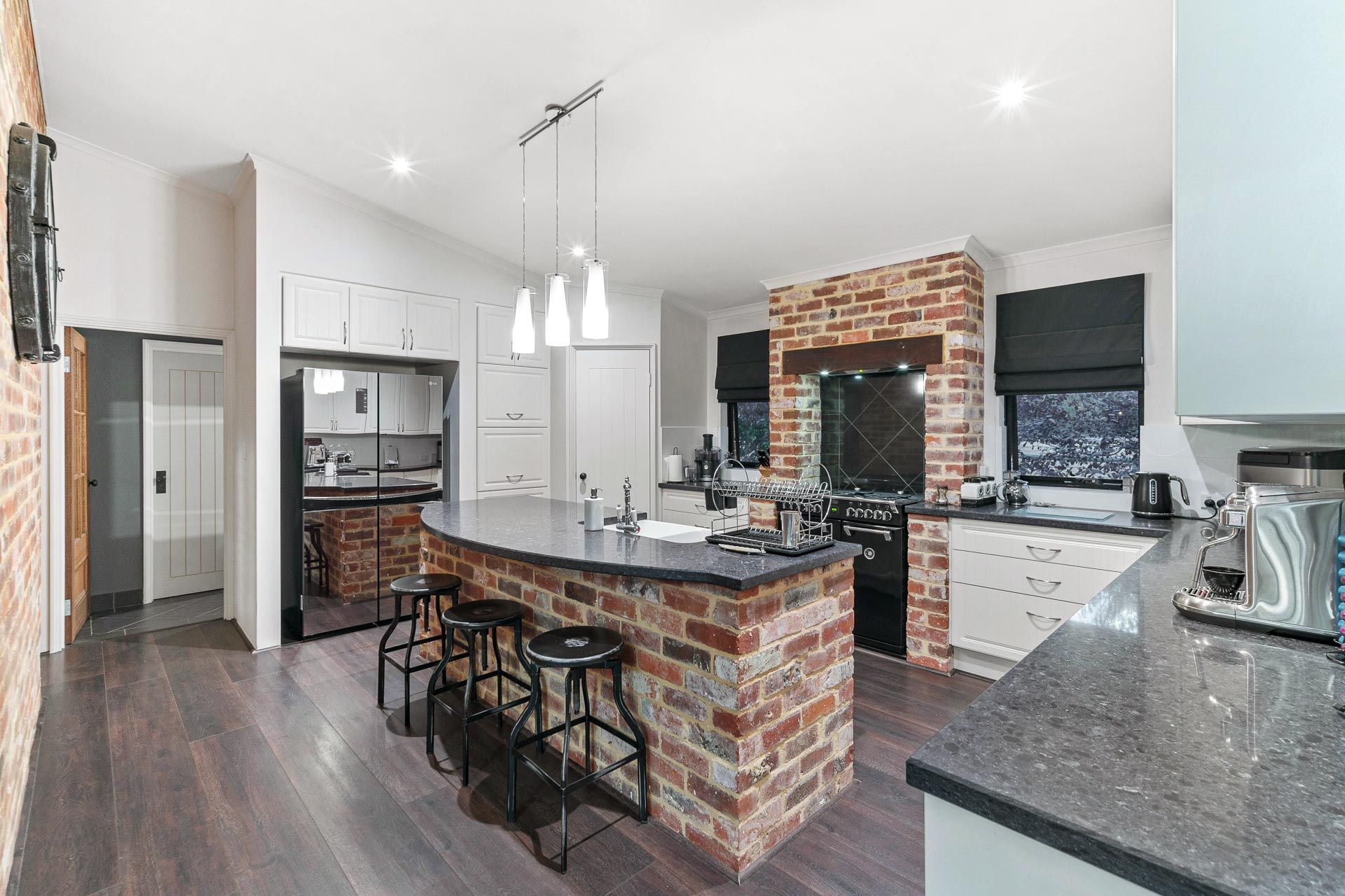 This home epitomises that charming, country chic look without even getting close to 'shabby' territory. Vaulted ceilings, bold feature wallpaper, exposed brickwork, big windows, home office, chandeliers, and fireplaces are just some of the features tying the style together. There's plenty of modern touches too, for maximum comfort and convenience, and the immaculate presentation makes this feel like a new home. At the heart is the kitchen with its beautiful curved breakfast bar and - best of all - a Belling cooker to make mealtimes a pleasure.