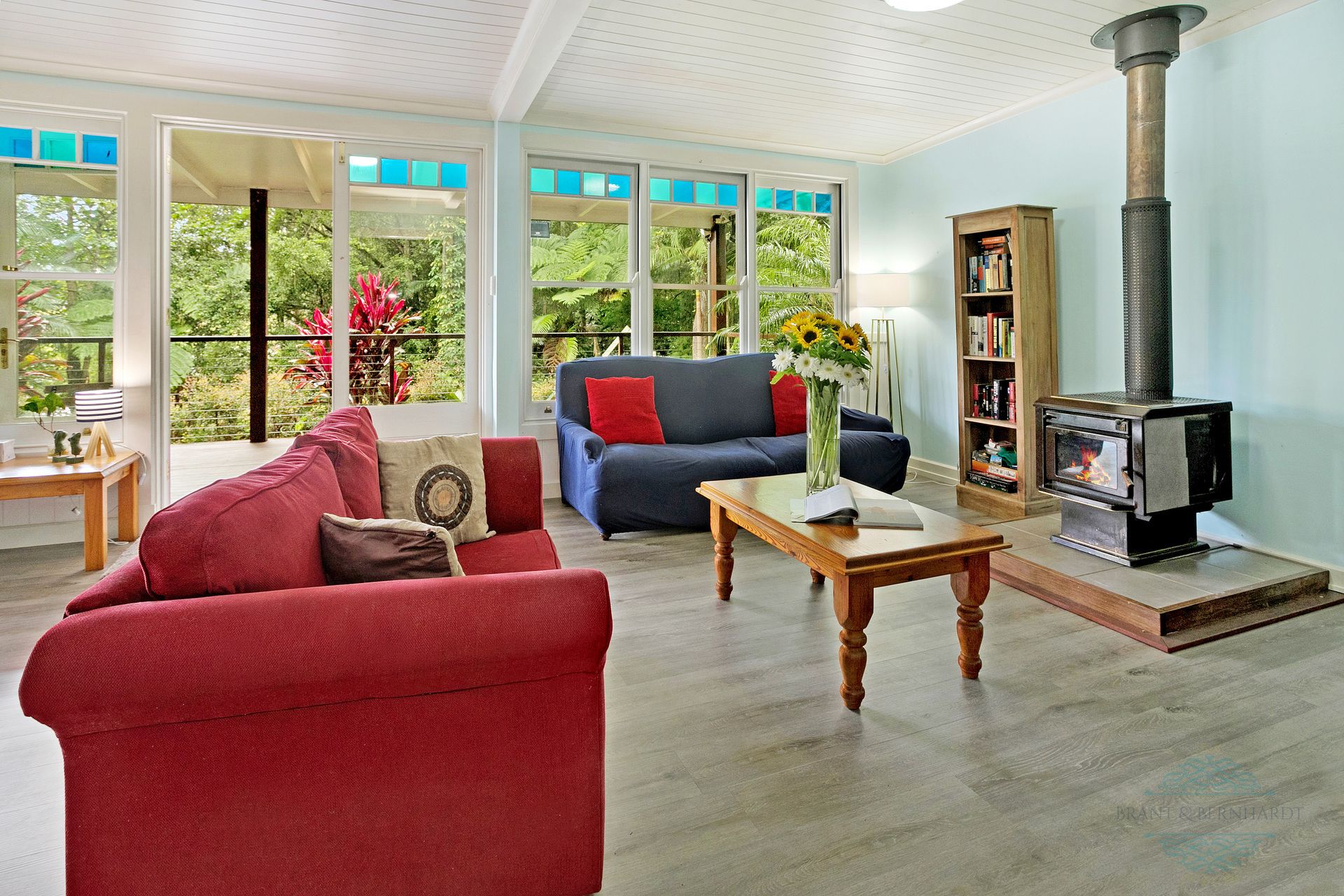 - Large open plan living/dining room with two sets of French doors to the North facing verandah, coloured glass feature windows, VJ ceilings, part VJ walls with picture rail features, cosy fireplace and split system air con plus views over the lake