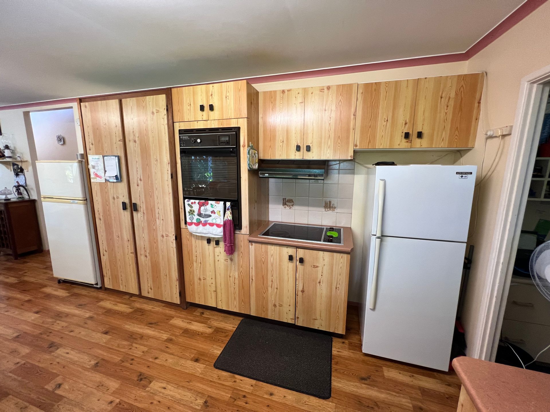 At the rear of the home is a huge open plan kitchen dining room which is big enough to accommodate a large family gathering. The kitchen has electric cooktop and wall oven, plenty of cupboards, and space for two fridges. Off the kitchen is an extra-large study with built in benches and pigeonholes for storage.
