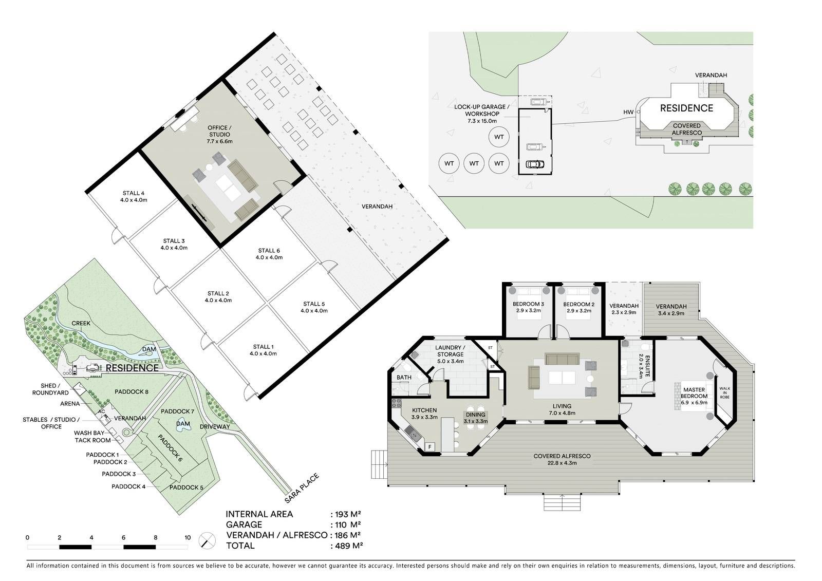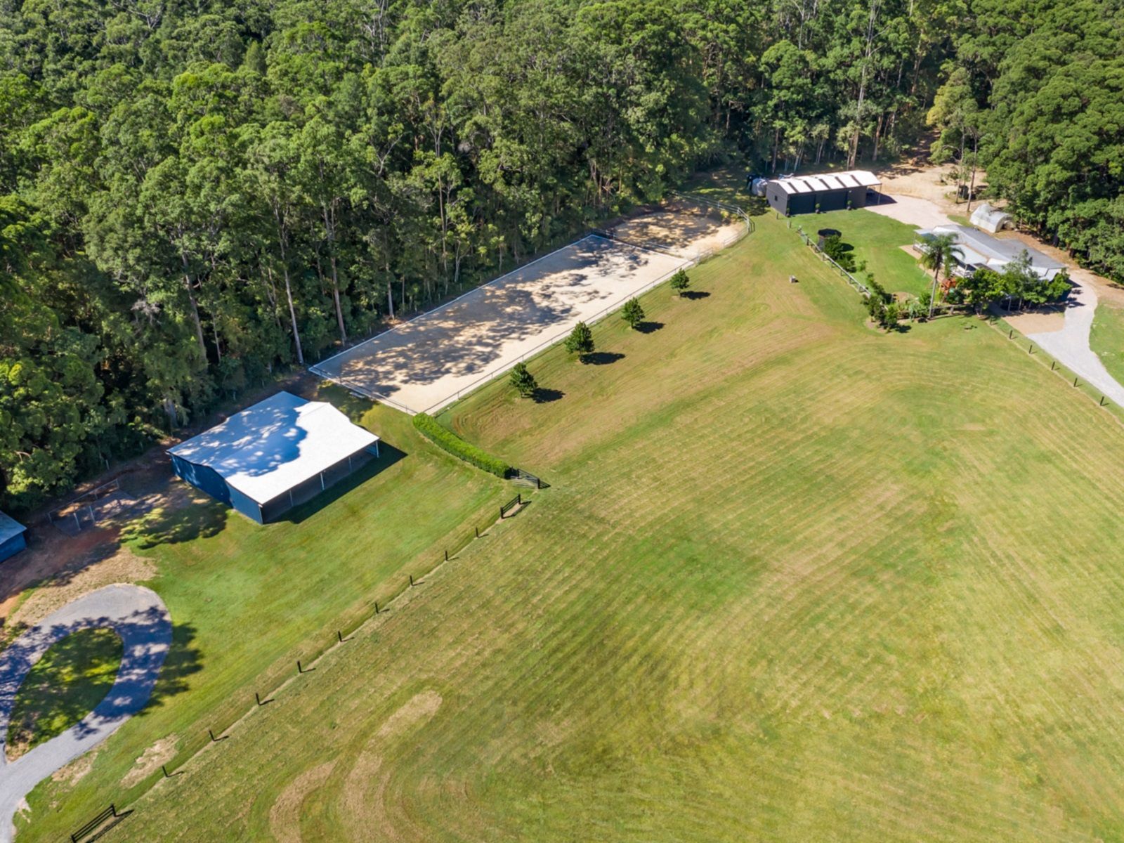 8 fenced paddocks, 60 x 20m sand arena plus 20 x 20m round yard, stable block of six with wash bay, shedding and adjoining studio