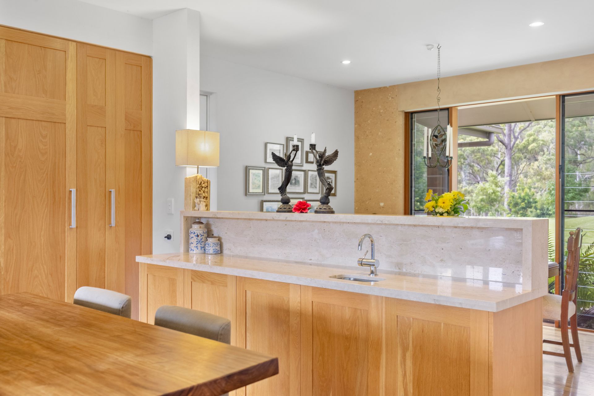 • A beautiful rammed earth feature wall meets you as you enter the home, almost if is is suspended off the spectacular blackbutt timber flooring that features throughout the home, framed elegantly by the soaring windows beyond of the formal lounge, effortlessly situated with the spectacular forestry beyond