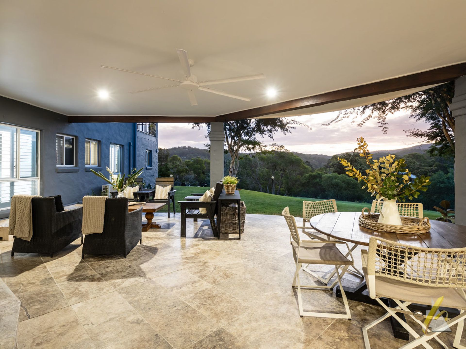 • Doors sweep open to the substantial covered entertainer's terrace with fan and magical views, canteen window from the kitchen