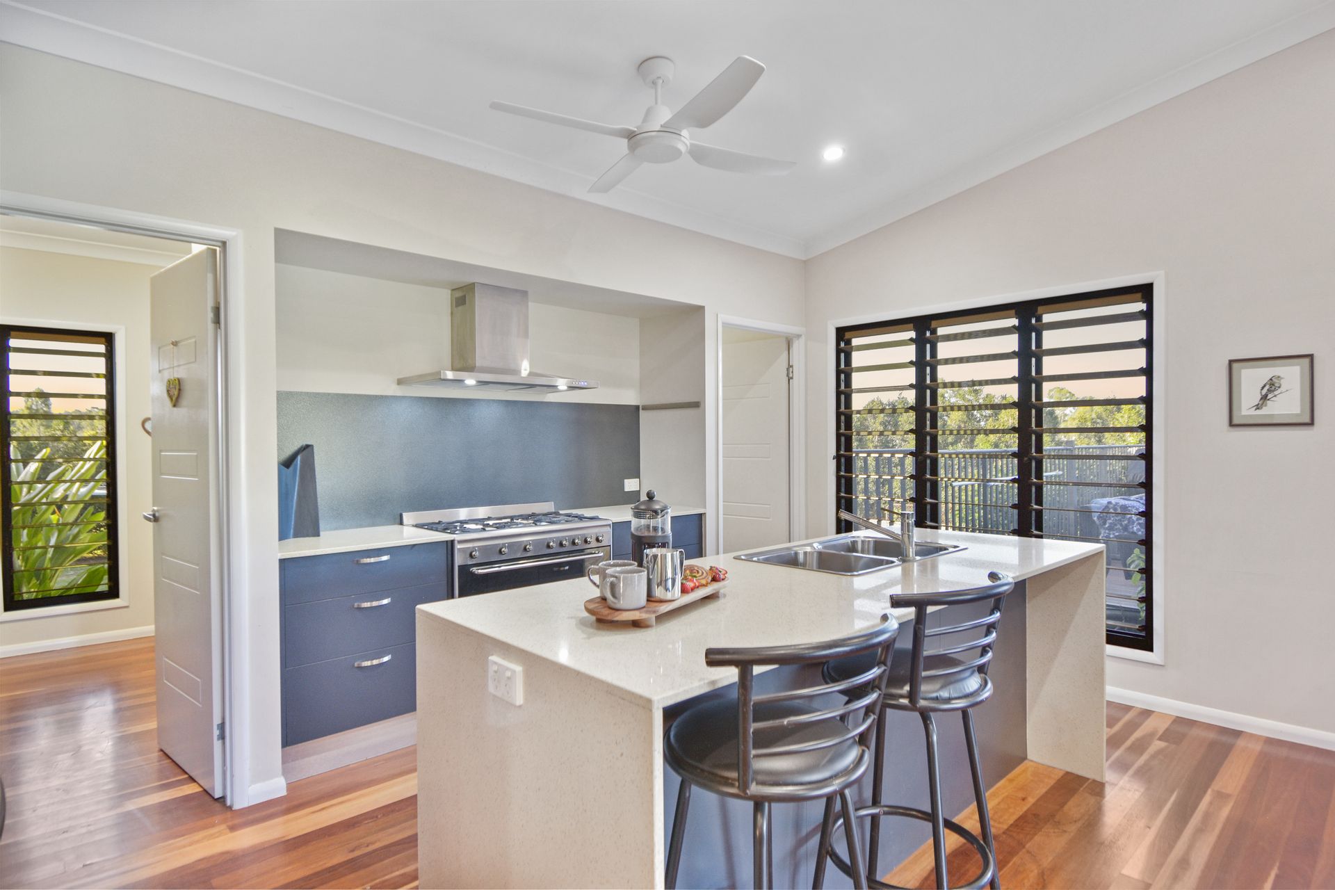 The kitchen is the heart of the home and with huge banks of louvers on the eastern wall, you'll enjoy experiencing cool breezes off of Cleveland Bay as you cook. There is a waterfall stone bench with a four-seat breakfast bar as well as a professional gas stove which will suit the fussiest of chefs. You'll also find space for a large plumbed fridge, clever cabinets to hide commonly used appliances and the most well laid-out pantry I've ever seen which features more bench space and another huge bank of drawers.