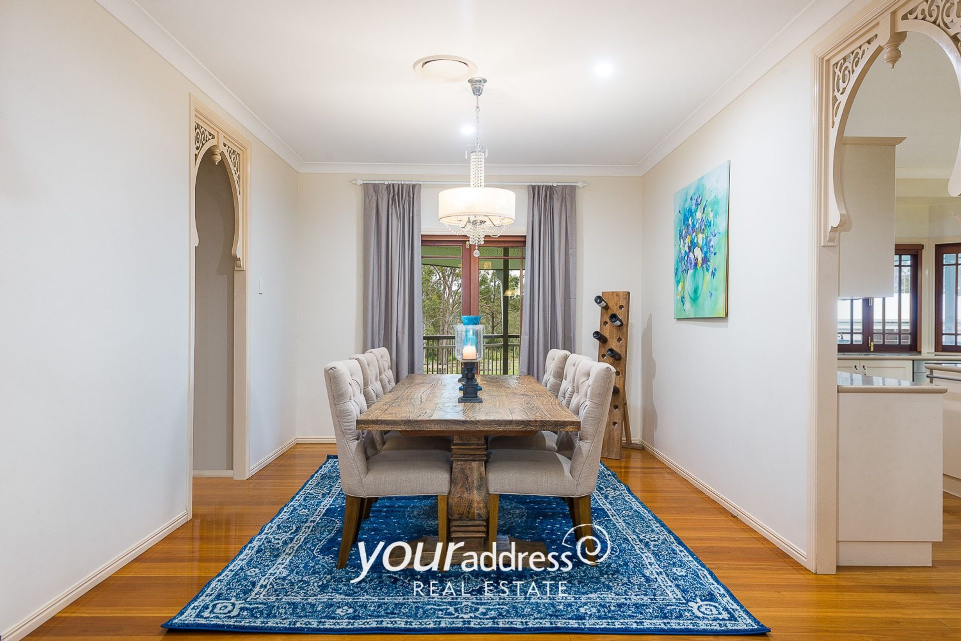 • Formal dining area with feature chandelier and gorgeous French doors opening onto the rear deck area